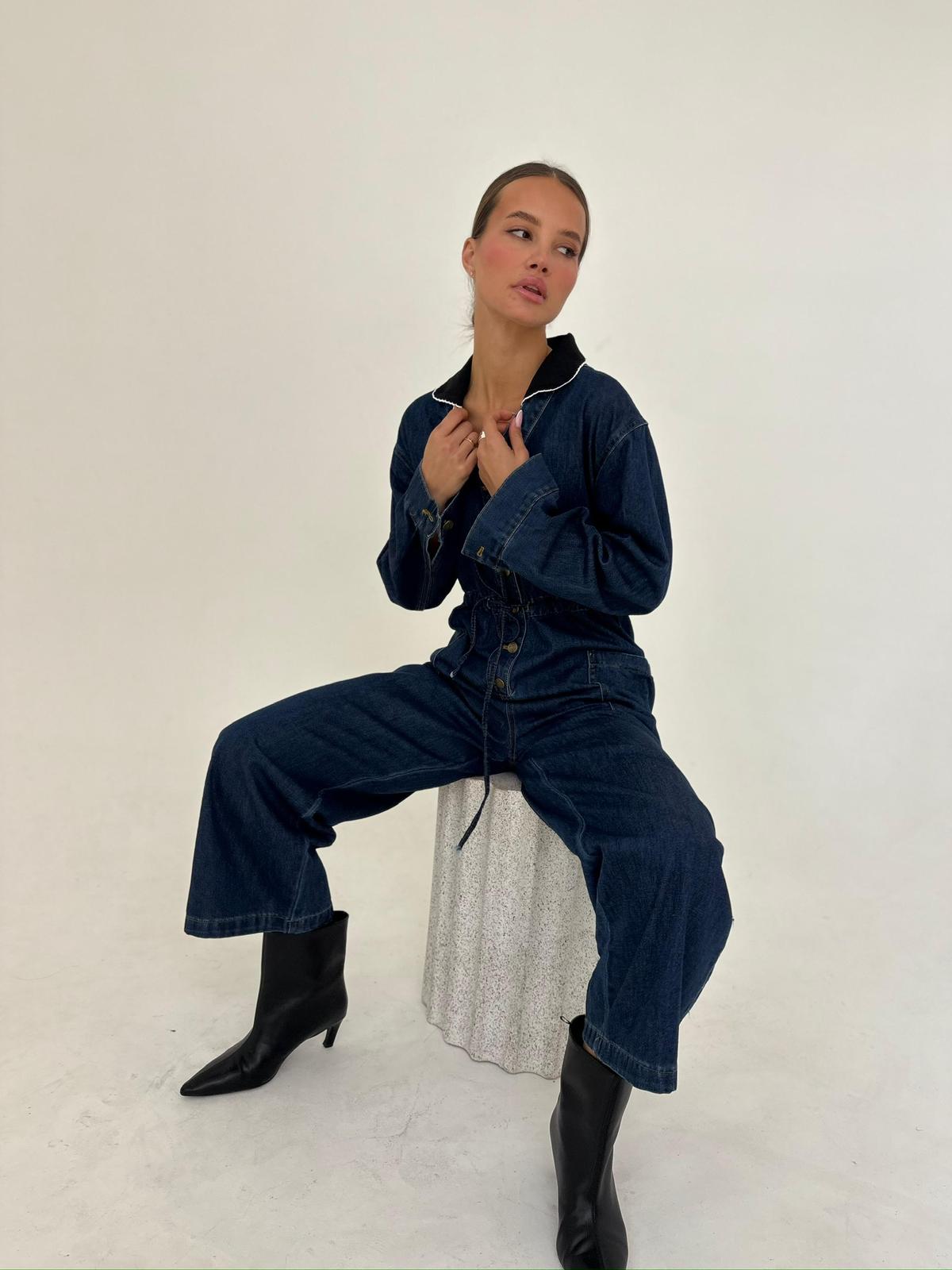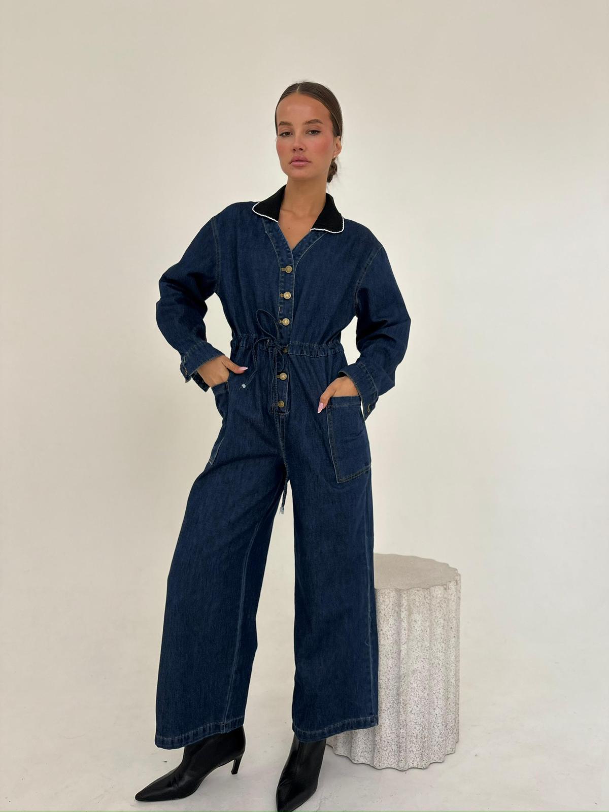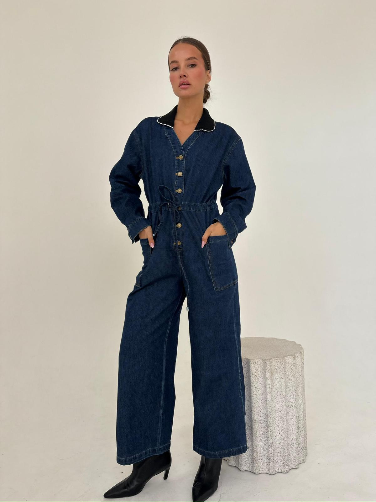 אוברול מבד ג'ינס , שרוולים ארוכים עם סיומת מנג'ט וכפתור לסגירה, צווארון שחור שילוב גומי, כיסים קדמיים, כפתורים קדמיים בשילוב רוכסן, כפלים קדמים, חגורה שרוך פנימי להידוק האוברול. מגיעה במידה אחת ONE SIZE ומתאימה עד למידה 42-44.
