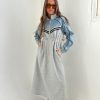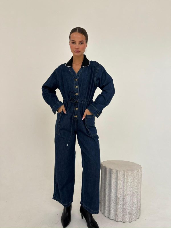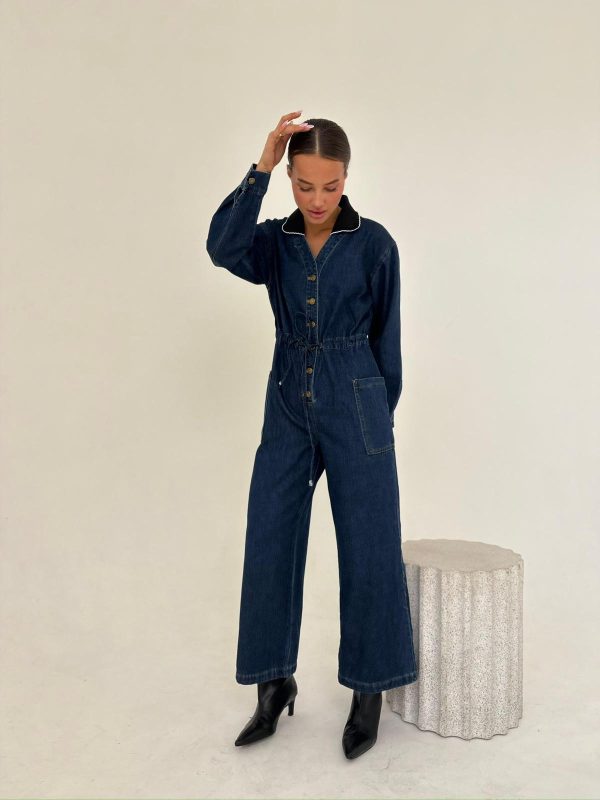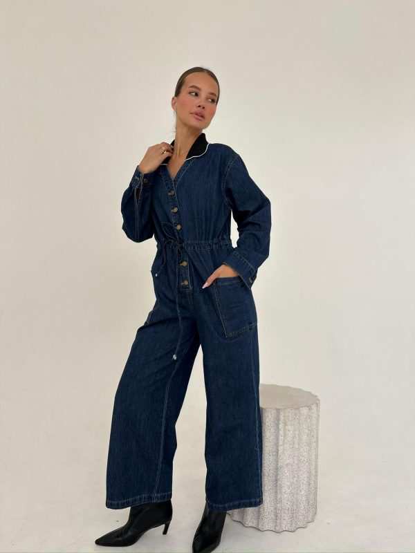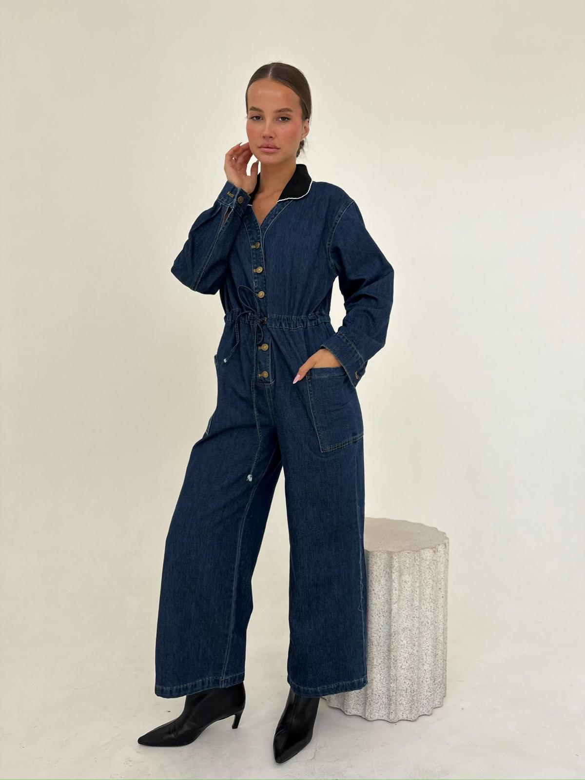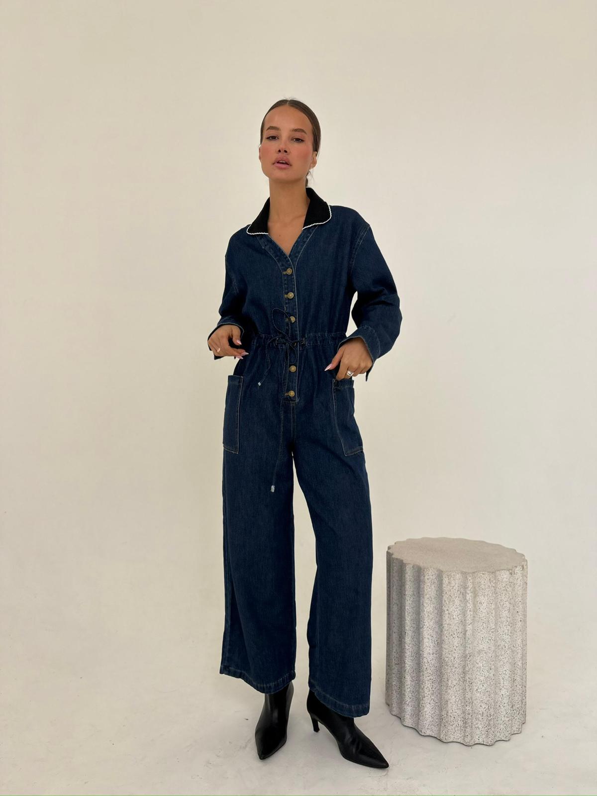 אוברול מבד ג'ינס , שרוולים ארוכים עם סיומת מנג'ט וכפתור לסגירה, צווארון שחור שילוב גומי, כיסים קדמיים, כפתורים קדמיים בשילוב רוכסן, כפלים קדמים, חגורה שרוך פנימי להידוק האוברול. מגיעה במידה אחת ONE SIZE ומתאימה עד למידה 42-44.