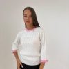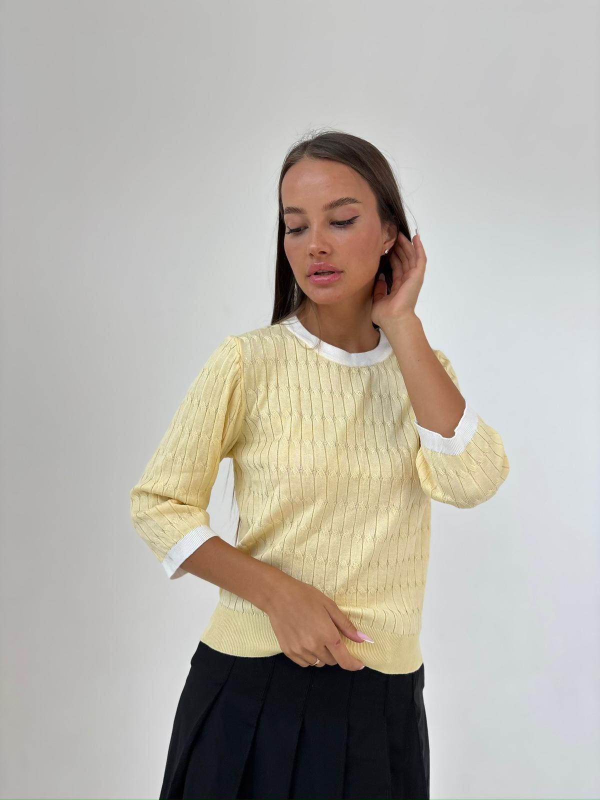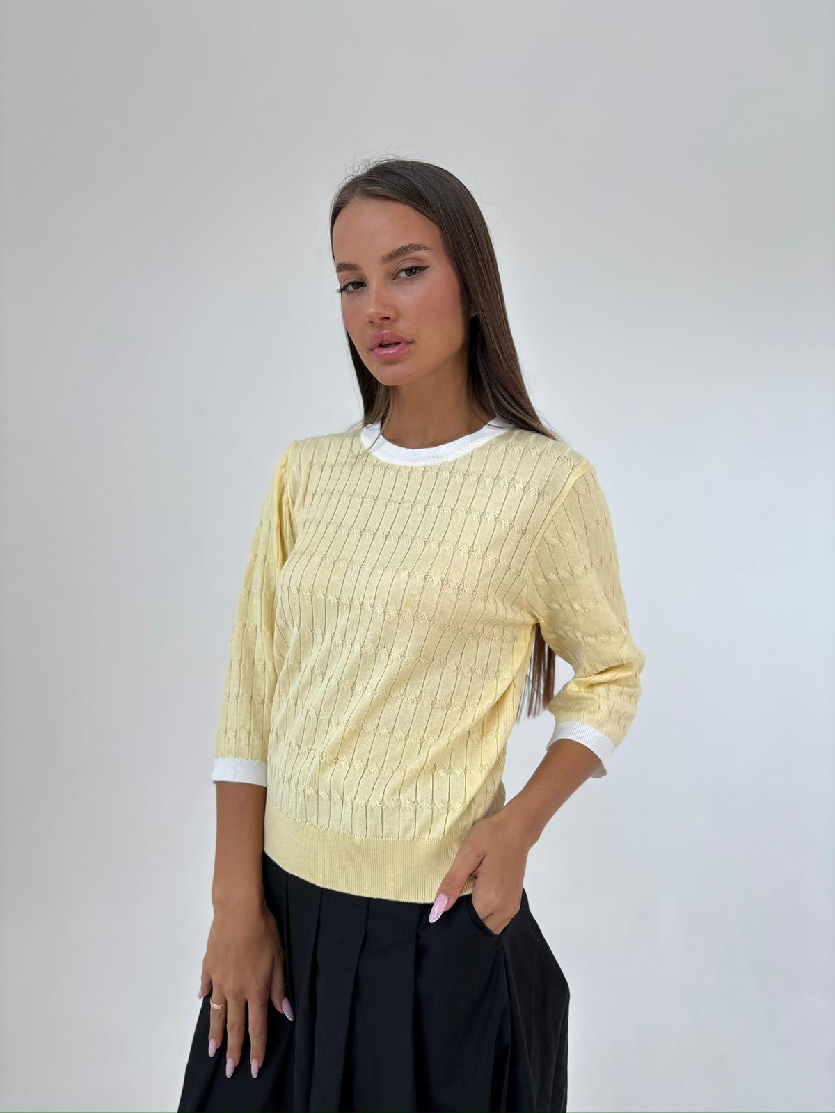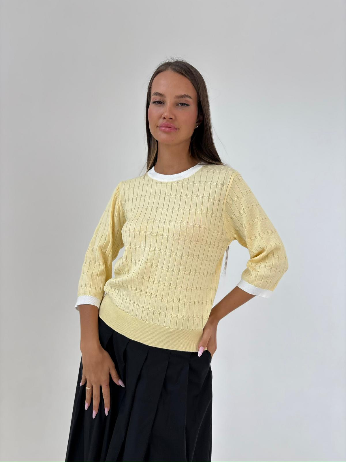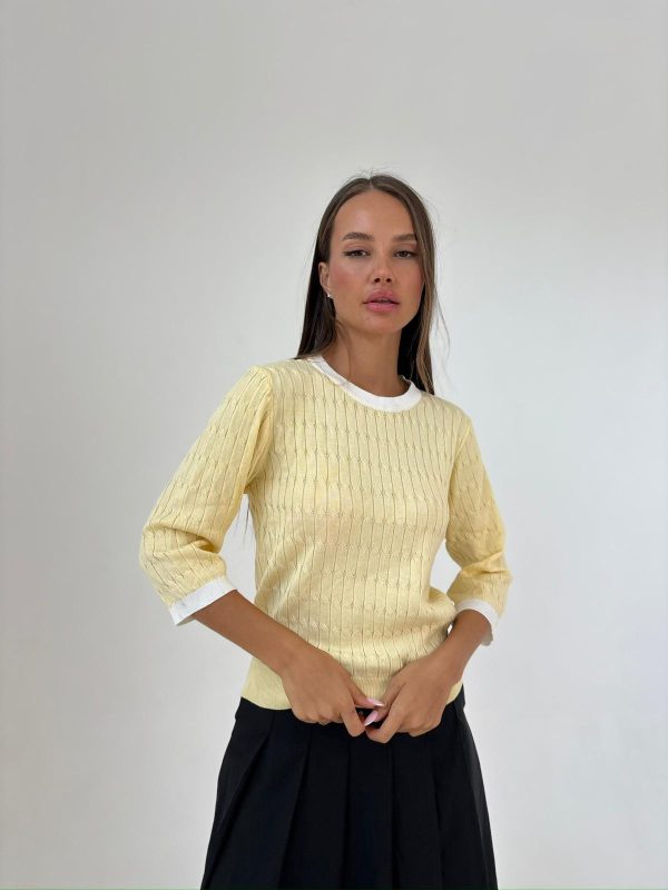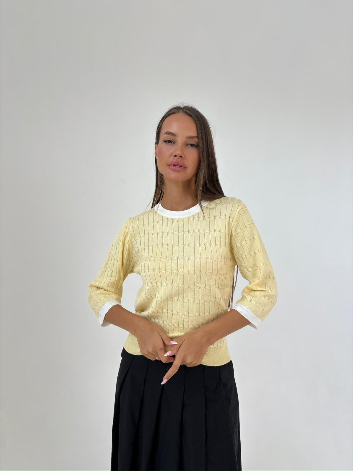 חולצה מבד סריג מעבר, מבד לייקרה נמתח , צווארון ניקי עגול שילוב, שרוולים באורך 3/4, שילוב מנג'ט בידיים ובחולצה. החולצה מגיעה במידה אחת ONE SIZE ומתאימה עד למידה 42-44.