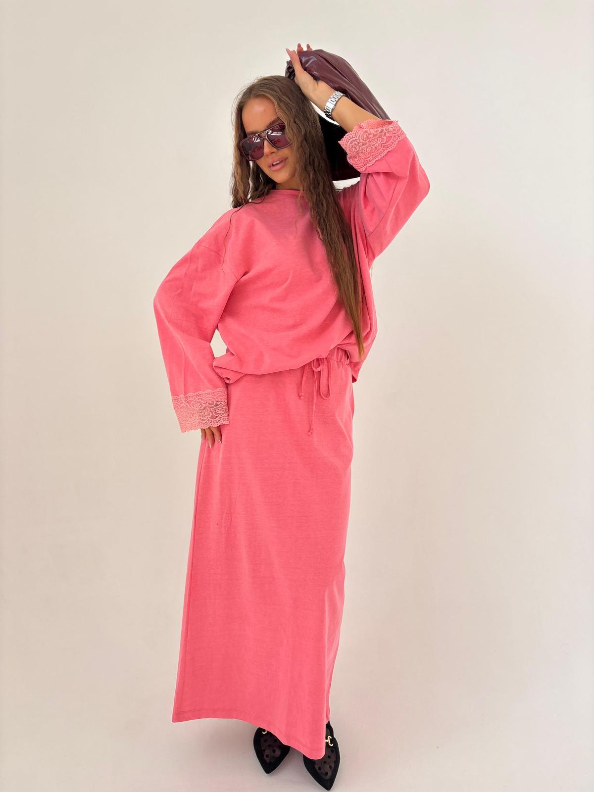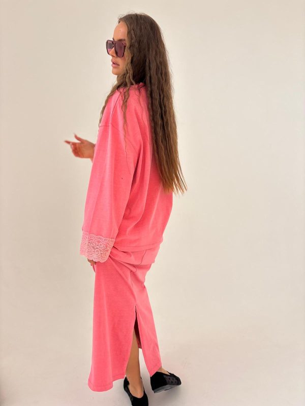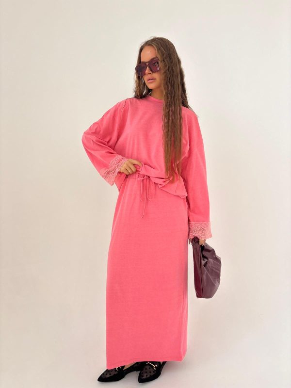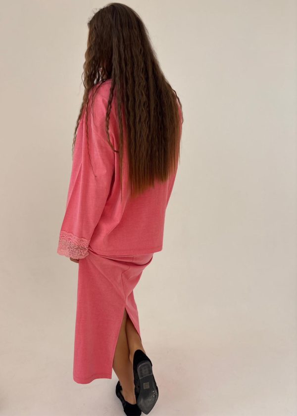 חליפת חצאית צנועה מבד כותנה סטון ווש בצביעה, חולצה בגיזרת אובר סייז עם צווארון עגול, שרוולים 7/8 עם סיומת תחרה בצביעה, חצאית בגיזרה ישרה עם גומי במותן, שרוך פנימי להידוק החצאית, כיסים ניסתרים בצידי החצאית. החליפה מגיעה במידות S/M/L/XL ומתאימה עד למידה 44-46/48.