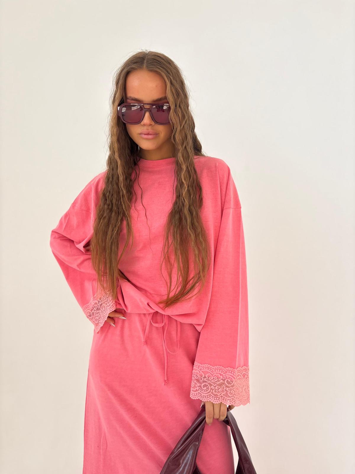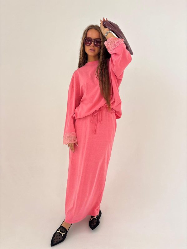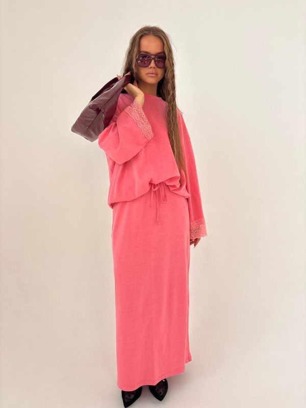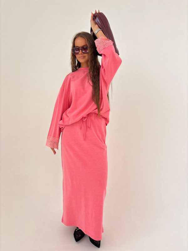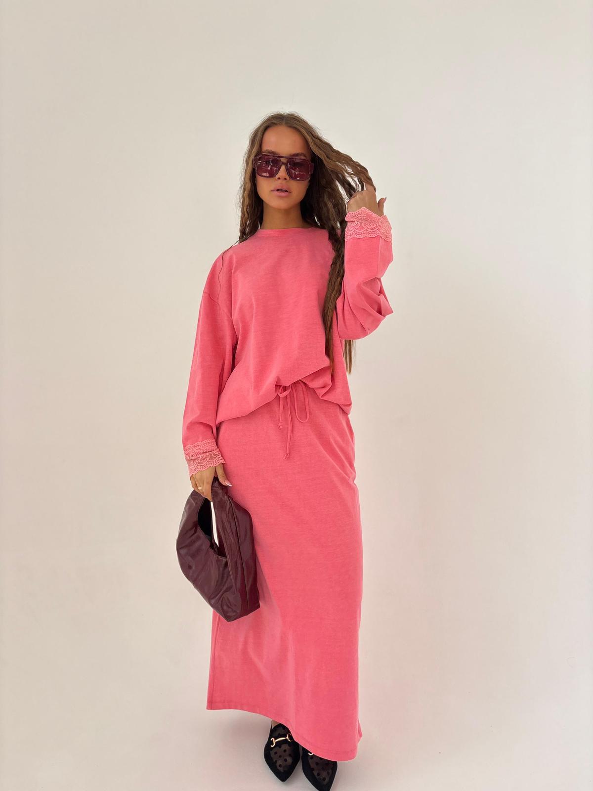 חליפת חצאית צנועה מבד כותנה סטון ווש בצביעה, חולצה בגיזרת אובר סייז עם צווארון עגול, שרוולים 7/8 עם סיומת תחרה בצביעה, חצאית בגיזרה ישרה עם גומי במותן, שרוך פנימי להידוק החצאית, כיסים ניסתרים בצידי החצאית. החליפה מגיעה במידות S/M/L/XL ומתאימה עד למידה 44-46/48.