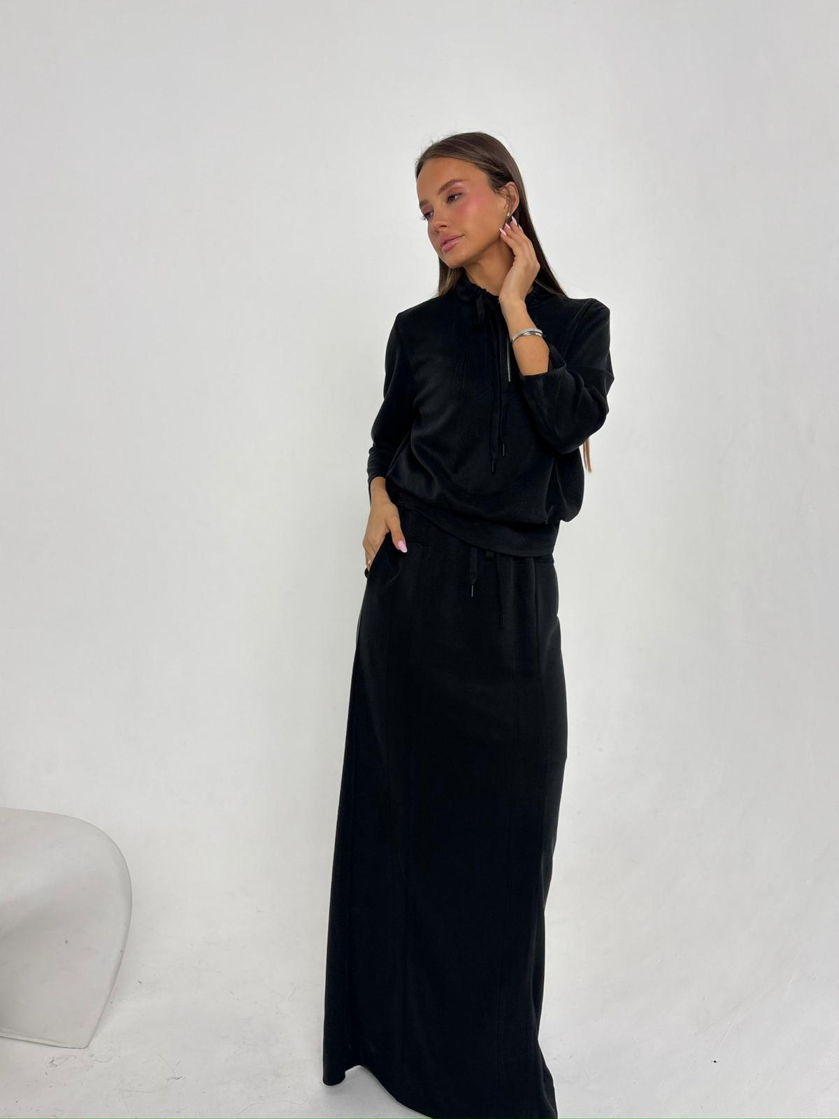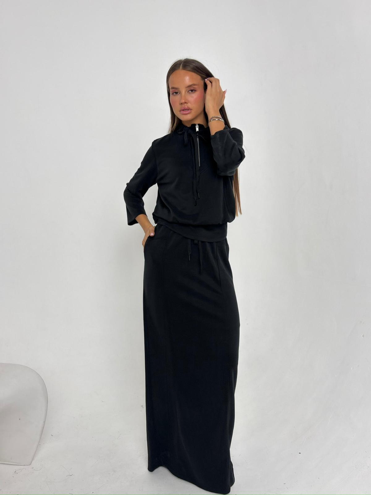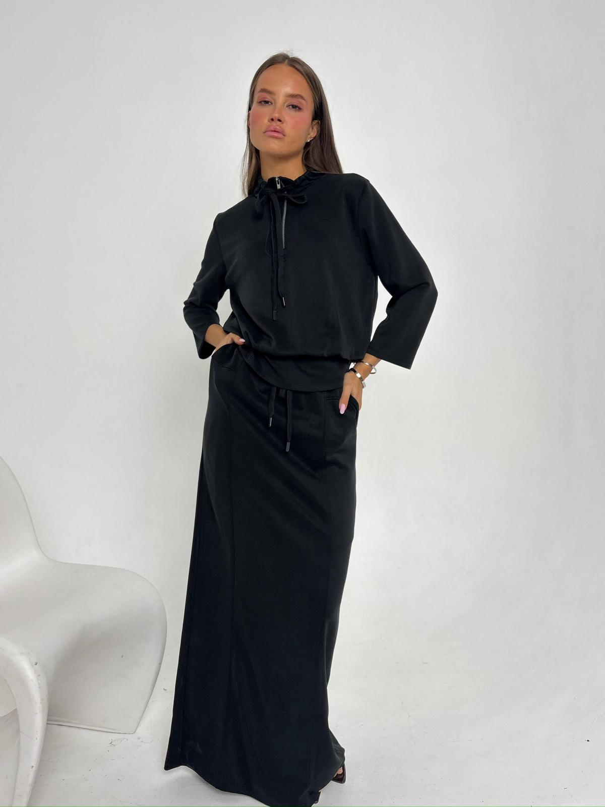 חליפת חצאית מבד ספורט לייקרה, חולצה בגיזרת אובר סייז עם ביטנה, שרוולים באורך 3/4, רוכסן קידמי, שרוך תואם בצווארון, חצאית ישרה באורך מקסי, גומי במותן החצאית עם שרוך פנימי תואם, כיסים בצידי החצאית. החליפה מגיעה במידות S/M/L ומתאימה עד למידה 42-44/46.