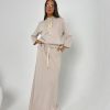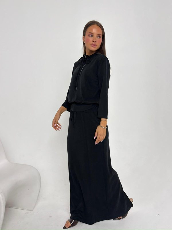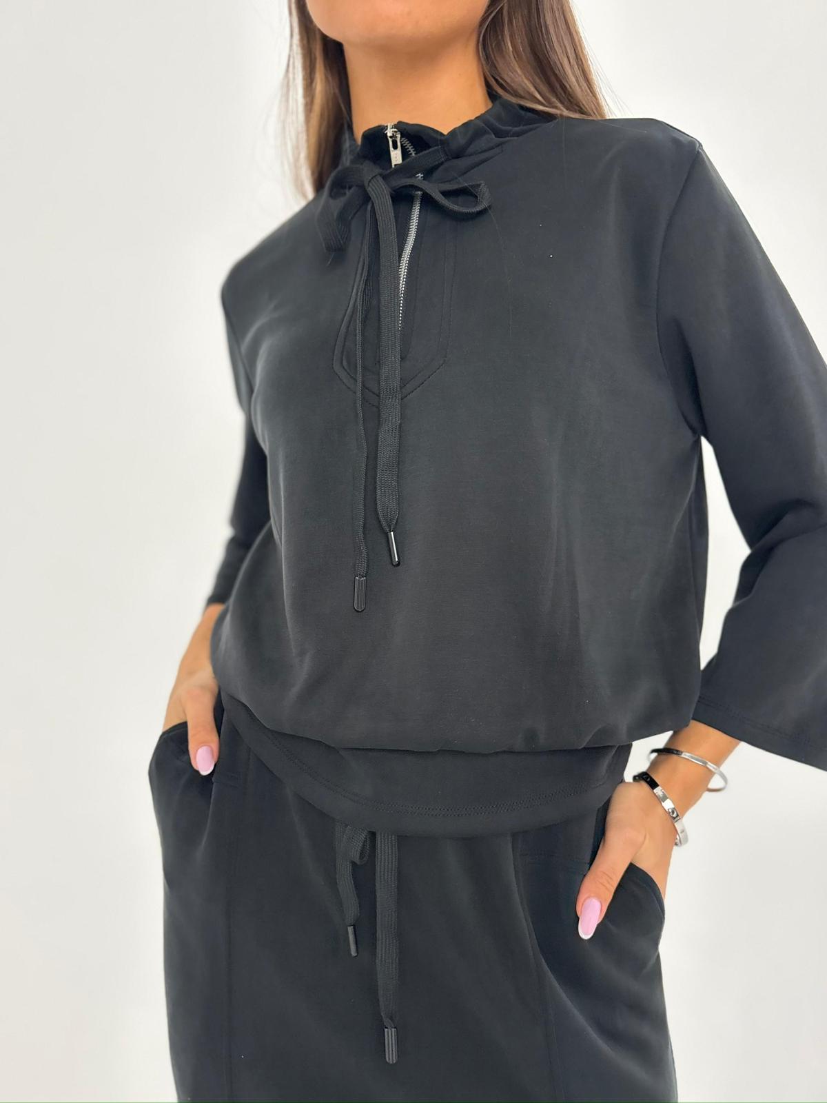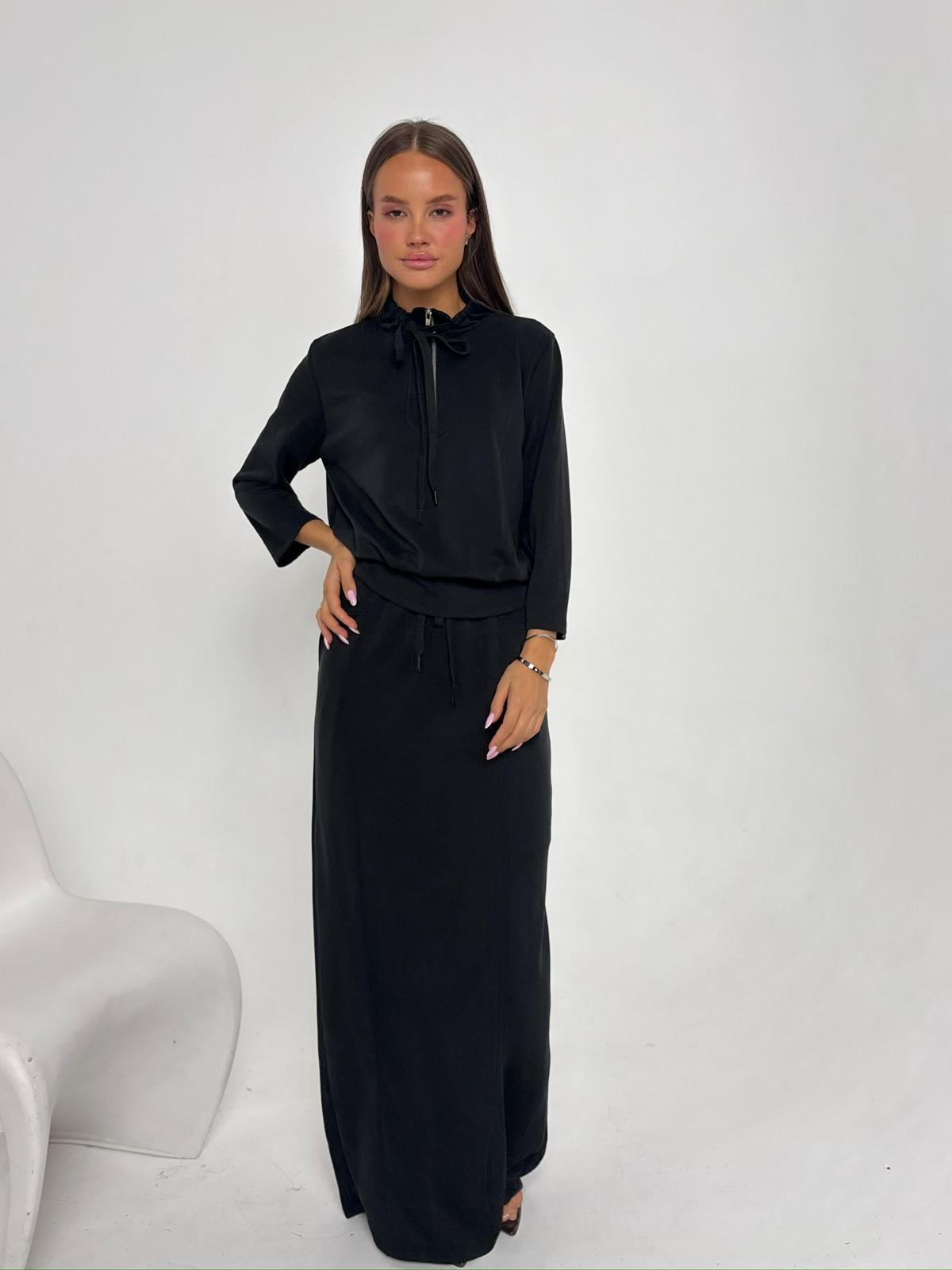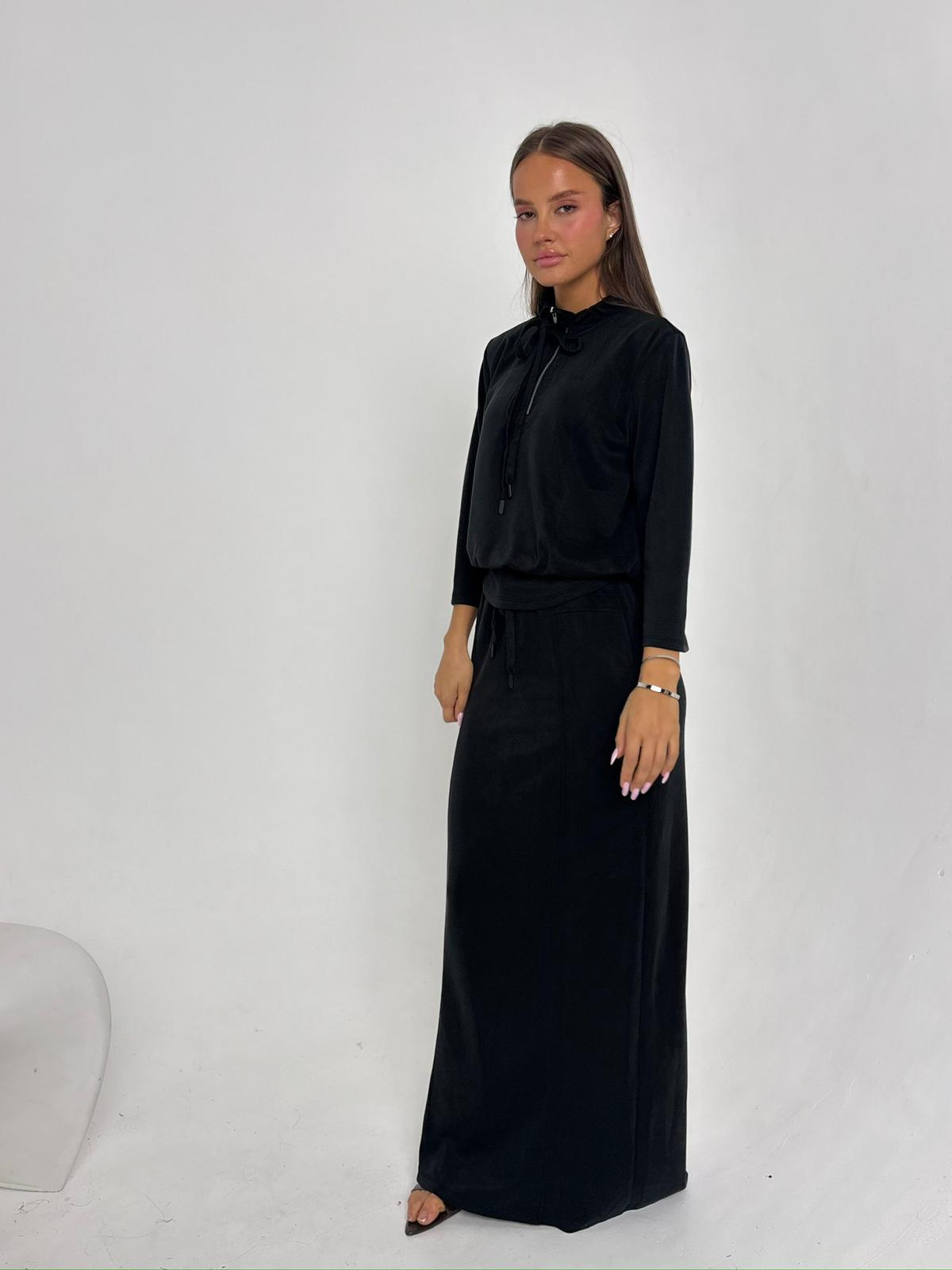 חליפת חצאית מבד ספורט לייקרה, חולצה בגיזרת אובר סייז עם ביטנה, שרוולים באורך 3/4, רוכסן קידמי, שרוך תואם בצווארון, חצאית ישרה באורך מקסי, גומי במותן החצאית עם שרוך פנימי תואם, כיסים בצידי החצאית. החליפה מגיעה במידות S/M/L ומתאימה עד למידה 42-44/46.