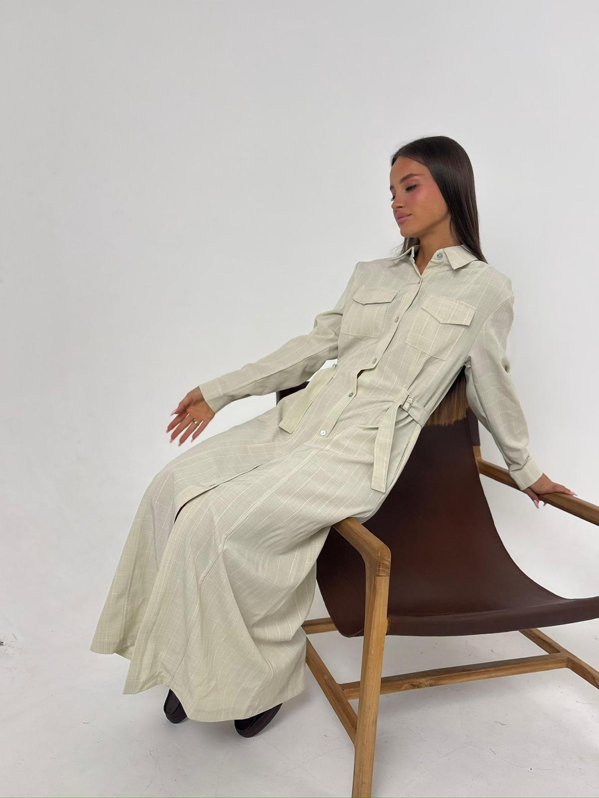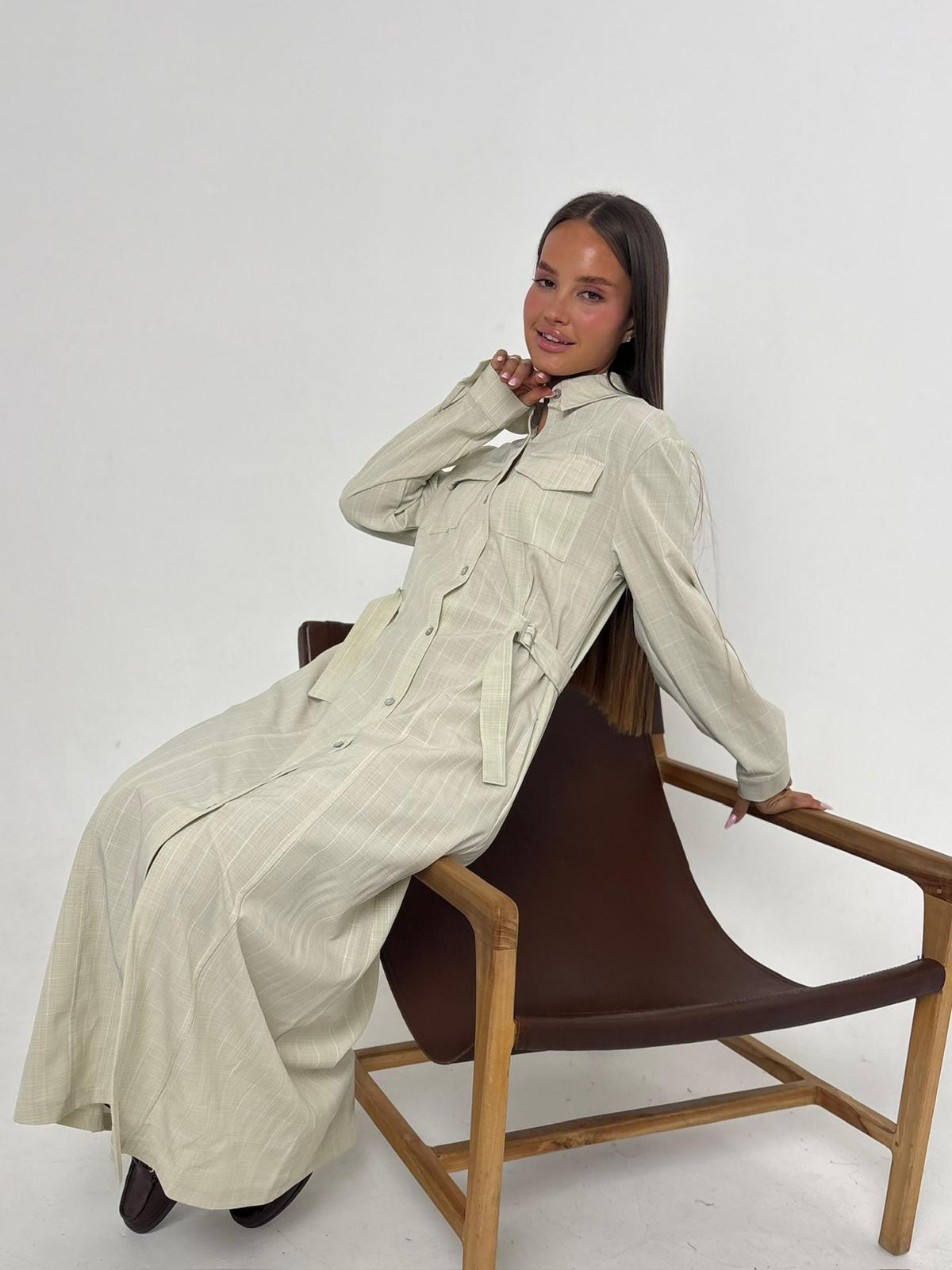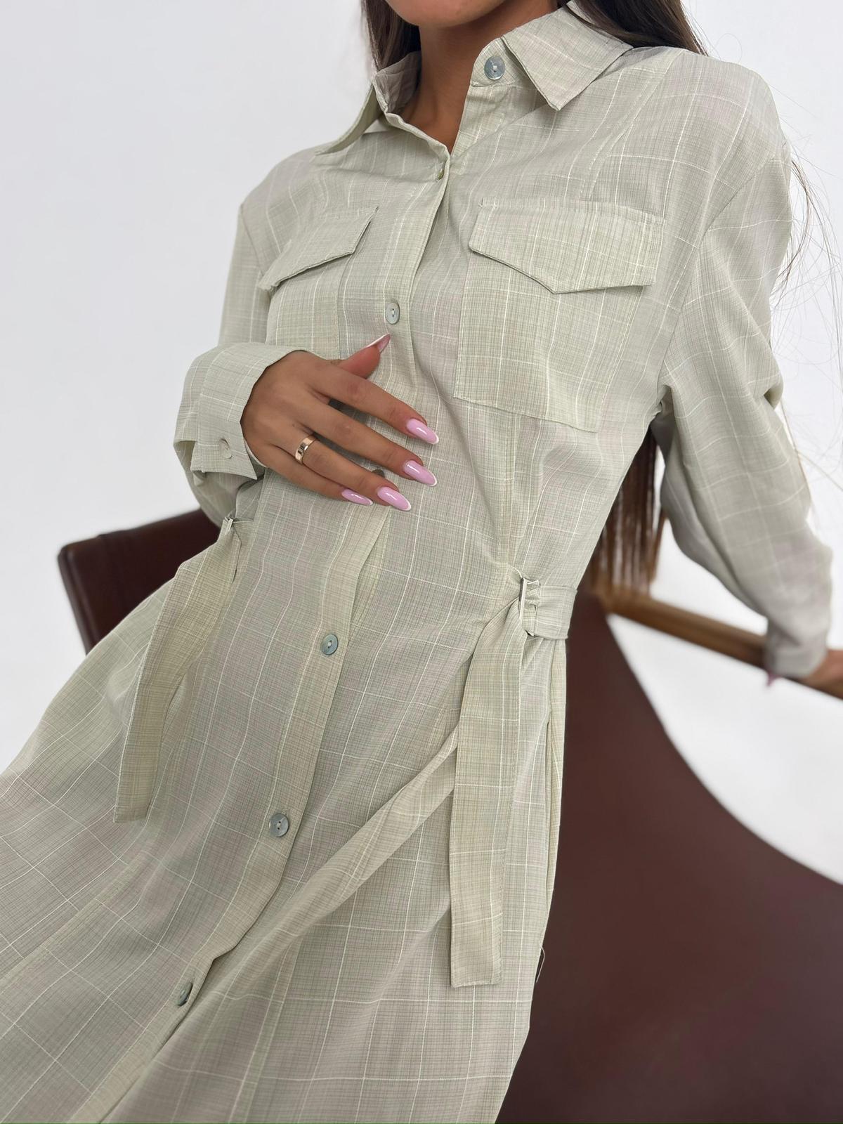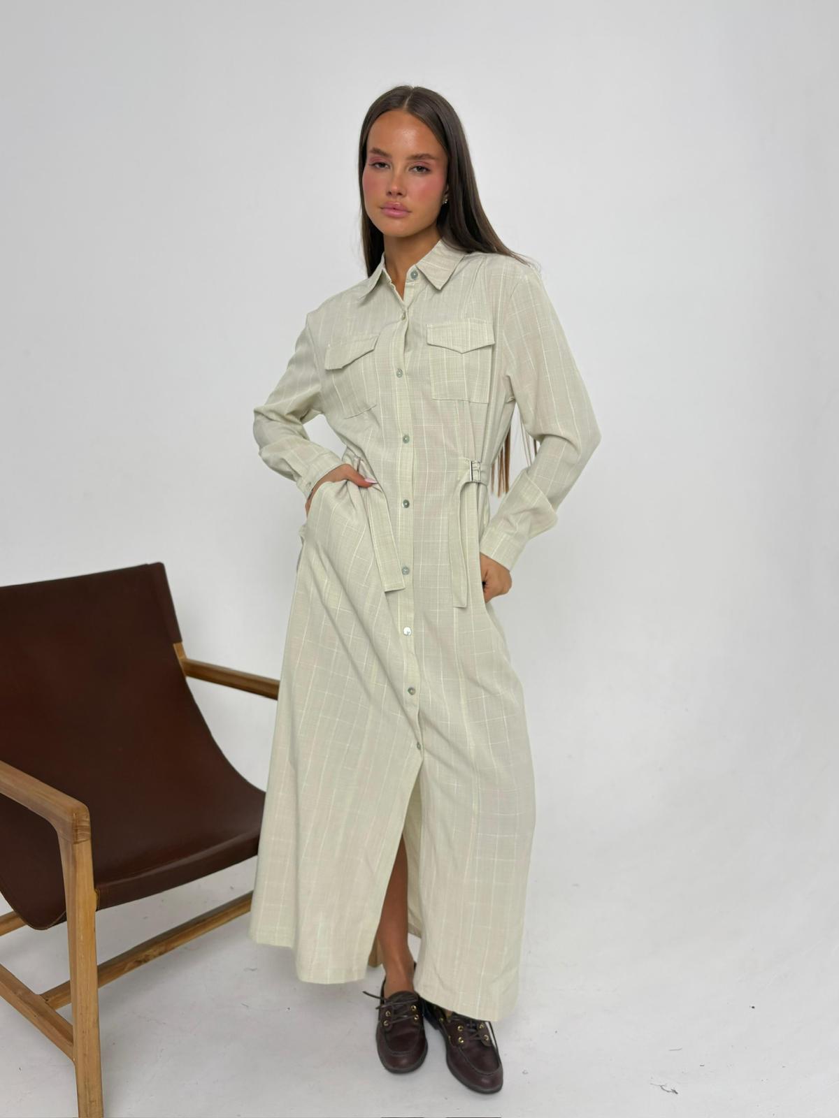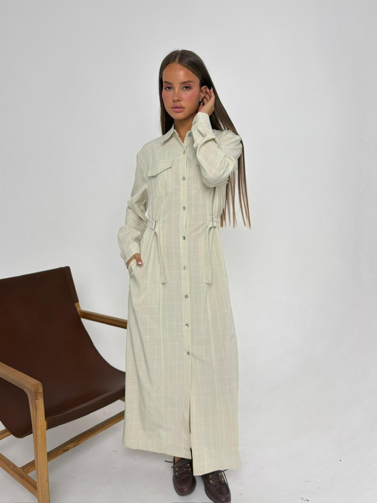 שמלת מקסי מבד אריג משבצות קייצי בגיזרה רחבה, שמלת כפתורים צנועה מבד אריג משבצות, צווארון אלגנטי, כפתורים לאורך השמלה, שרוולים ארוכים עם סיומת מנג'ט וכפתור לסגירה, חגורה מובנת במותן השמלה, 2 אבזמים קדמיים להידוק השמלה עם החגורה. השמלה מגיעה במידות S/M/L/XL ומתאימה עד למידה 46-48/50.