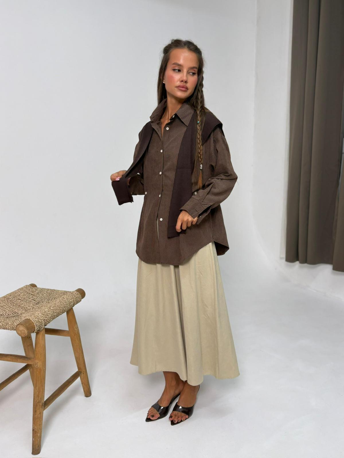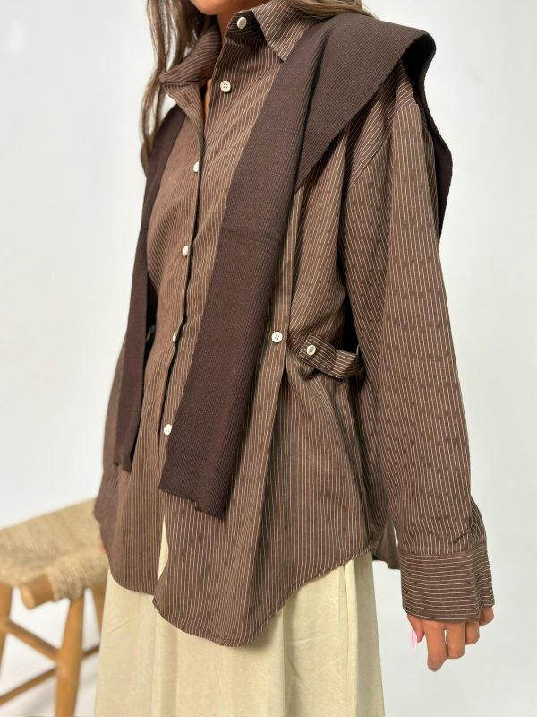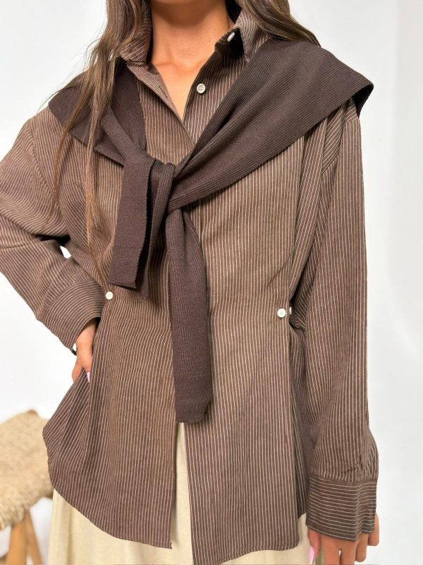 חולצת פסים מבד אריג קופרו, חולצת כפתורים בגיזרת אובר סייז, שרוולים ארוכים, סיומת מנג'ט עם כפתורים, צווארון אלגנטי, כפתורים במותן להידוק החולצה, דמוי צעיף מבד סריג בצבע תואם להשלמת המראה. החולצה מגיעה במידה אחת מידה ONE SIZE ומתאימה עד למידה 42-44/46.