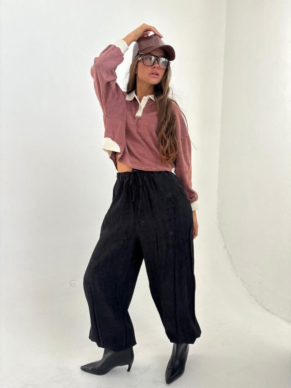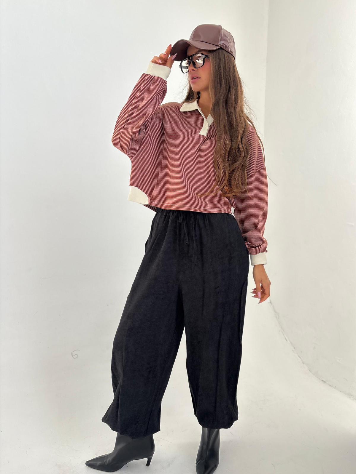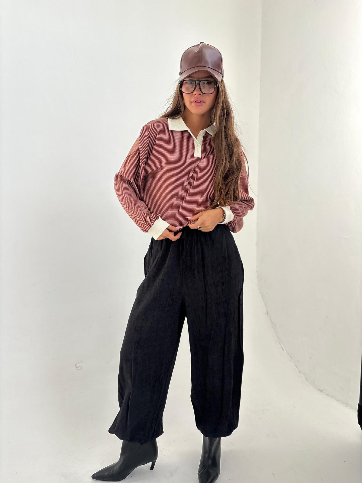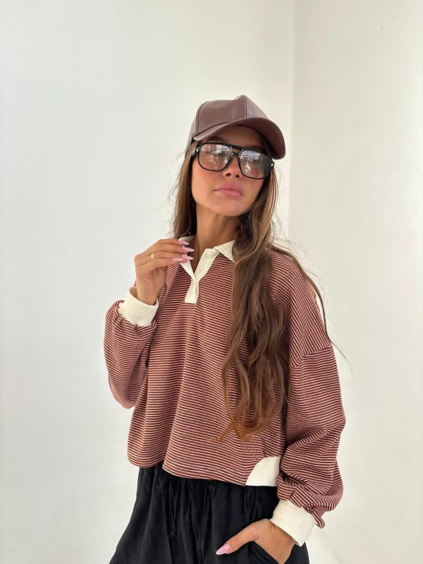 חולצת פולו פסים בגיזרת אובר סייז, שרוולים ארוכים עם סיומת מנג'ט בצבע מנוגד, צווארו ושינה עם 2 כפתורים בצבע מנוגד. החולצה מגיעה במידה אחת ONE SIZE.