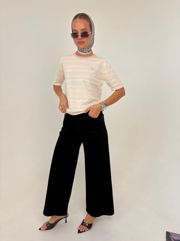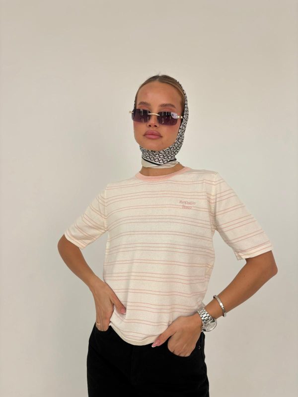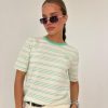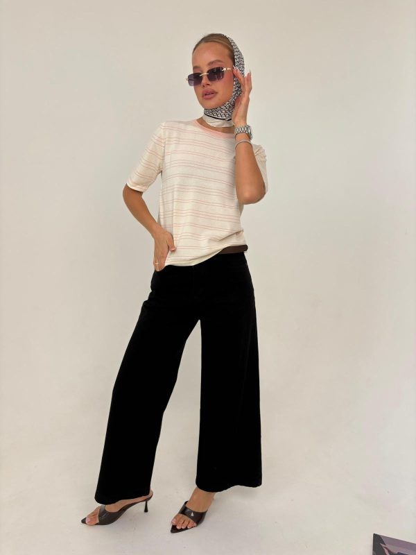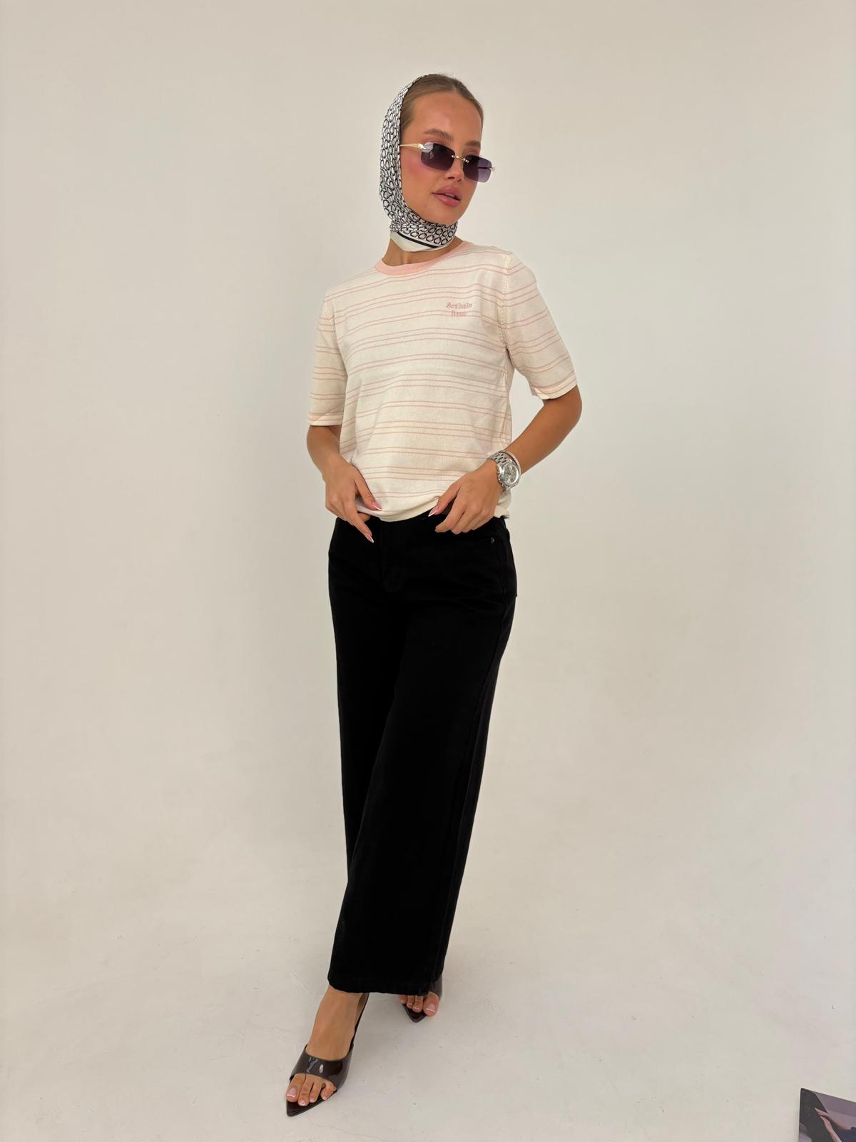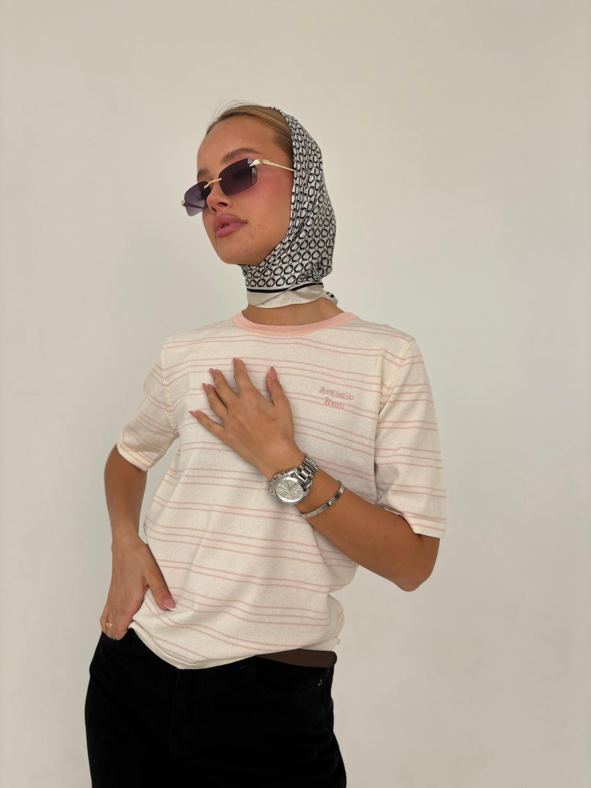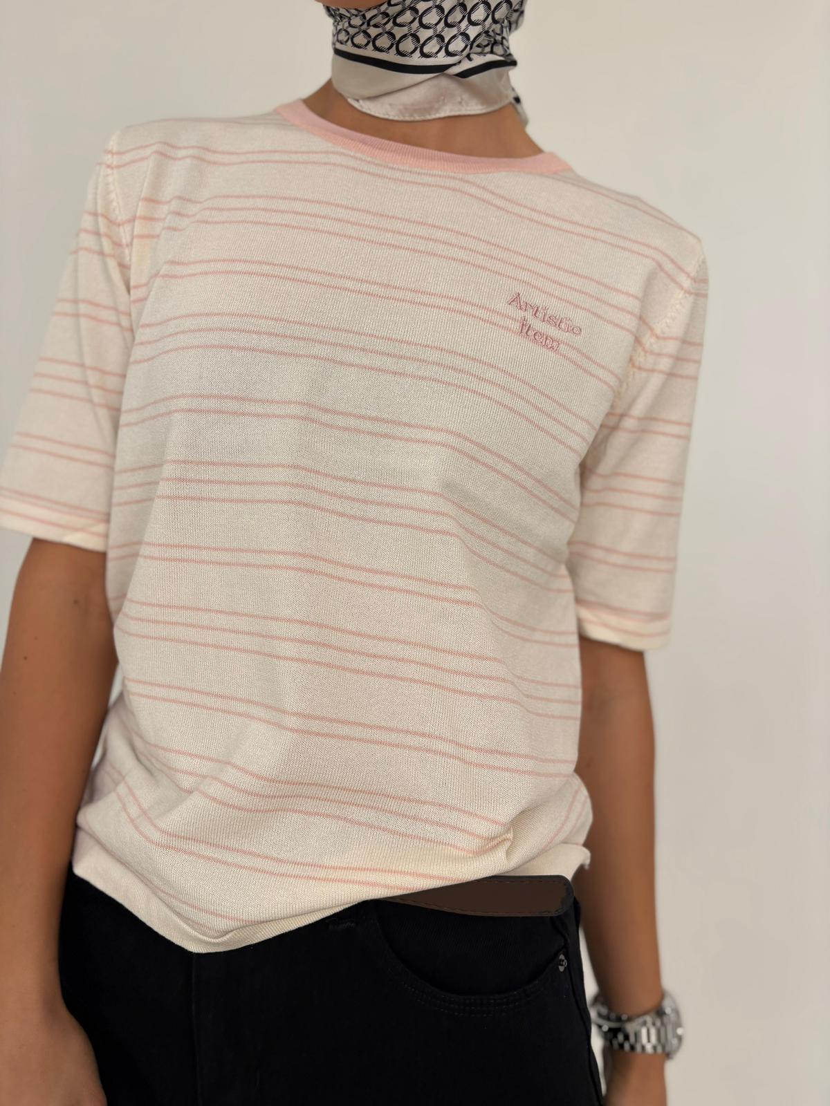 חולצת פסים מבד סריג קיצי, שרוול קצר, צווארון בצבע מנוגד. החולצה מגיעה במידה אחת ONE SIZE ומתאימה עד למידה 38-40/42.