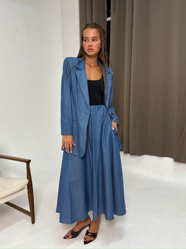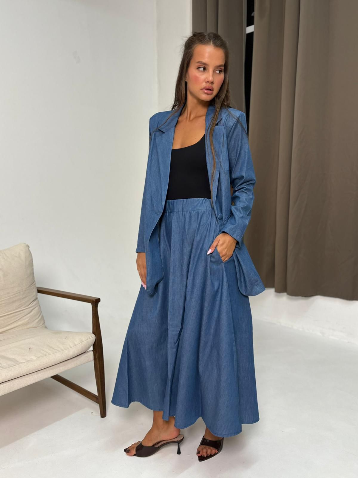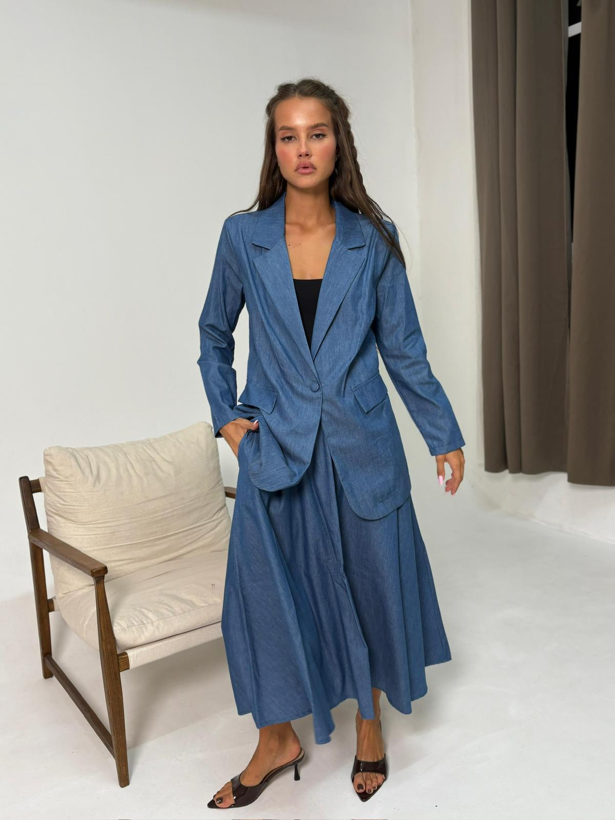 חליפת חצאית מבד ג'ינס, חצאית בגיזרת A, גומי במותן החצאית, כיסים ניסתרים, ג'קט מחויט עם שרוולים ארוכים, כריות בכתפיים, כפתור באמצע לסגירה, חגורת צמה עור שילוב בנדנה להידוק הג'קט. החליפה מגיעה במידות S/M/L/XL/XXL ומתאימה עד למידה 46-48/50.