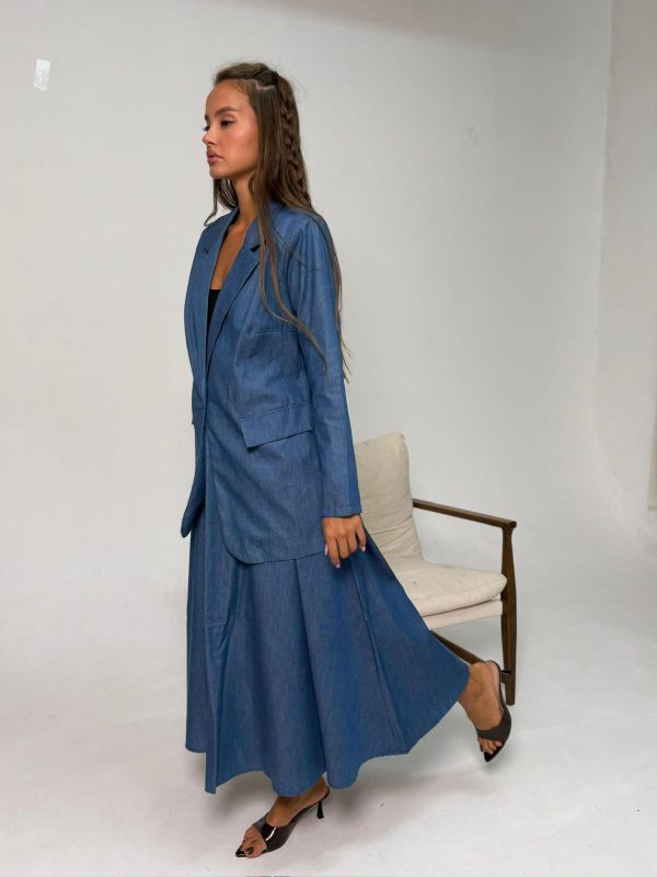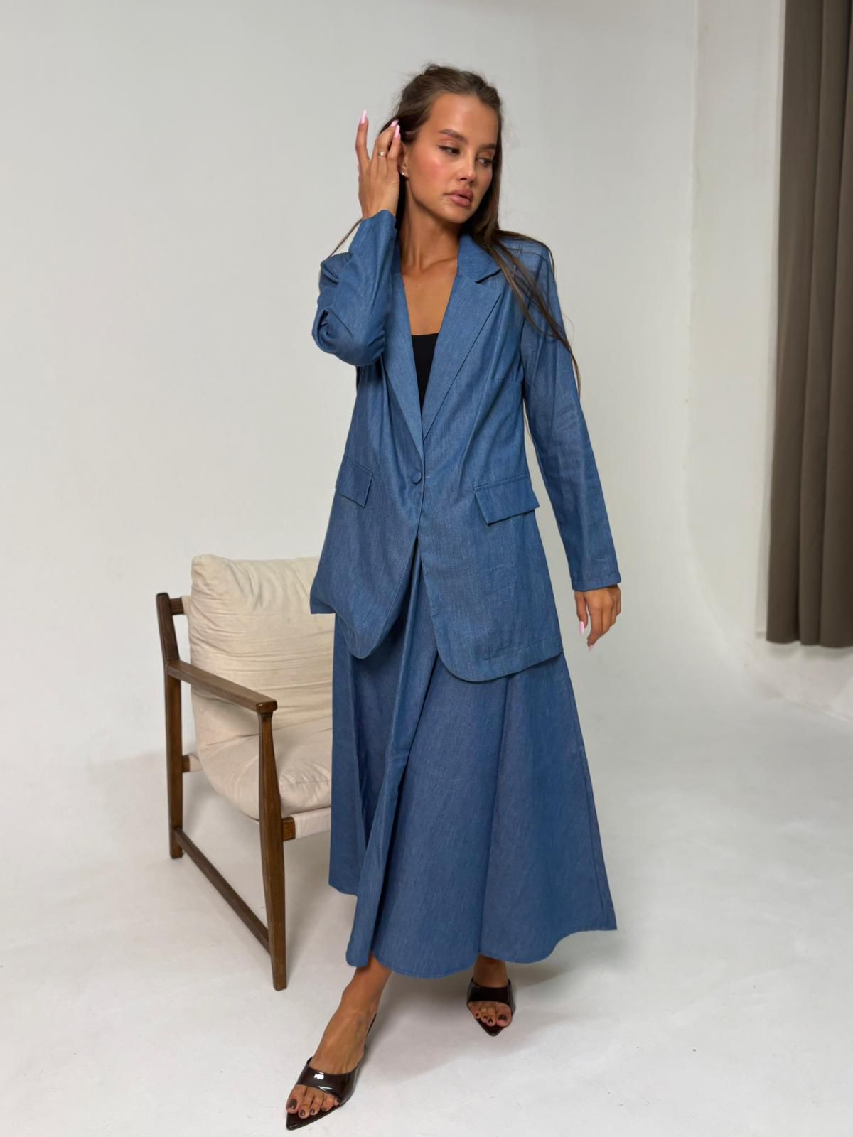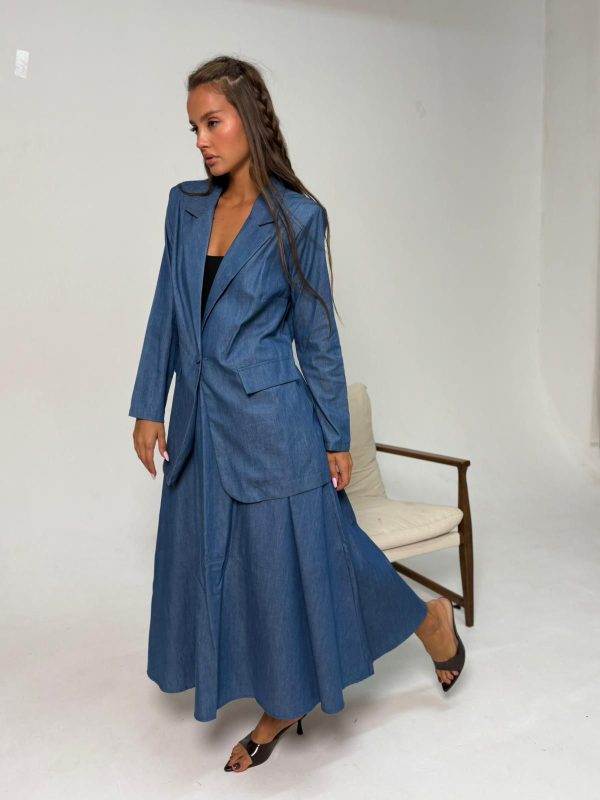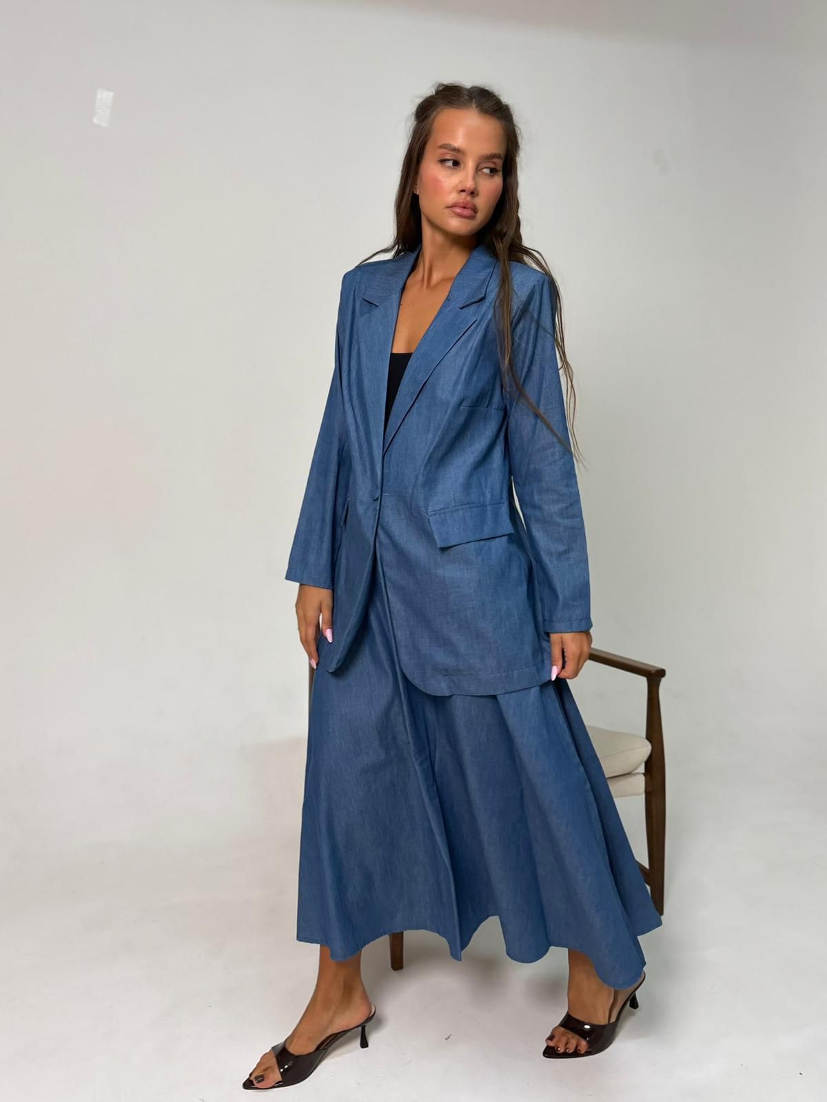 חליפת חצאית מבד ג'ינס, חצאית בגיזרת A, גומי במותן החצאית, כיסים ניסתרים, ג'קט מחויט עם שרוולים ארוכים, כריות בכתפיים, כפתור באמצע לסגירה, חגורת צמה עור שילוב בנדנה להידוק הג'קט. החליפה מגיעה במידות S/M/L/XL/XXL ומתאימה עד למידה 46-48/50.