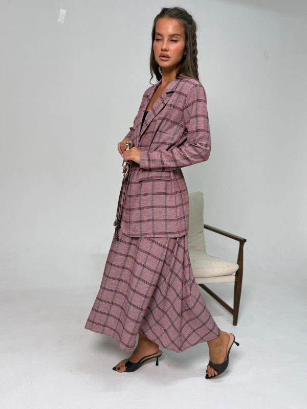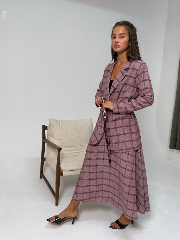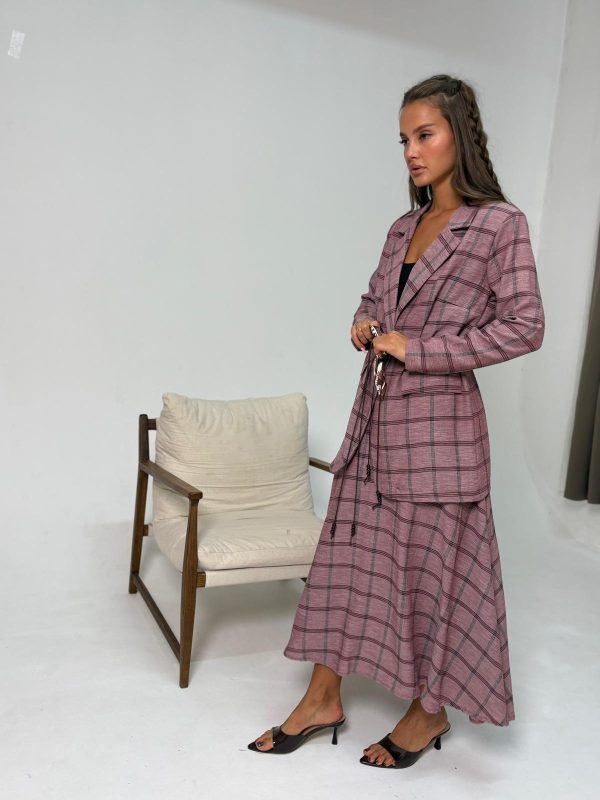 חליפת חצאית מבד אריג משובץ, חצאית בגיזרת A, גומי במותן החצאית, כיסים ניסתרים, ג'קט מחויט עם שרוולים ארוכים, כריות בכתפיים, כפתור באמצע לסגירה, חגורת צמה עור שילוב בנדנה להידוק הג'קט. החליפה מגיעה במידות S/M/L/XL/XXL ומתאימה עד למידה 46-48/50.