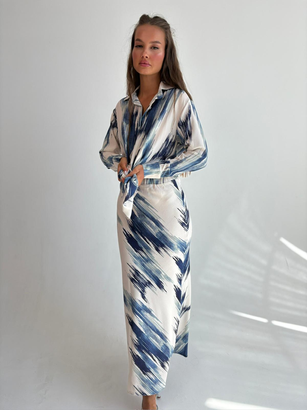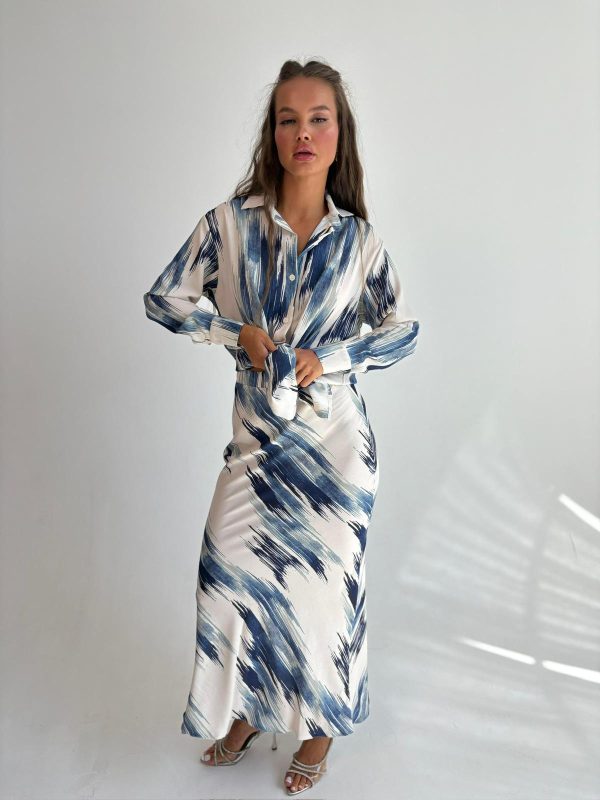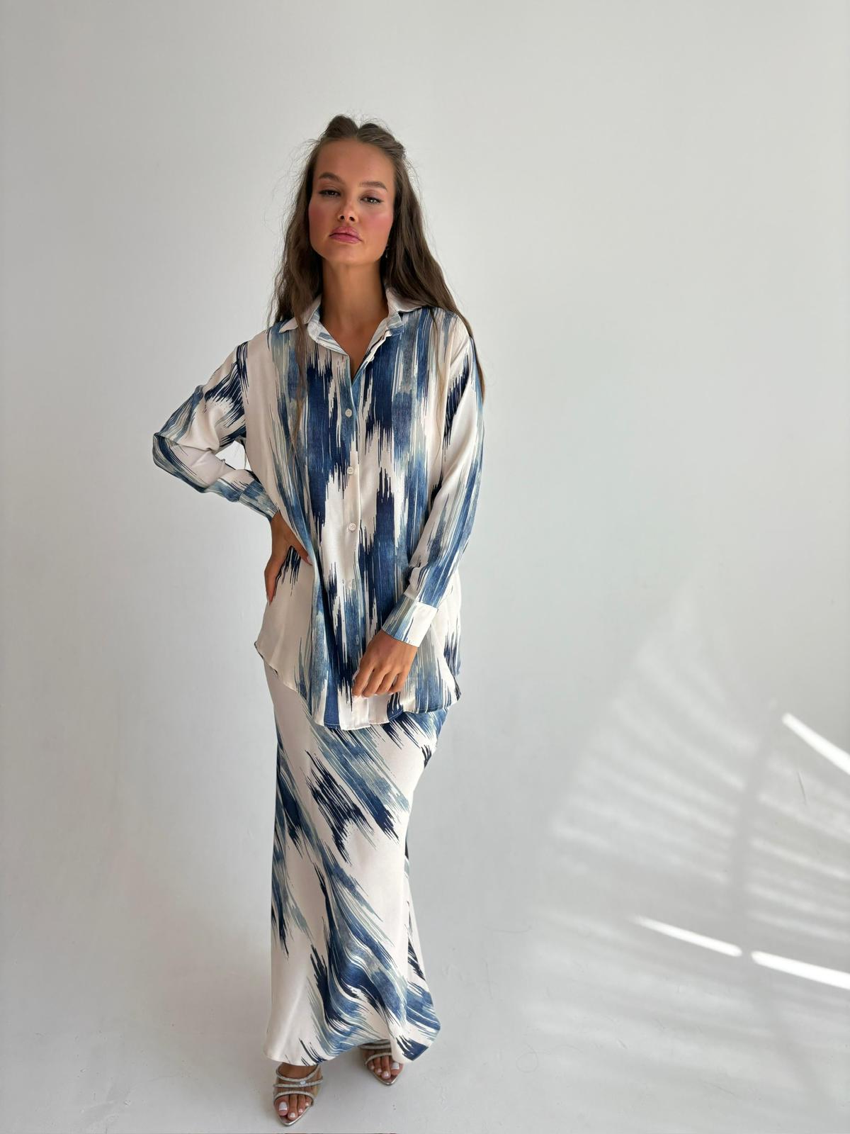 חליפת חצאית מבד אריג מודפס , חולצה מכופתרת, צווארון אלגנטי, שרוולים ארוכים, כפתורים בסיומת המנג'ט, חצאית מקסי באורך 1.00, גומי במותן החצאית. החליפה מגיעה במידות S/M/L/XL/XXL ומתאימה עד למידה 44-46/48.