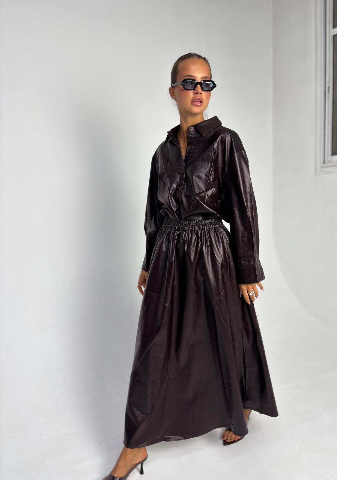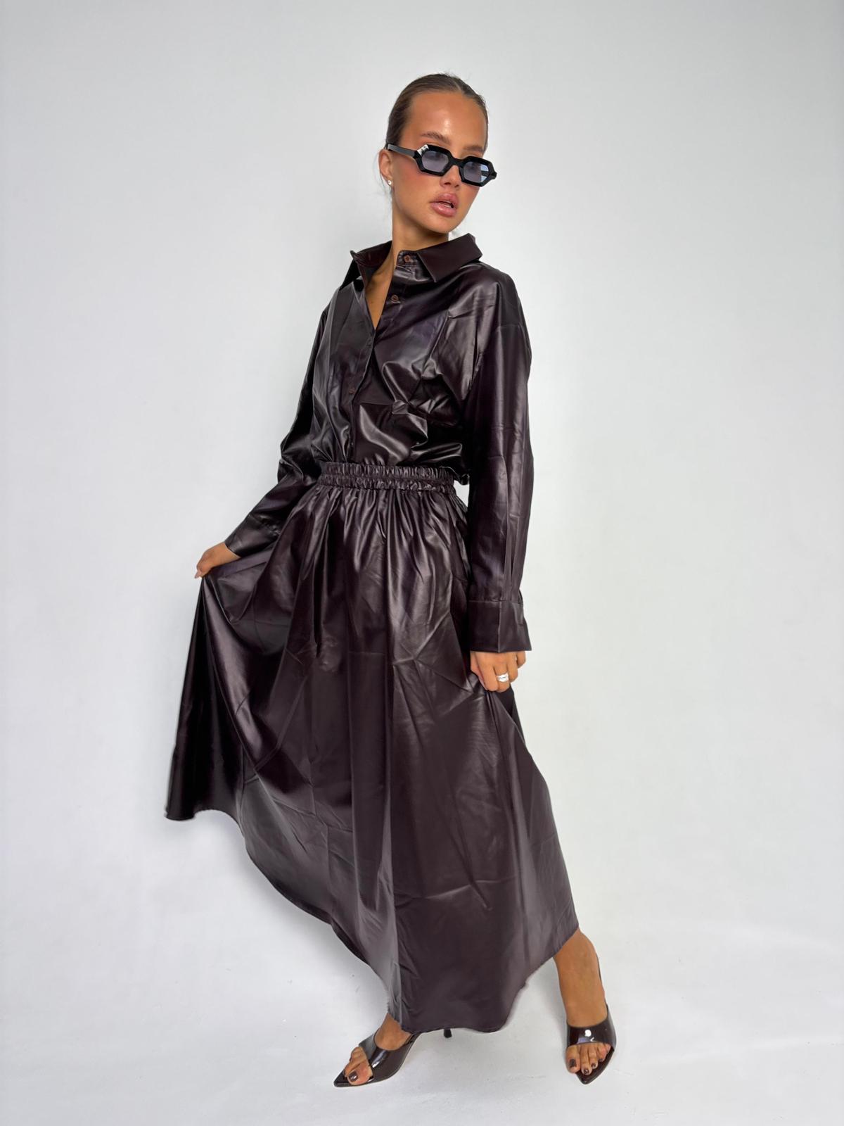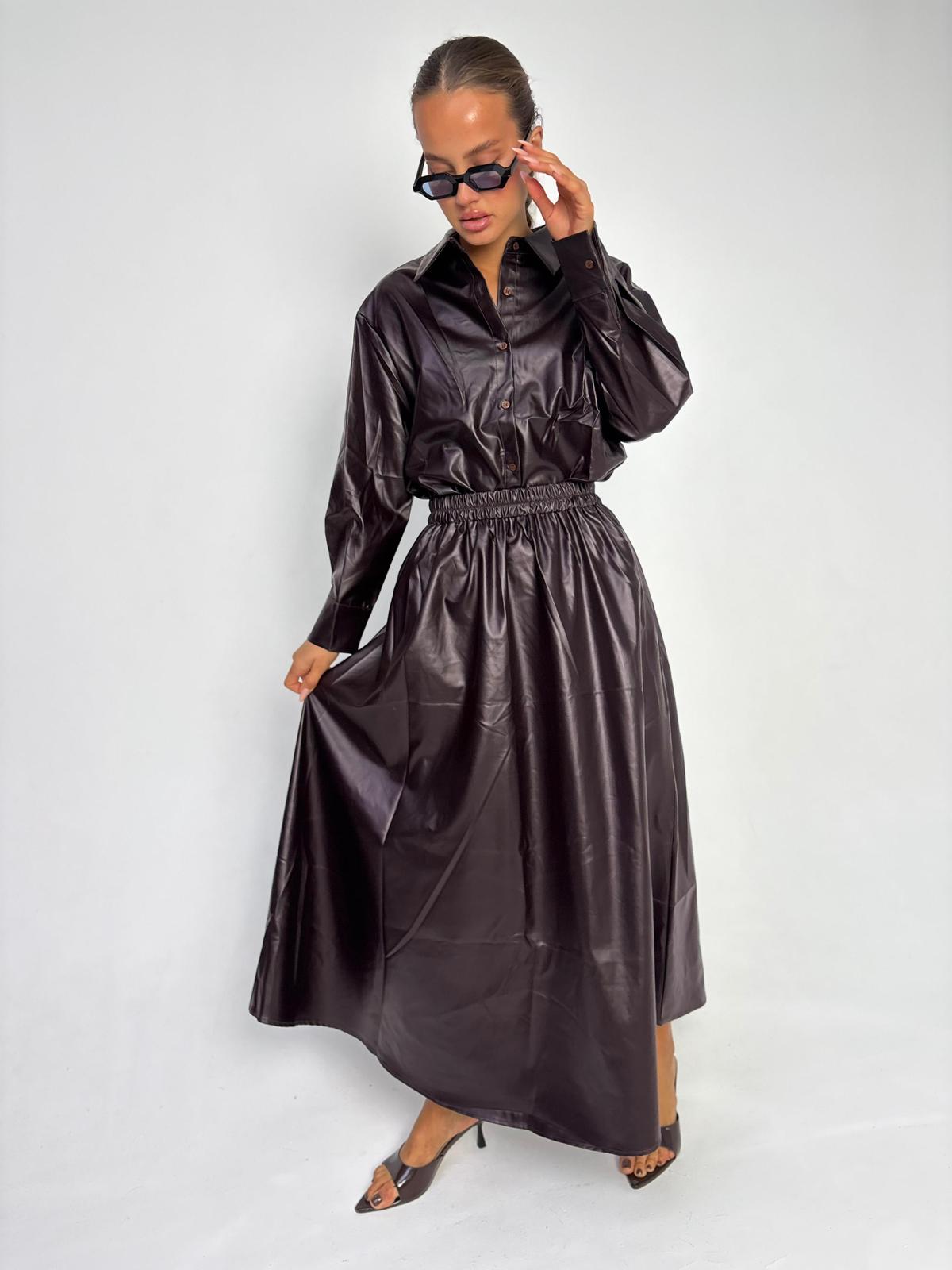 חליפת חצאית מבד דמוי עור, חצאית רחבה בגיזרת A עם גומי במותן וכיסים ניסתרים, חולצת כפתורים בגיזרת אובר סייז עם צווארון אלגנטי, שרוולים ארוכים עם סיומת מנג'ט וכפתור לסגירה, כפתורים קדמיים לאורך החולצה, מגיעה עם חגורת צמה עם שילוב בנדנה ולולאה להידוק החולצה. החליפה מגיעה במידה אחת ONE SIZE ומתאימה עד למידה 44-46/48.