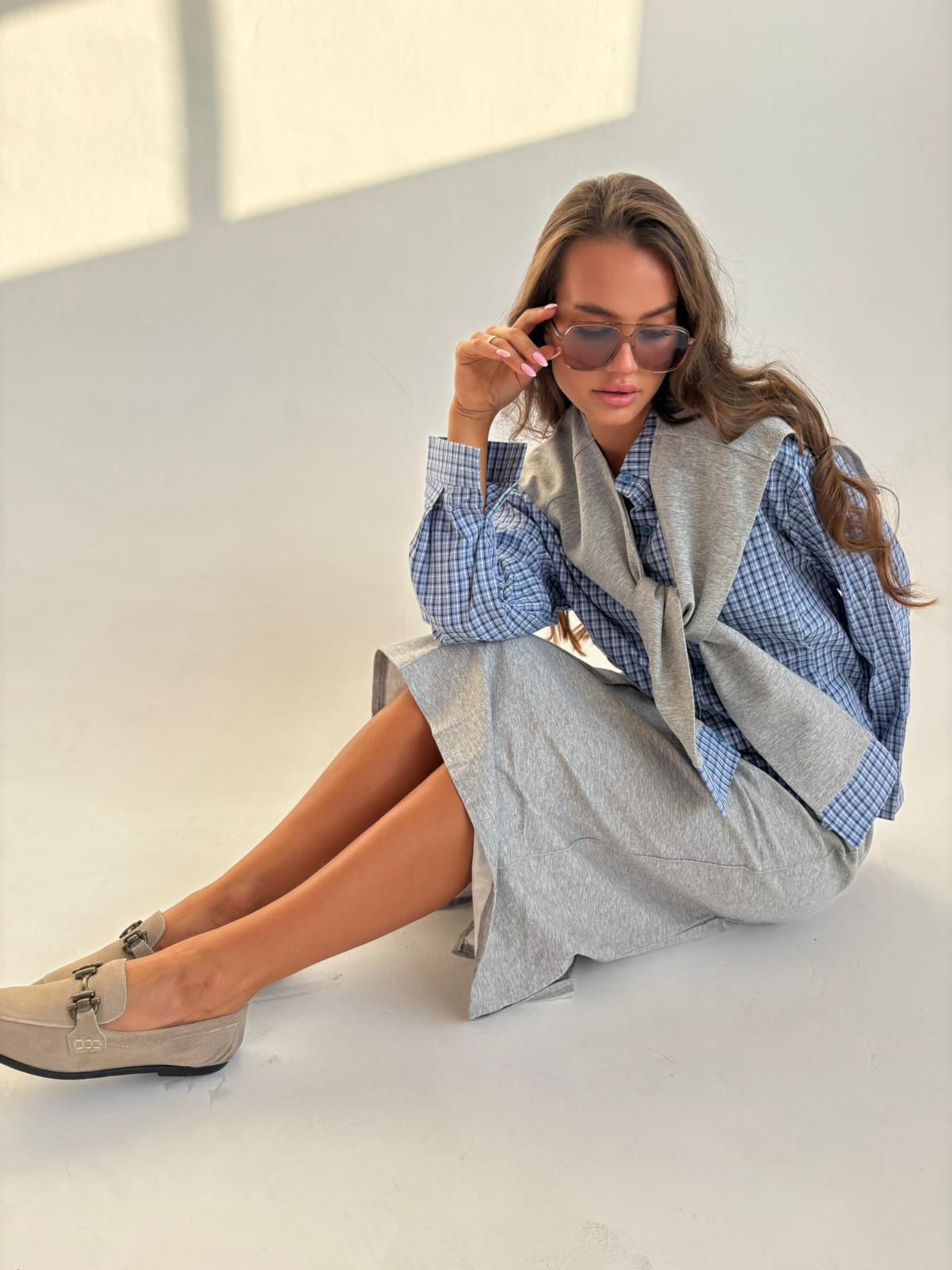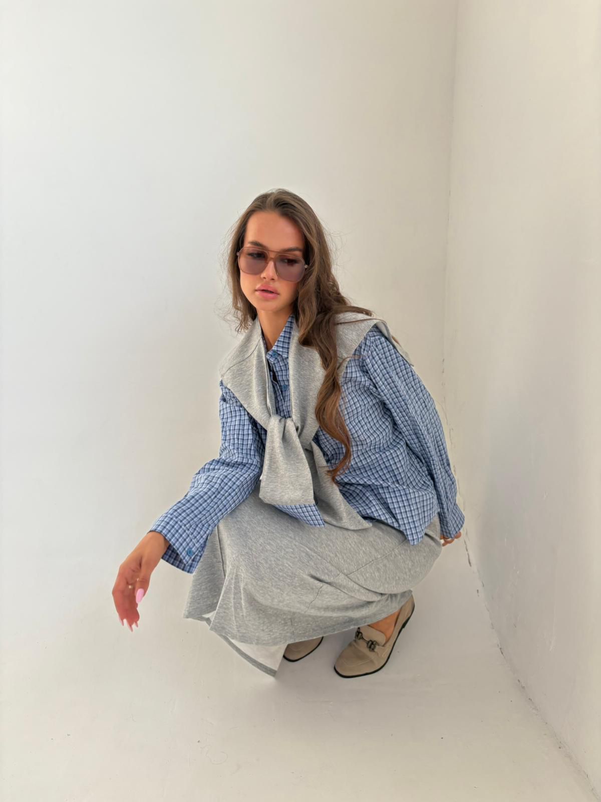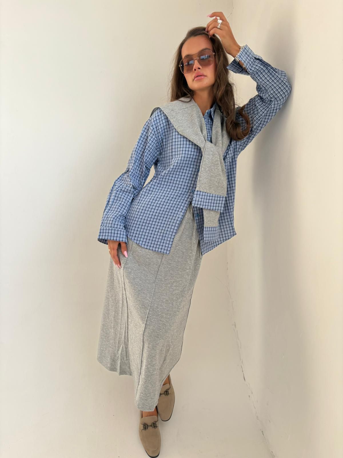 חליפת חצאית חולצת משבצות שילוב אפור