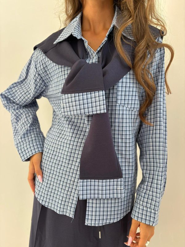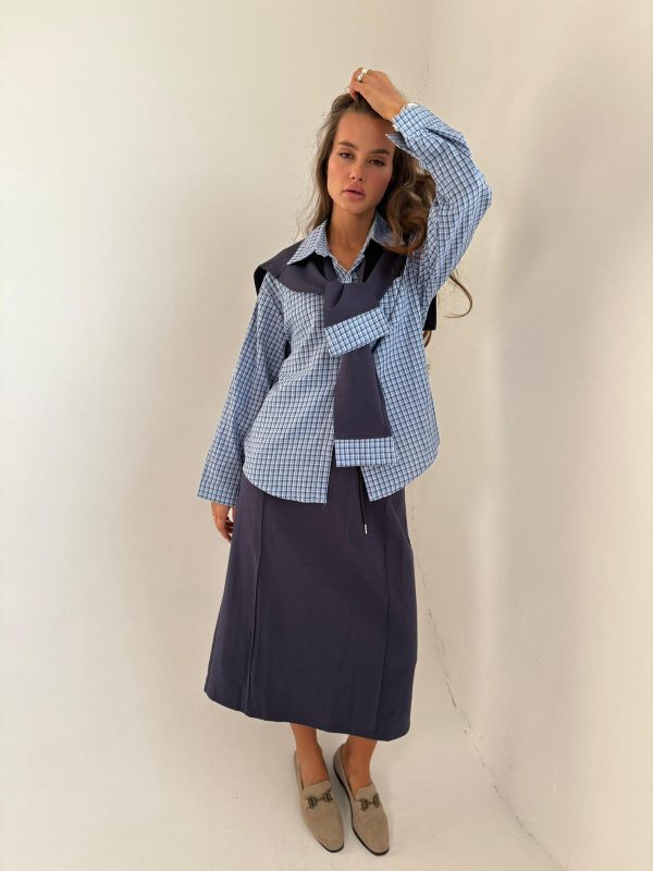 חליפת חצאית 3 חלקים, חולצת משבצות מכופרת עם כיס, שרוולים ארוכים, מנג'ט בסיום השרוול עם כפתור, שילוב דמוי צעיף תואם, חצאית באורך 0.80 ס"מ עם גומי במותן ושרוך פנימי. החליפה מגיעה במידה אחת ONE SIZE