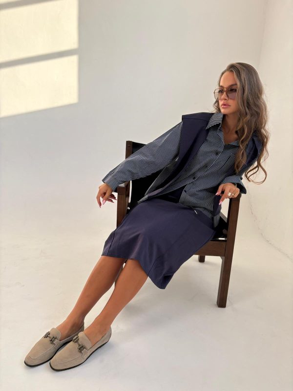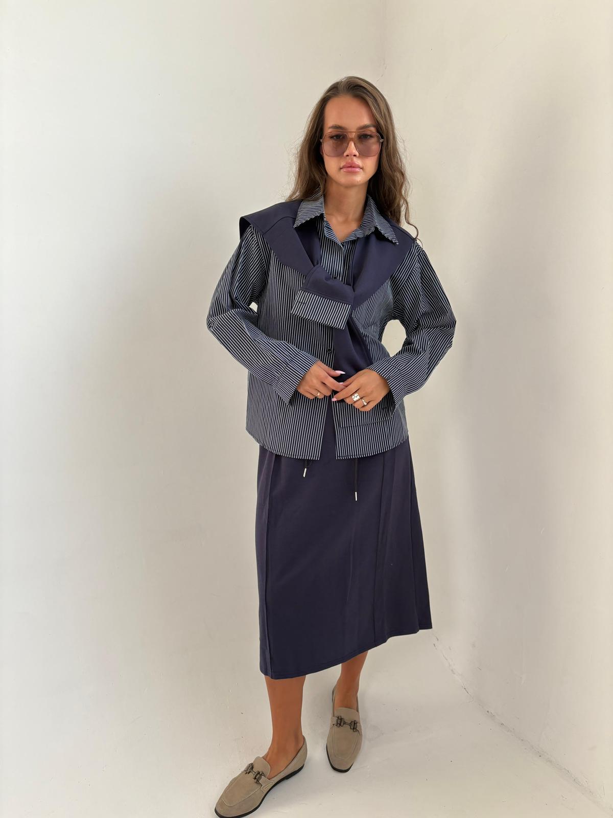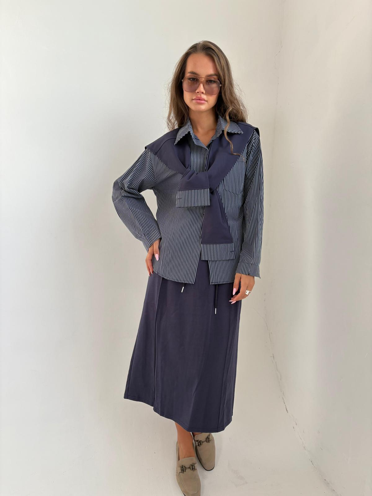 חליפת חצאית 3 חלקים, חולצת משבצות מכופרת עם כיס, שרוולים ארוכים, מנג'ט בסיום השרוול עם כפתור, שילוב דמוי צעיף תואם, חצאית באורך 0.80 ס"מ עם גומי במותן ושרוך פנימי. החליפה מגיעה במידה אחת ONE SIZE