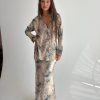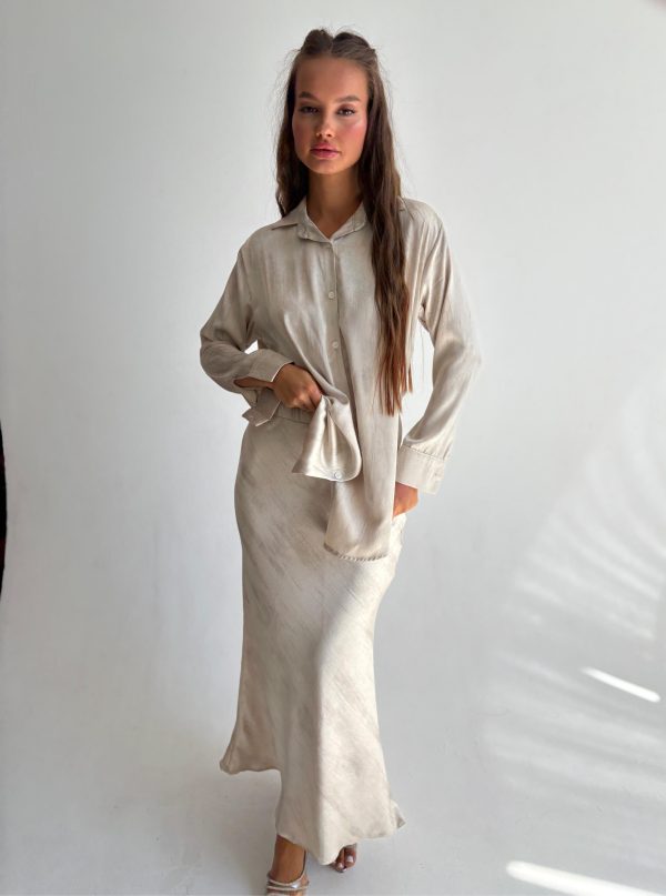 חליפת חצאית סאטן מודפס בז'