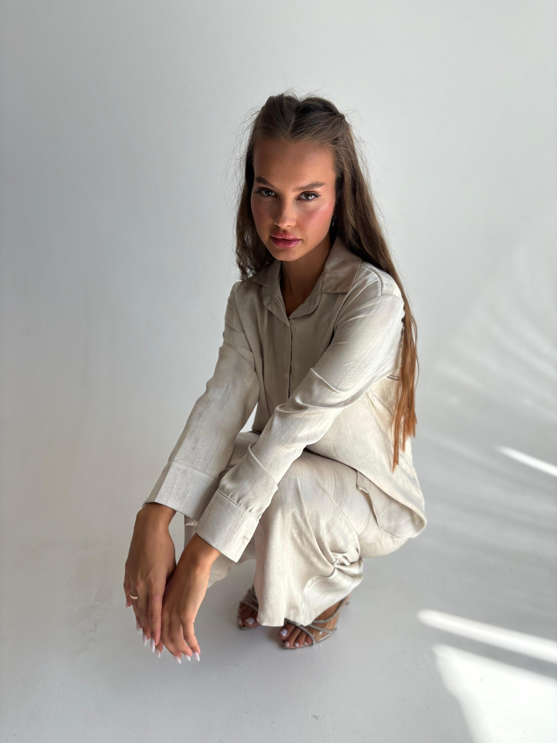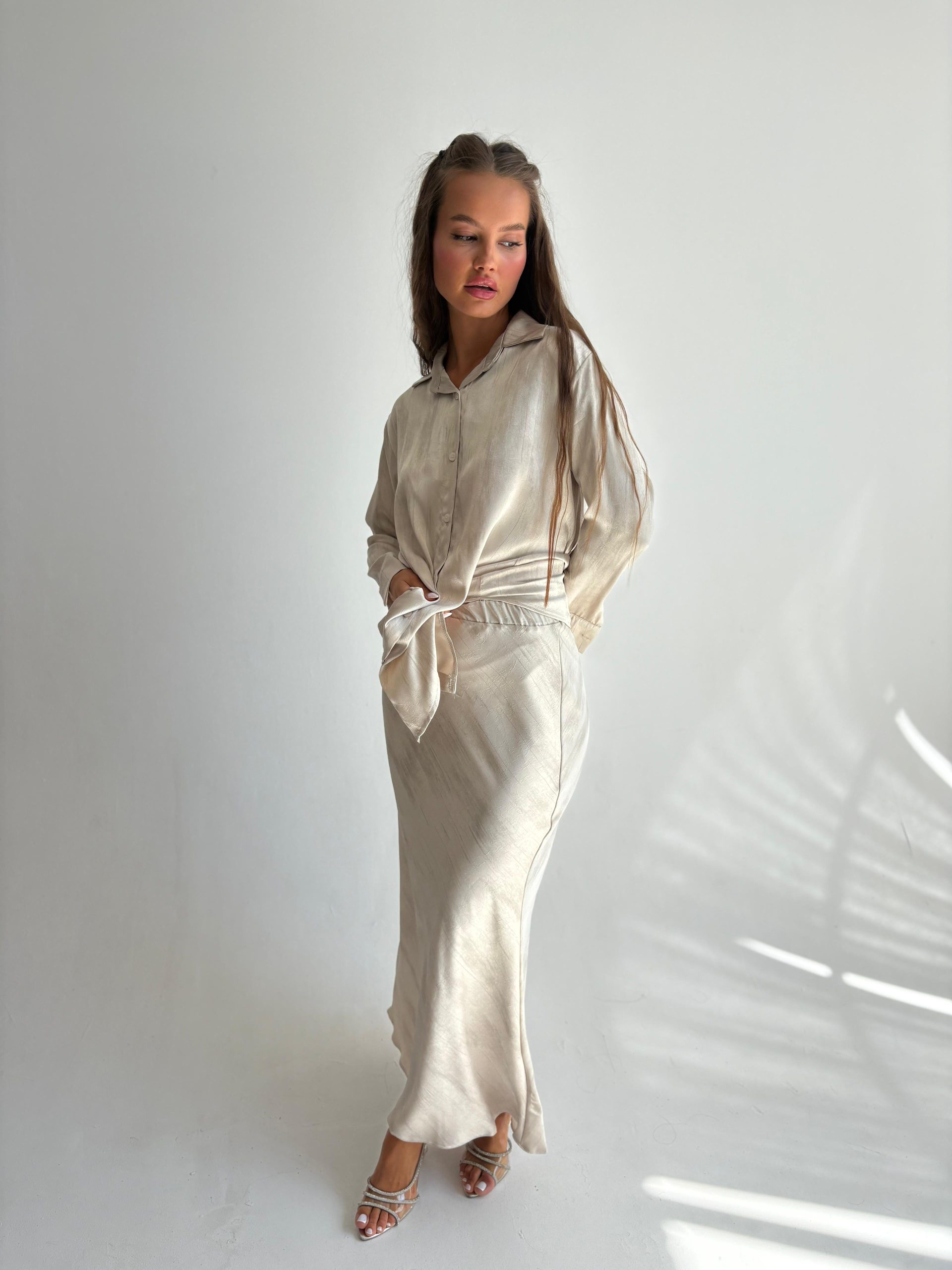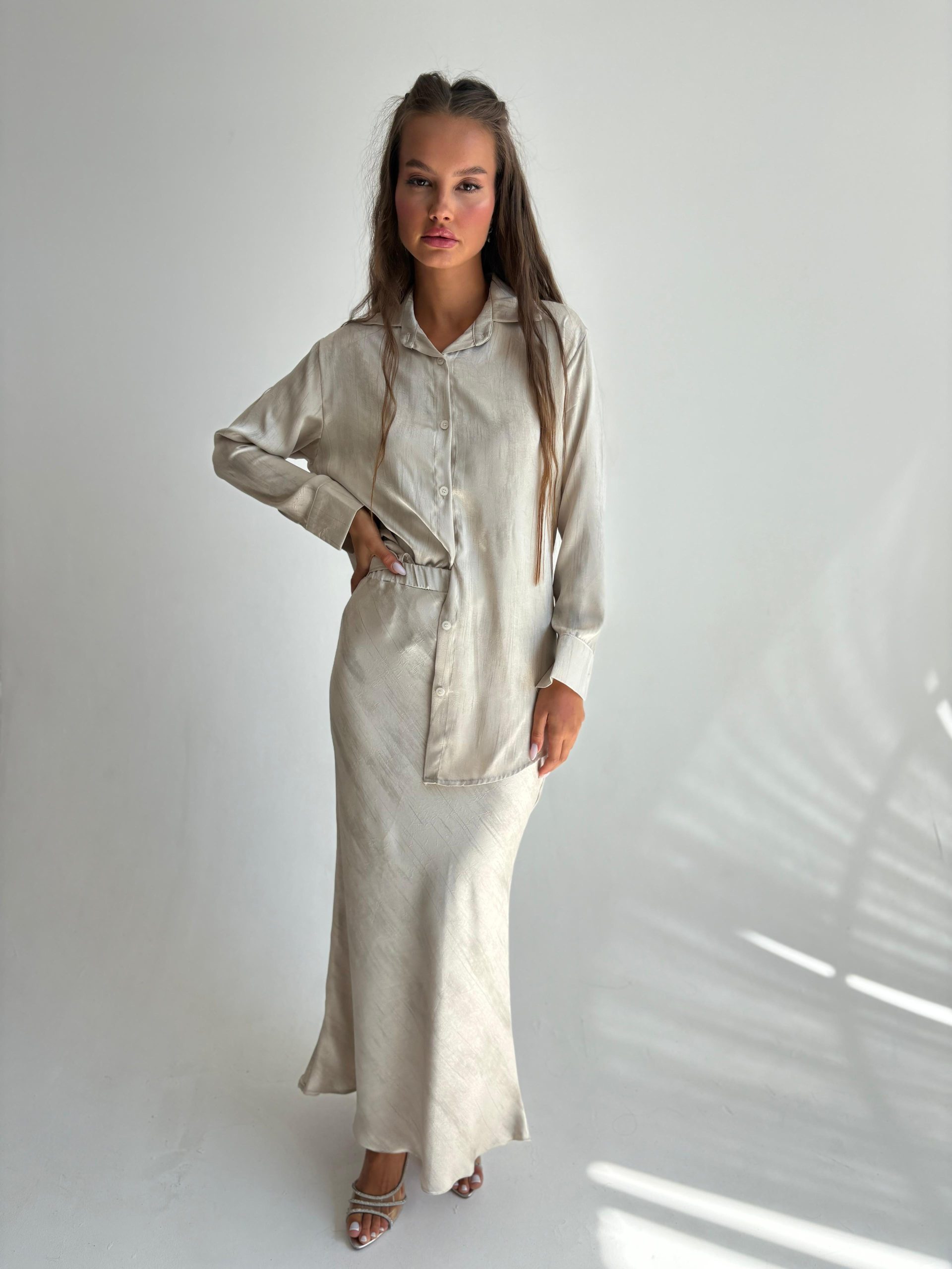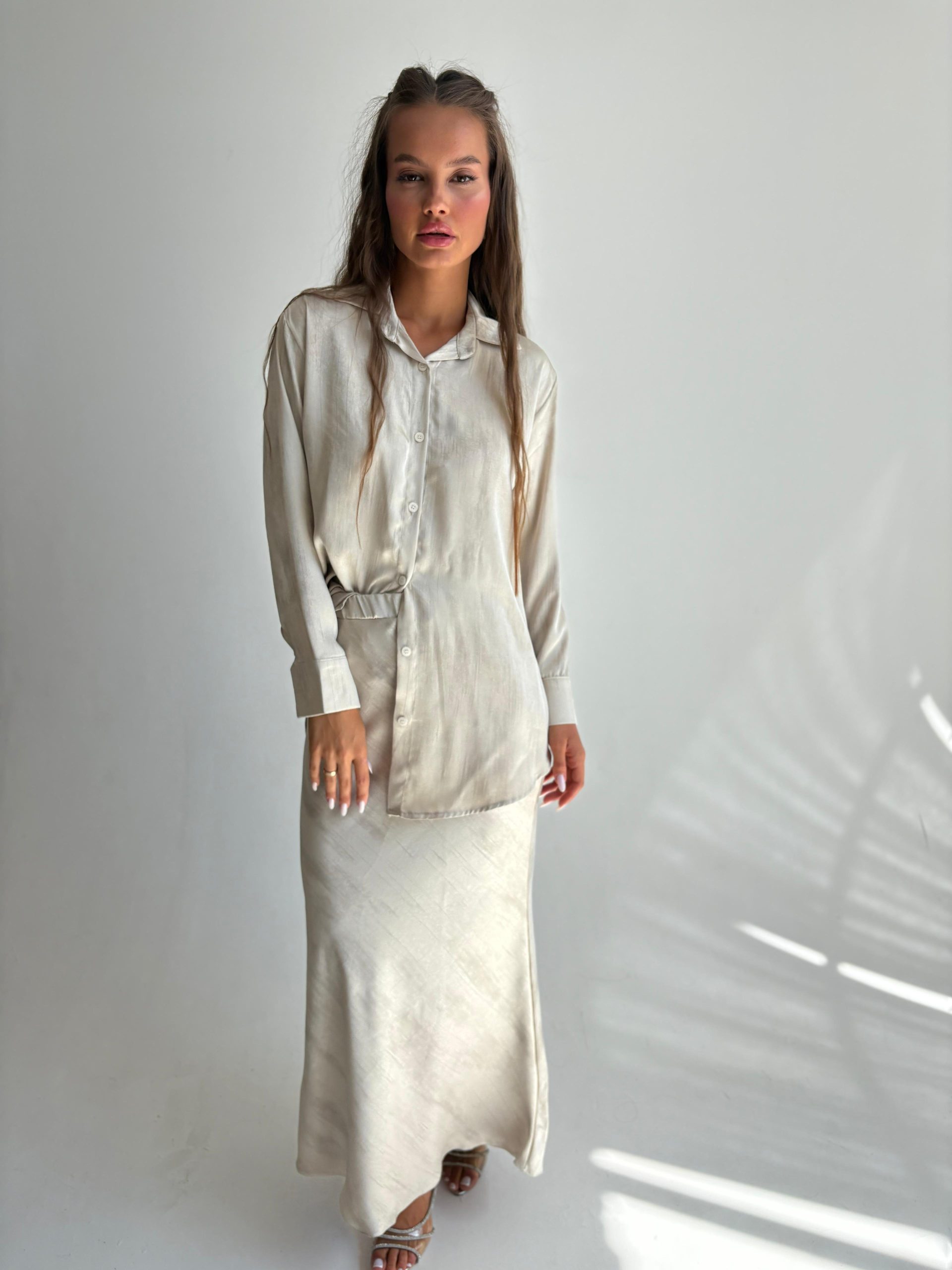 חליפת חצאית מבד סאטן מודפס עם יהלומים, חולצה מכופתרת, צווארון אלגנטי, שרוולים ארוכים, כפתורים בסיומת המנג'ט, חצאית מקסי באורך 1.00, גומי במותן החצאית. החליפה מגיעה במידות S/M/L/XL/XXL ומתאימה עד למידה 44-46/48.