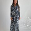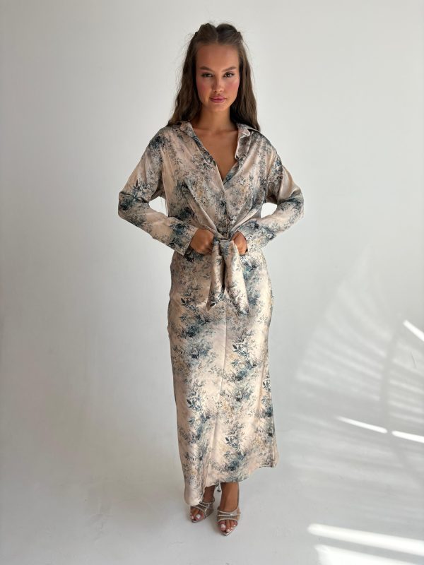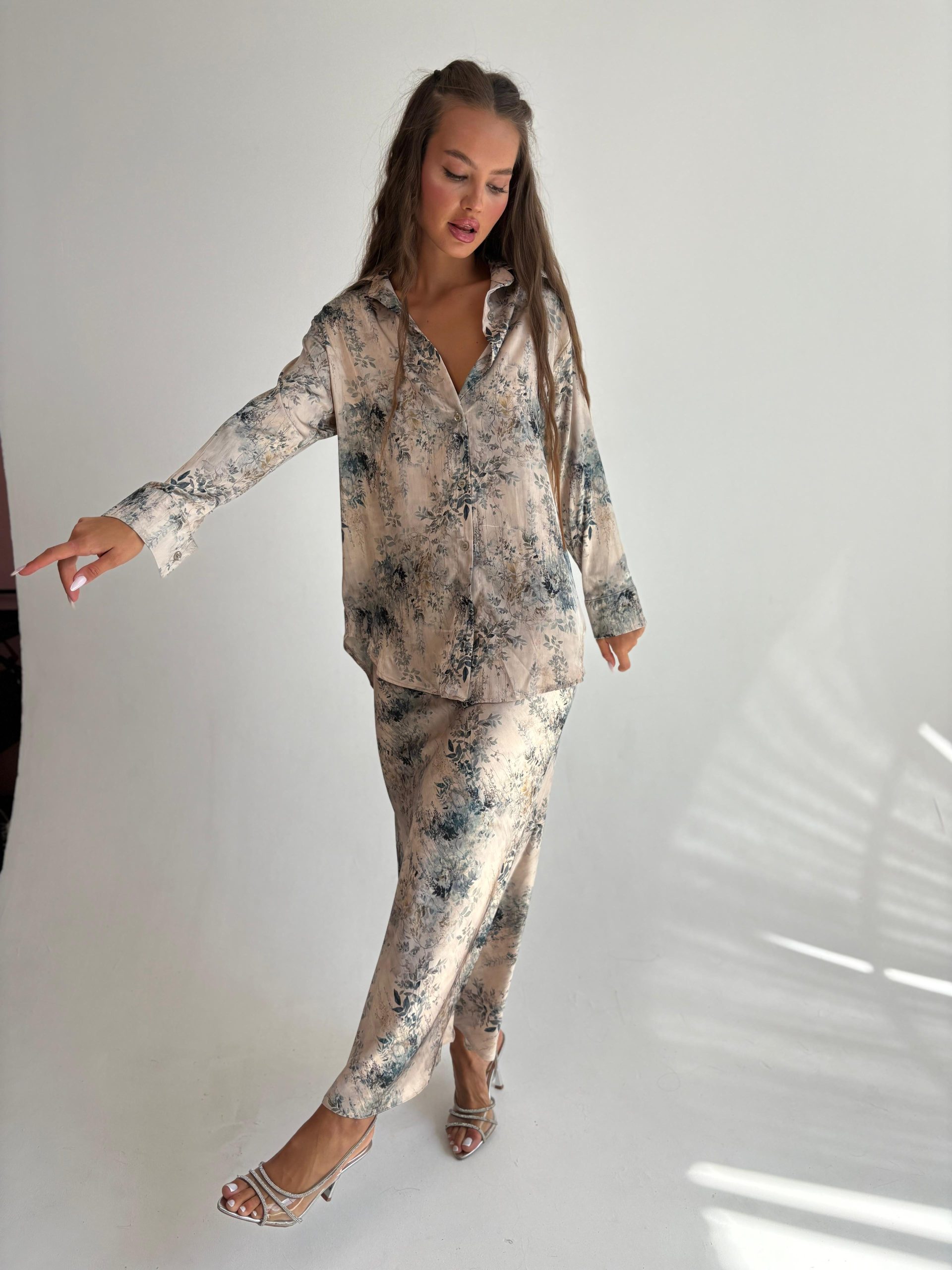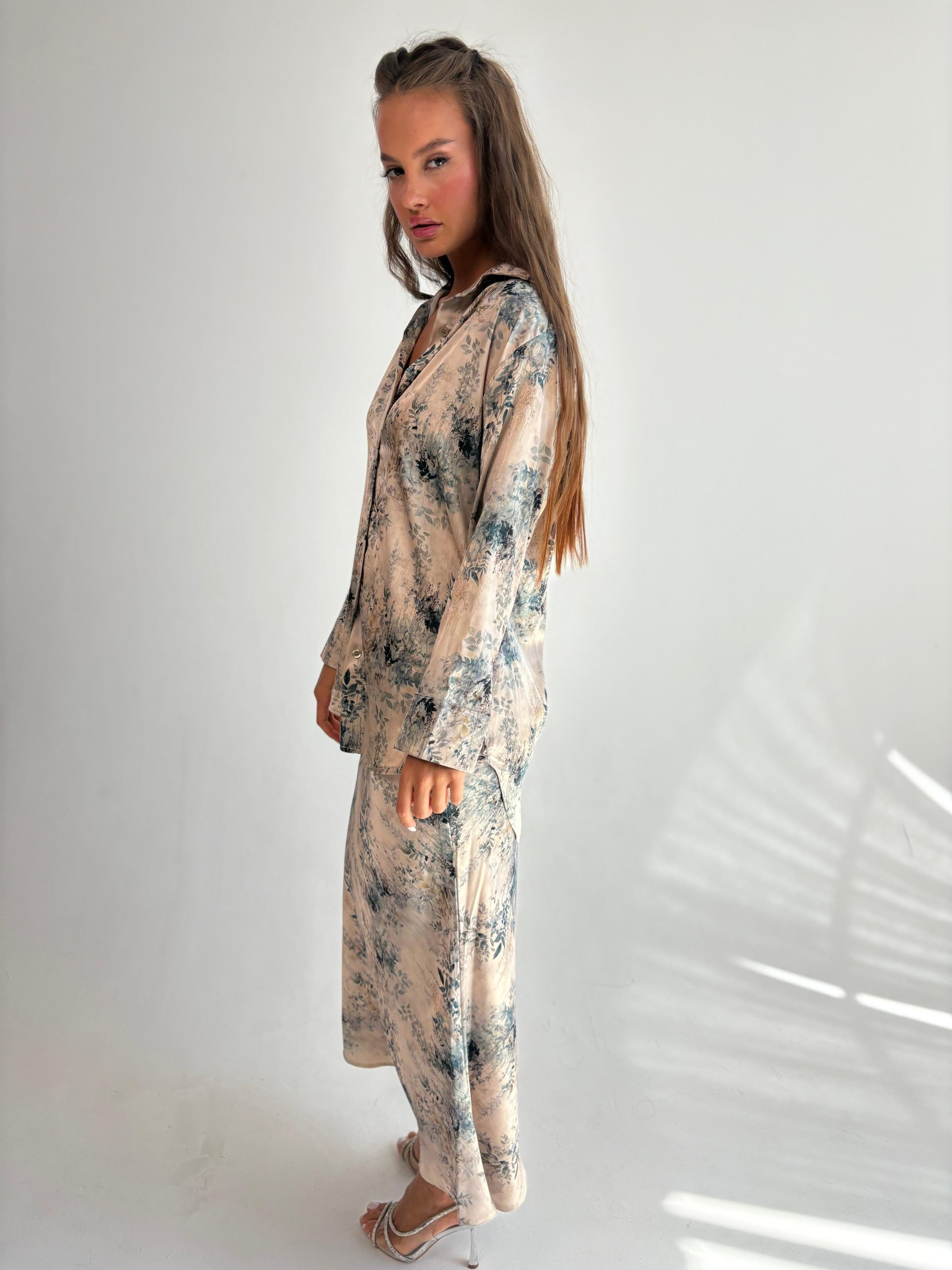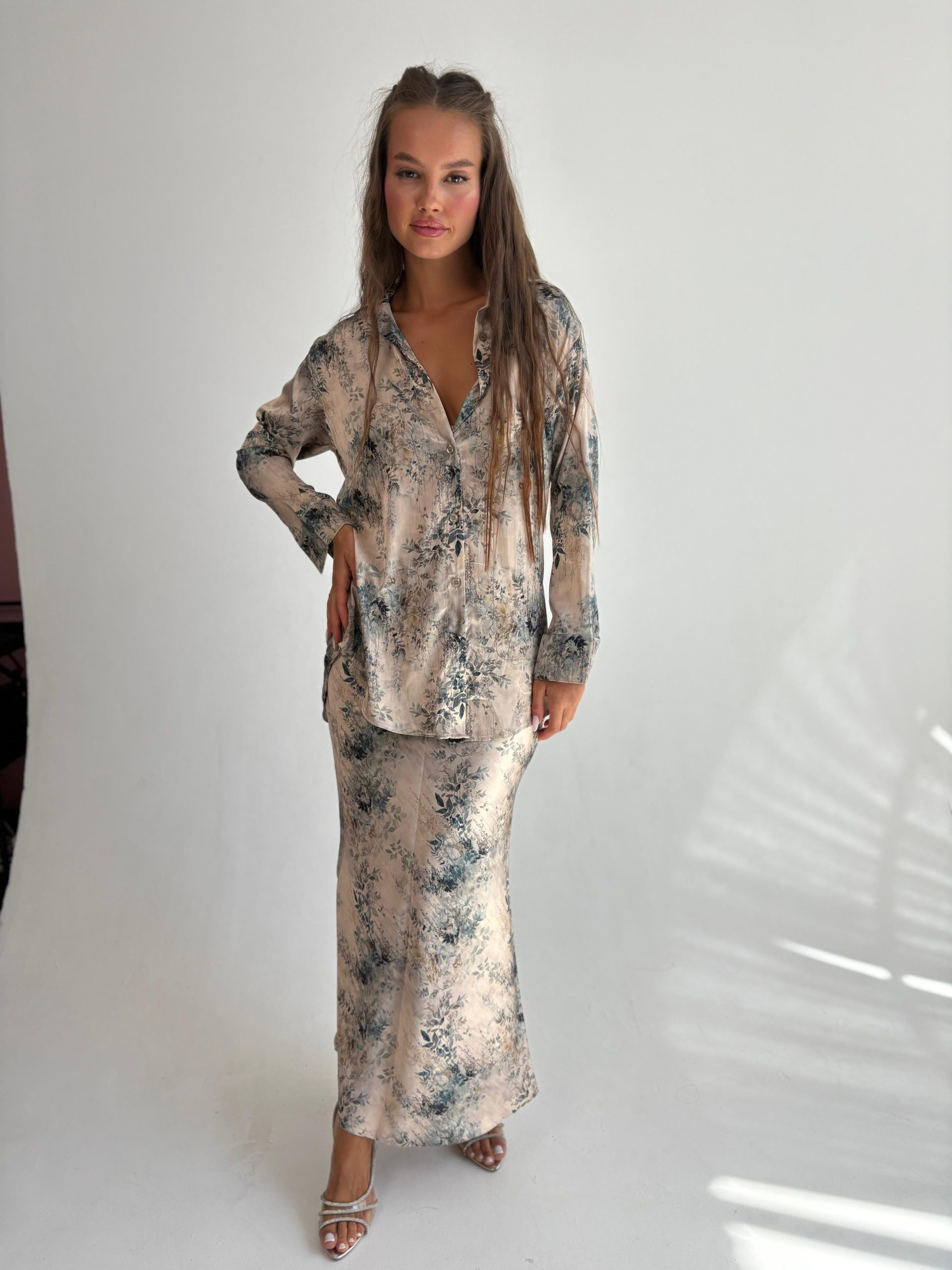 חליפת חצאית מבד סאטן מודפס עם יהלומים, חולצה מכופתרת, צווארון אלגנטי, שרוולים ארוכים, כפתורים בסיומת המנג'ט, חצאית מקסי באורך 1.00, גומי במותן החצאית. החליפה מגיעה במידות S/M/L/XL/XXL ומתאימה עד למידה 44-46/48.