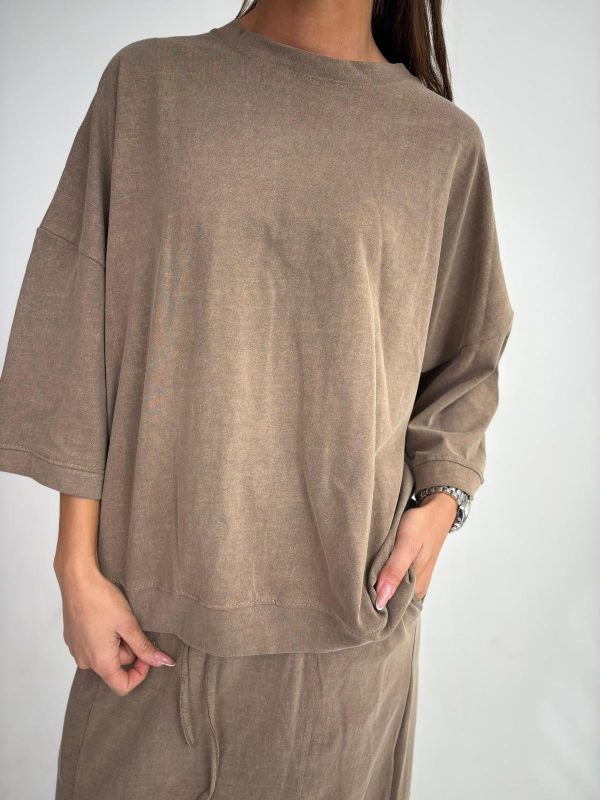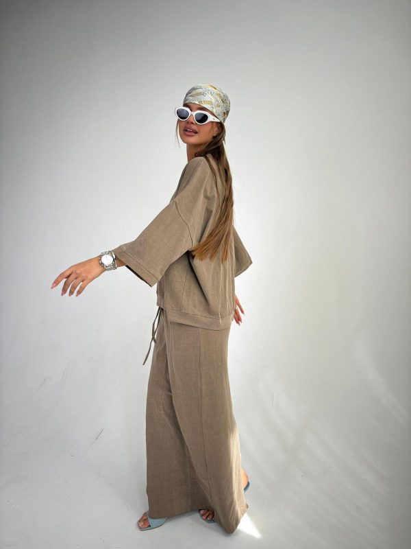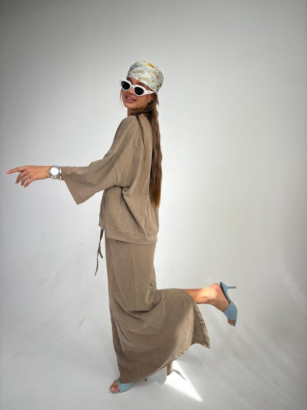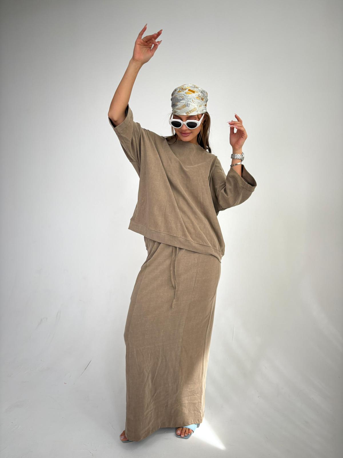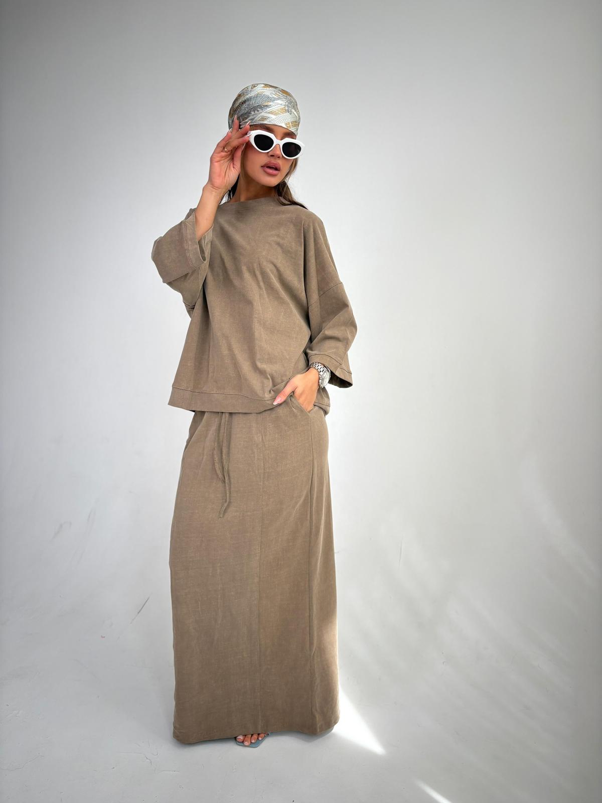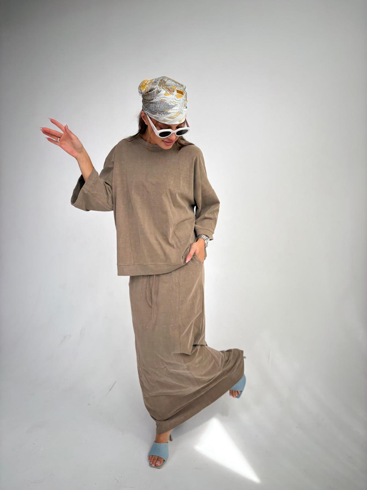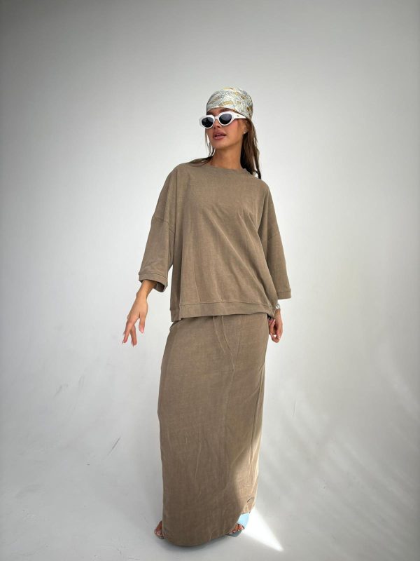 חליפת חצאית מבד כותנה סטון ווש, חולצת אובר סייז עם סיום מנג'ט בשרוולים ובחולצה, שרוולים באורך 3/4, חצאית מקסי בגיזרה ישרה, כיסים ניסתרים בצידי החצאית, גומי במותן, שסע בגב החצאית. החליפה מגיעה במידות S/M/L ומתאימה עד למידה 42-44/46.