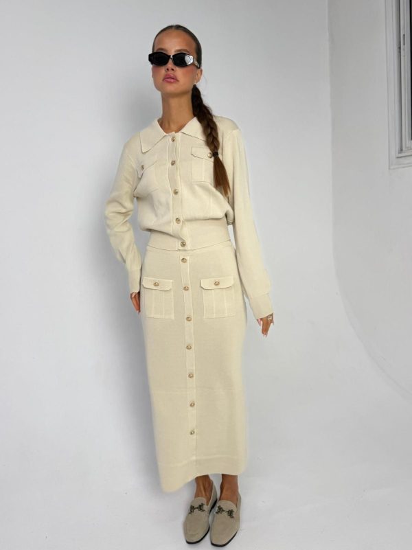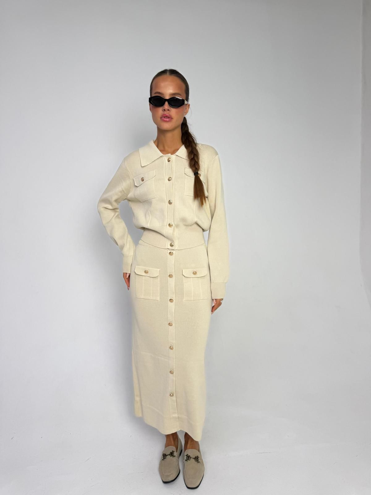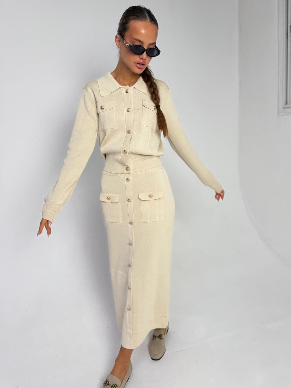 חליפת חצאית סריג מבד סריג לייקרה מחטב, עליונית בגיזרת עטלף אובר סייז, כפתורים בצבע זהב, שרוולים ארוכים, צווארון אלגנטי, כיסים קדמיים, חצאית בגיזרה ישרה מחטבת, כיסים קדמיים, כפתורים זהב. החליפה מגיעה במידה אחת ONE SIZE ומתאימה עד למידה 42-44/46.