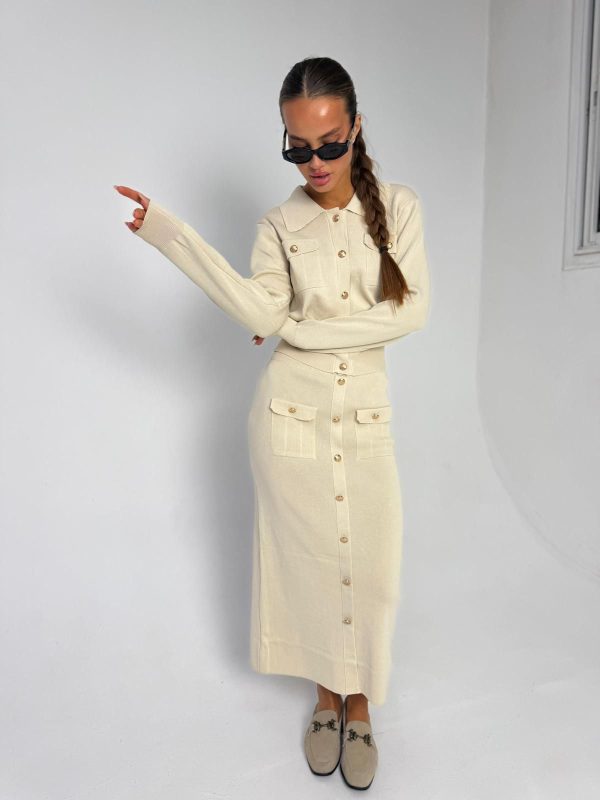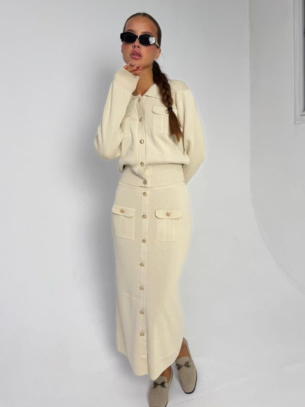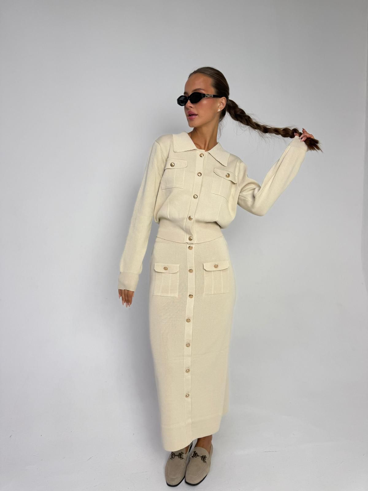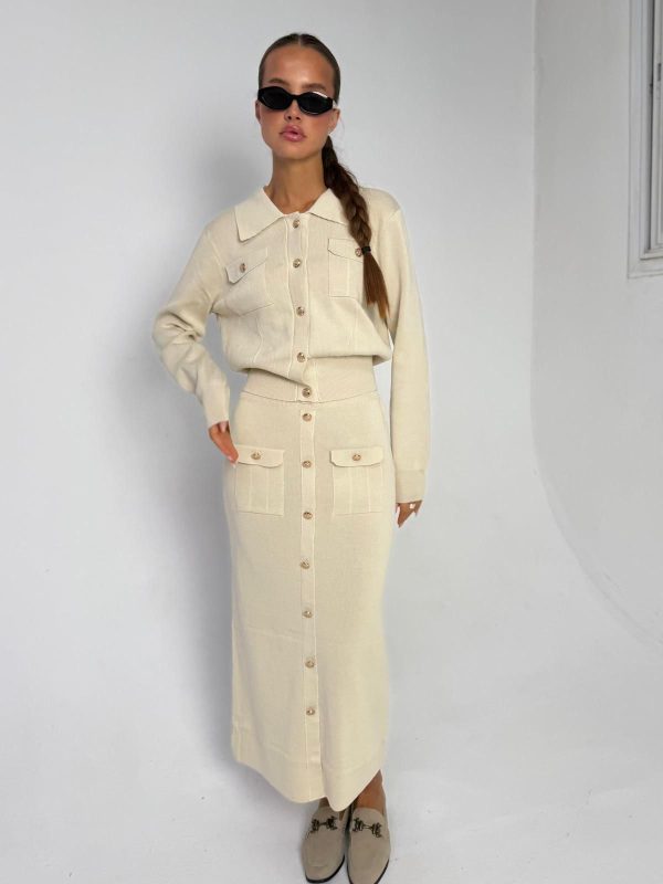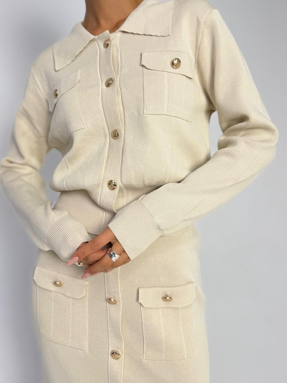 חליפת חצאית סריג מבד סריג לייקרה מחטב, עליונית בגיזרת עטלף אובר סייז, כפתורים בצבע זהב, שרוולים ארוכים, צווארון אלגנטי, כיסים קדמיים, חצאית בגיזרה ישרה מחטבת, כיסים קדמיים, כפתורים זהב. החליפה מגיעה במידה אחת ONE SIZE ומתאימה עד למידה 42-44/46.