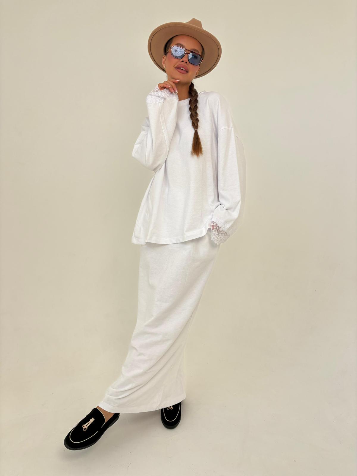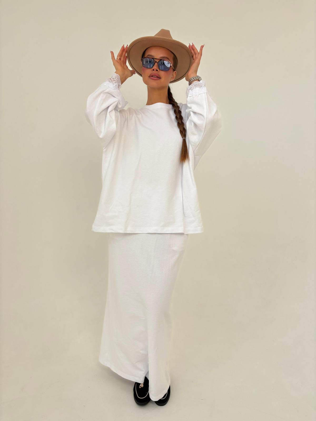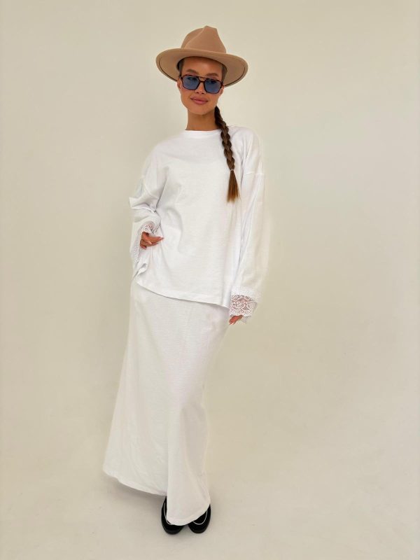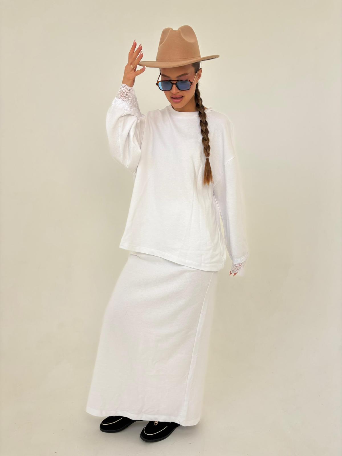 חליפת חצאית צנועה מבד כותנה ג'אקרד, חולצה בגיזרת אובר סייז עם צווארון עגול, שרוולים 7/8 עם סיומת תחרה בצביעה, חצאית בגיזרה ישרה עם גומי במותן, כיסים ניסתרים בצידי החצאית. החליפה מגיעה במידות S/M/L/XL ומתאימה עד למידה 44-46/48.