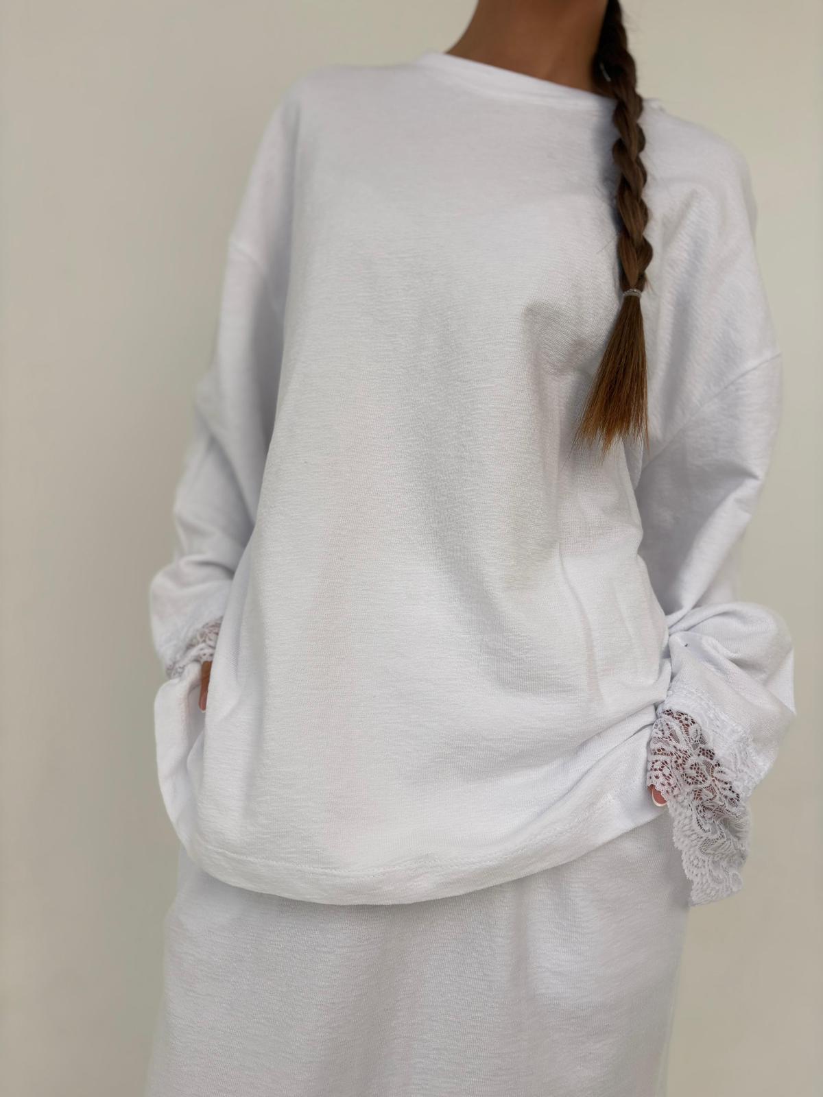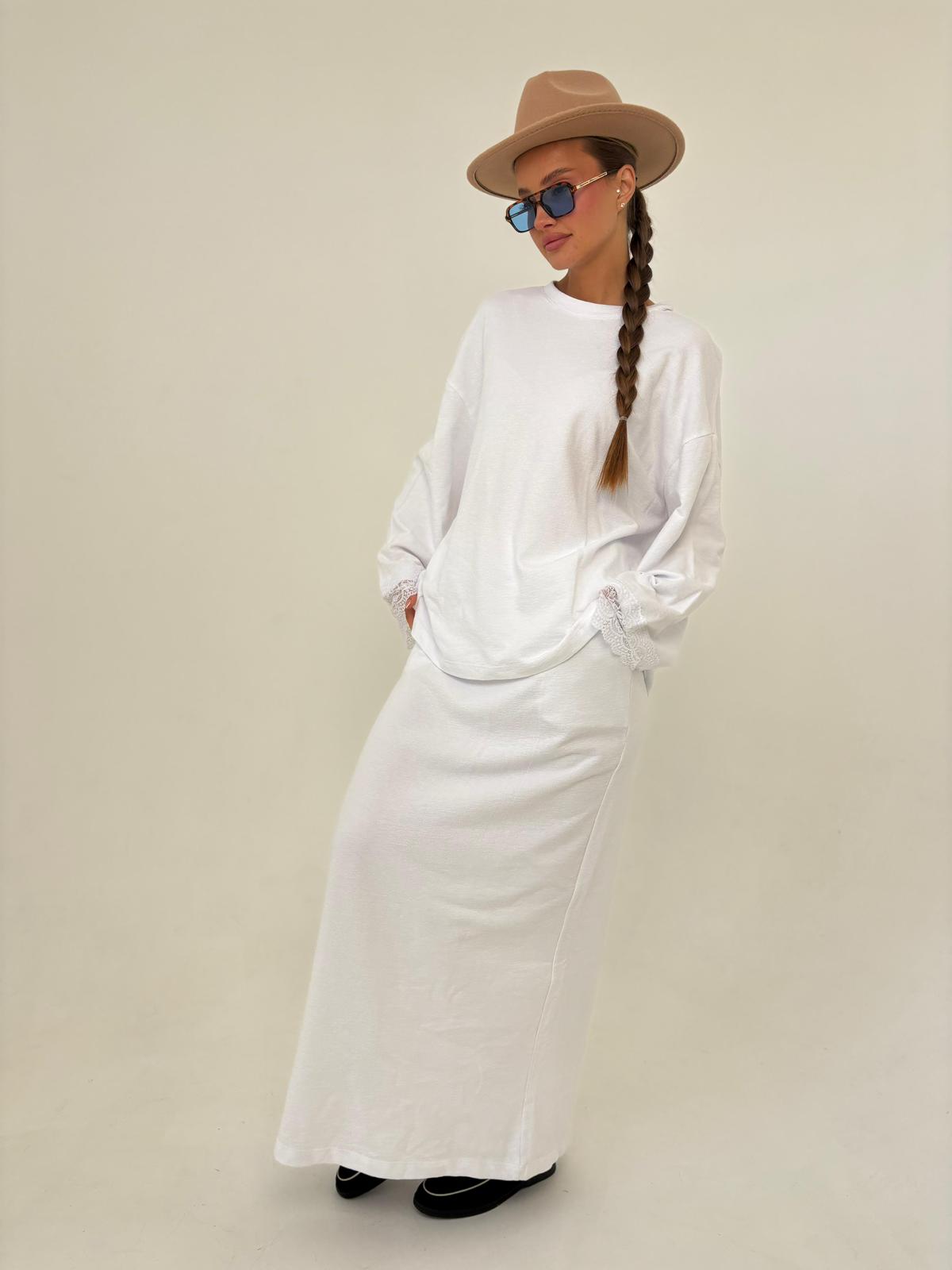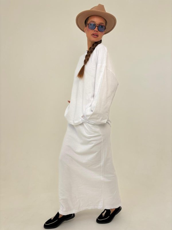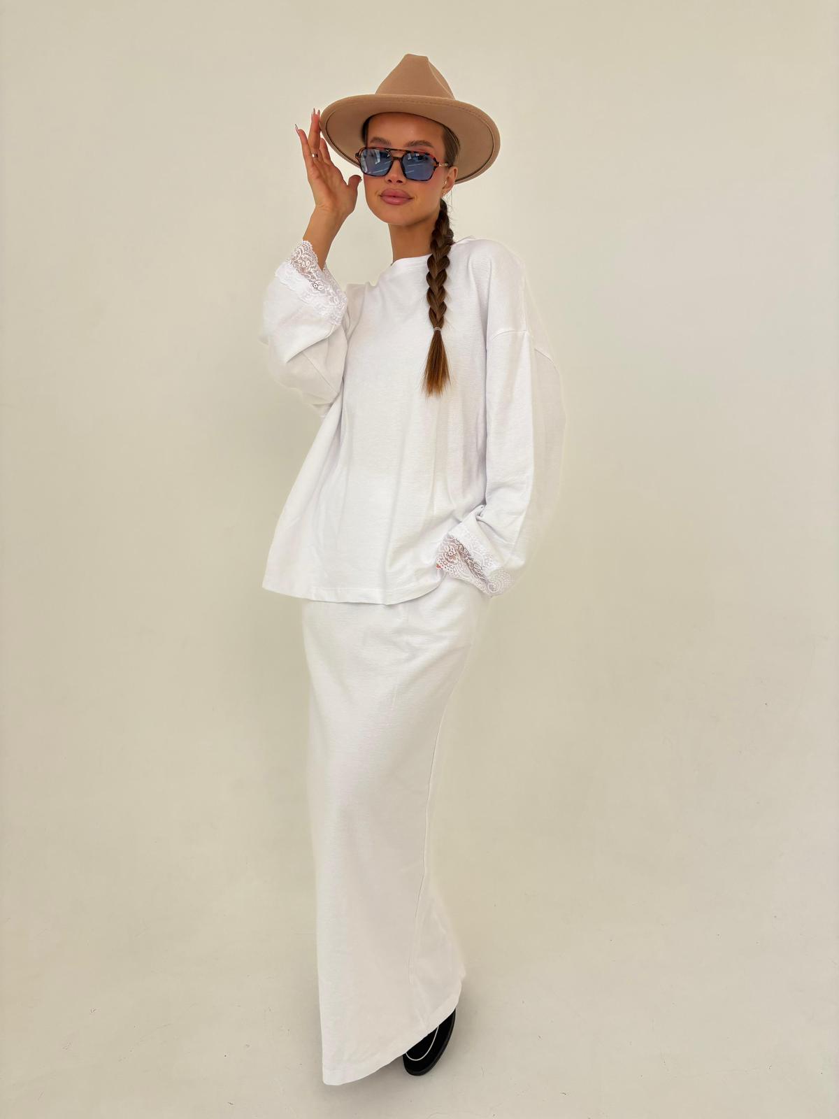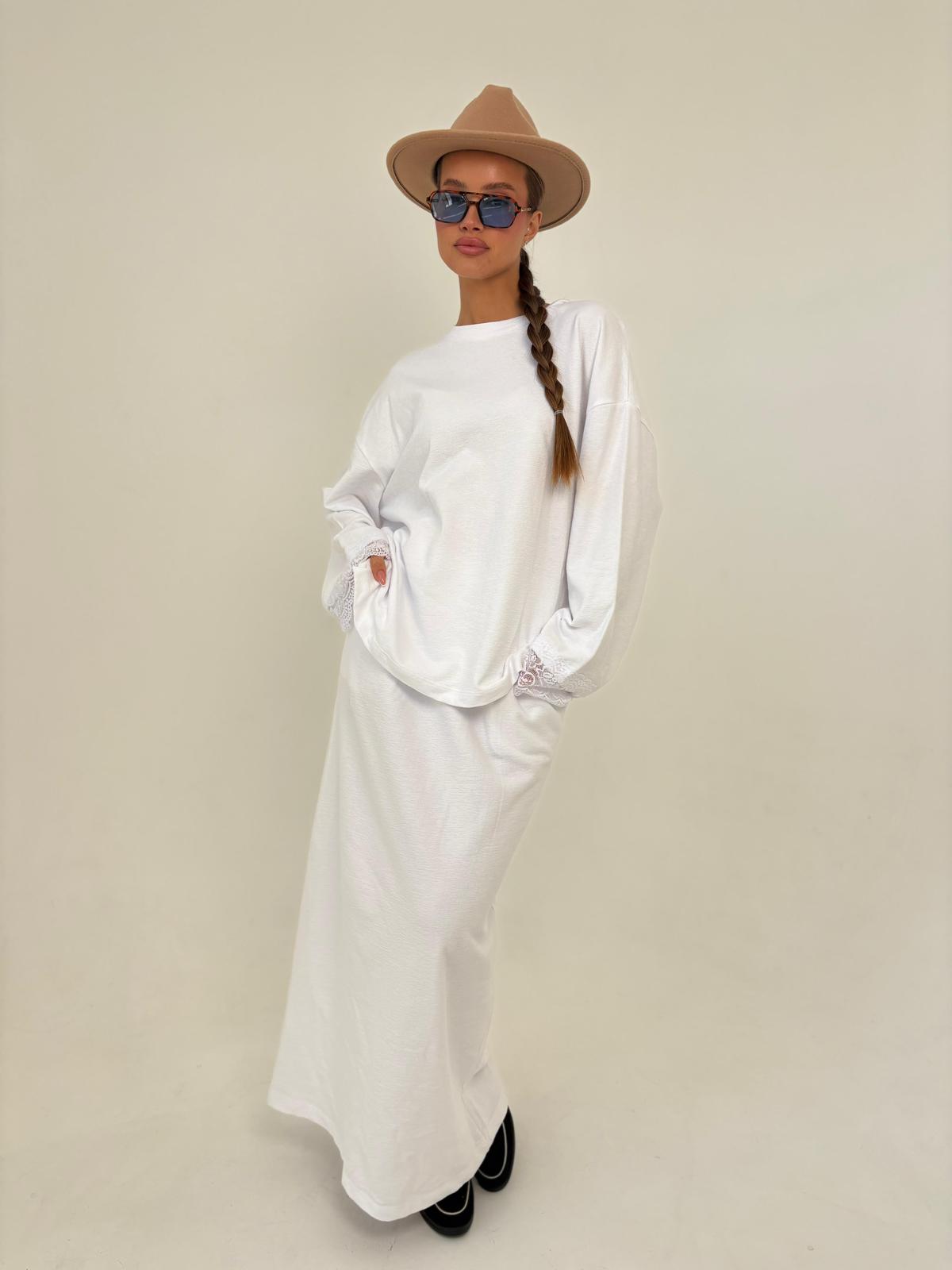 חליפת חצאית צנועה מבד כותנה ג'אקרד, חולצה בגיזרת אובר סייז עם צווארון עגול, שרוולים 7/8 עם סיומת תחרה בצביעה, חצאית בגיזרה ישרה עם גומי במותן, כיסים ניסתרים בצידי החצאית. החליפה מגיעה במידות S/M/L/XL ומתאימה עד למידה 44-46/48.