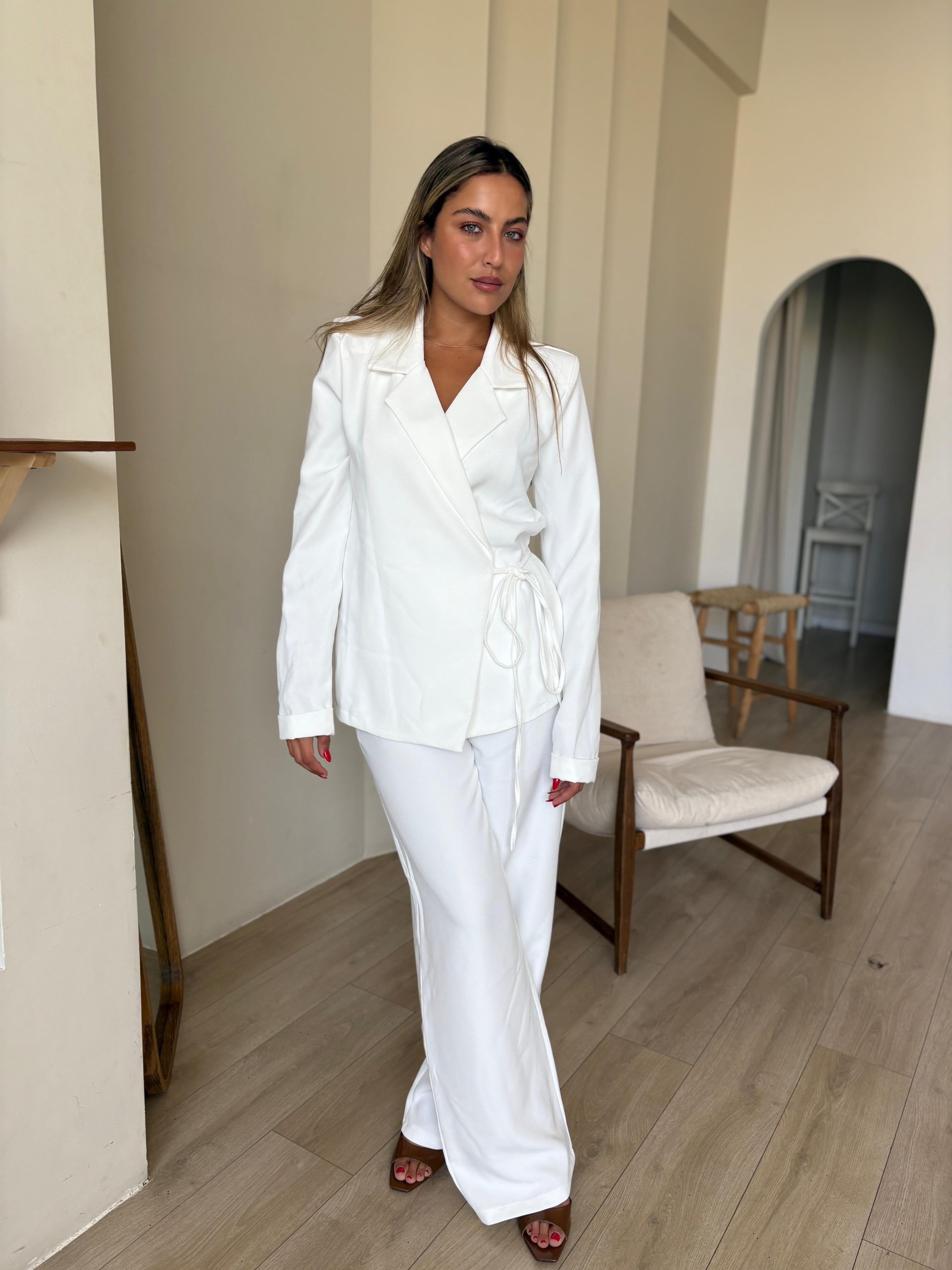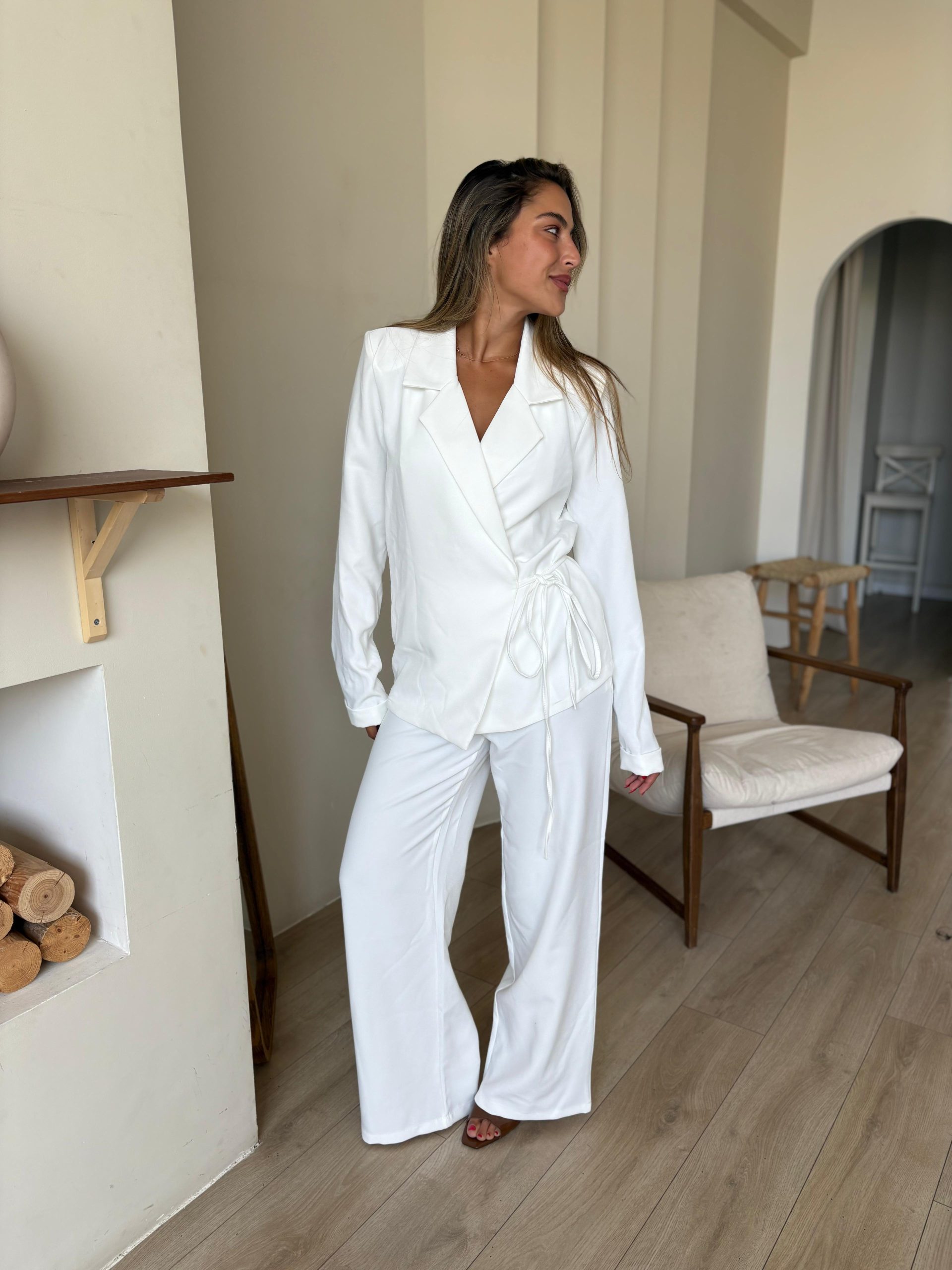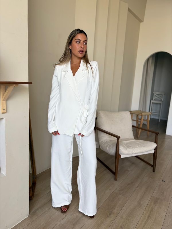 חליפת מכנס מבד אריג קייצי, ג'קט מחויט בגיזרת מעטפה, שרוולים ארוכים, מנג'ט מקופל, כריות בכתפיים, מכנס ארוך בגיזרה גבוה, גומי במותן, כיסים ניסתרים בצידי המכנס. החליפה מגיעה במידות S/M/L/XL/XXL ומתאימה עד למידה 44-46/48.