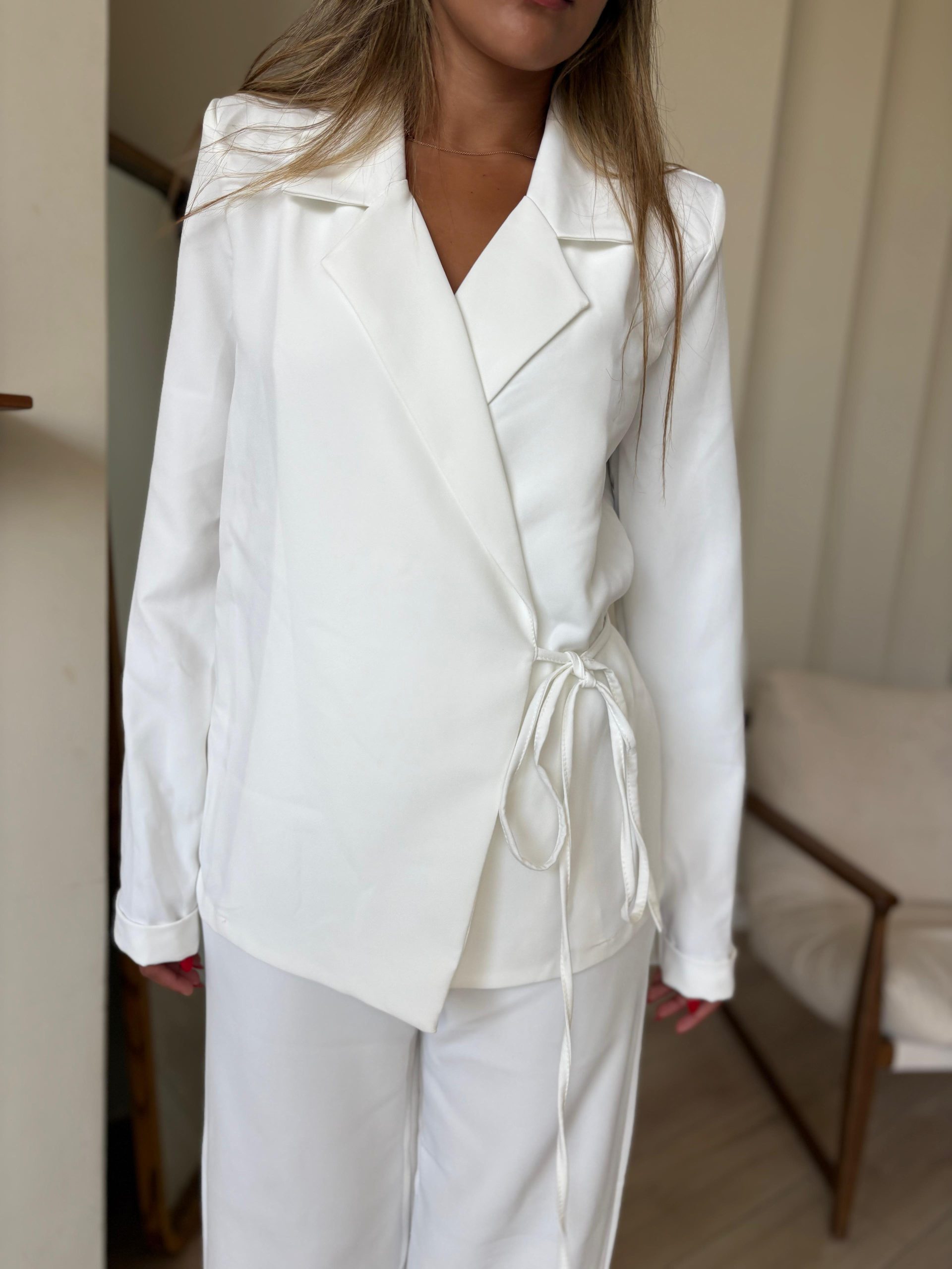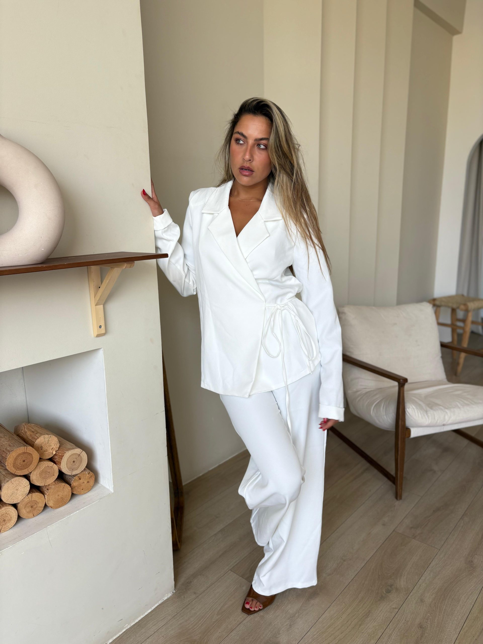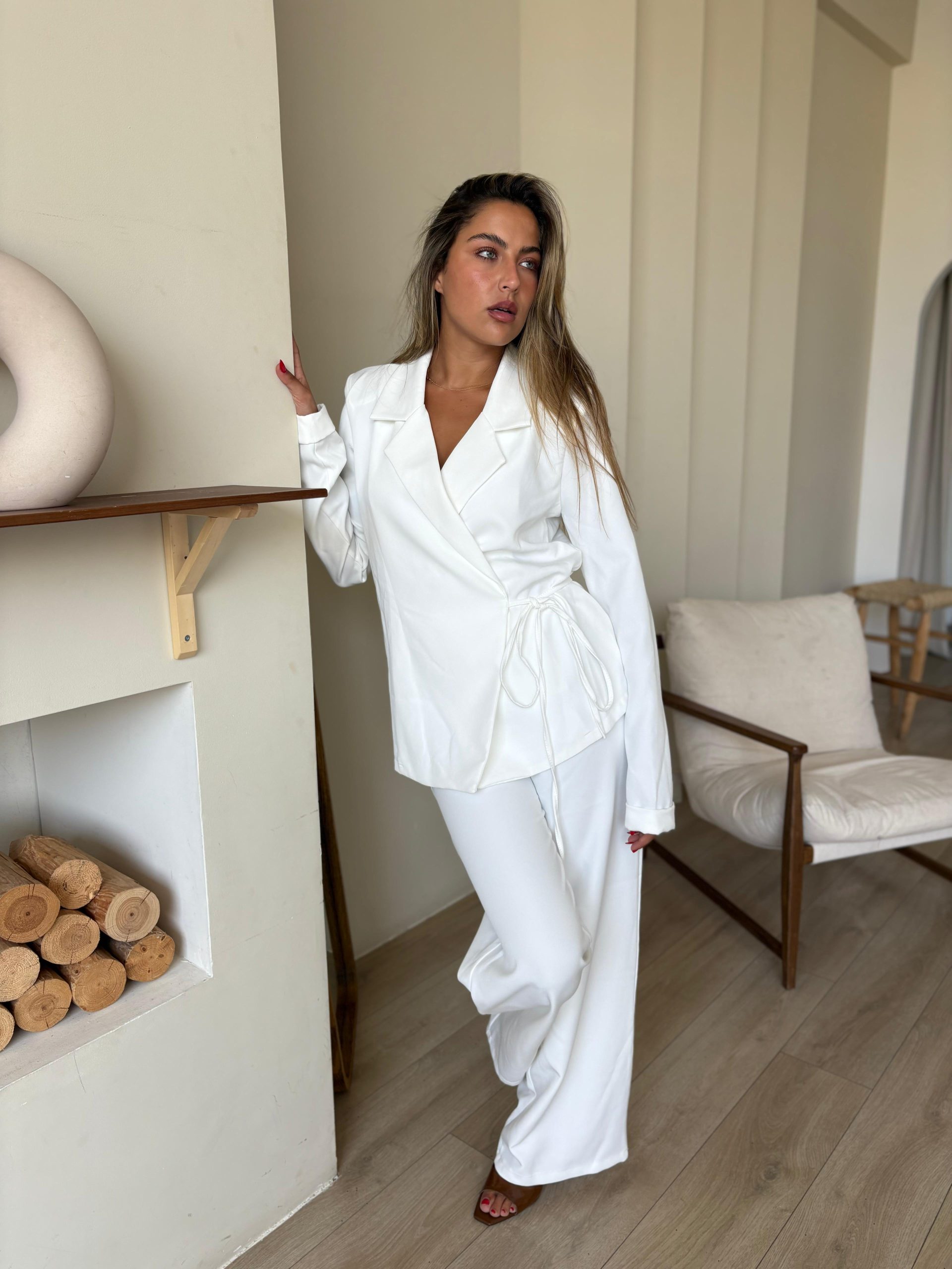 חליפת מכנס מבד אריג קייצי, ג'קט מחויט בגיזרת מעטפה, שרוולים ארוכים, מנג'ט מקופל, כריות בכתפיים, מכנס ארוך בגיזרה גבוה, גומי במותן, כיסים ניסתרים בצידי המכנס. החליפה מגיעה במידות S/M/L/XL/XXL ומתאימה עד למידה 44-46/48.