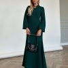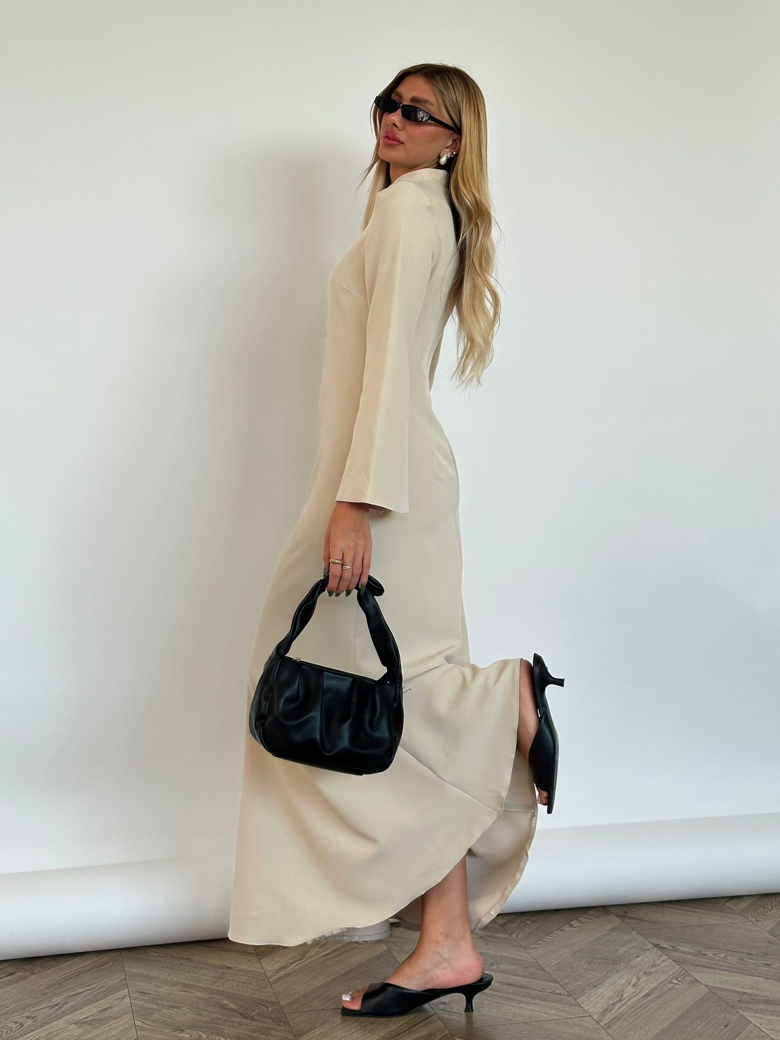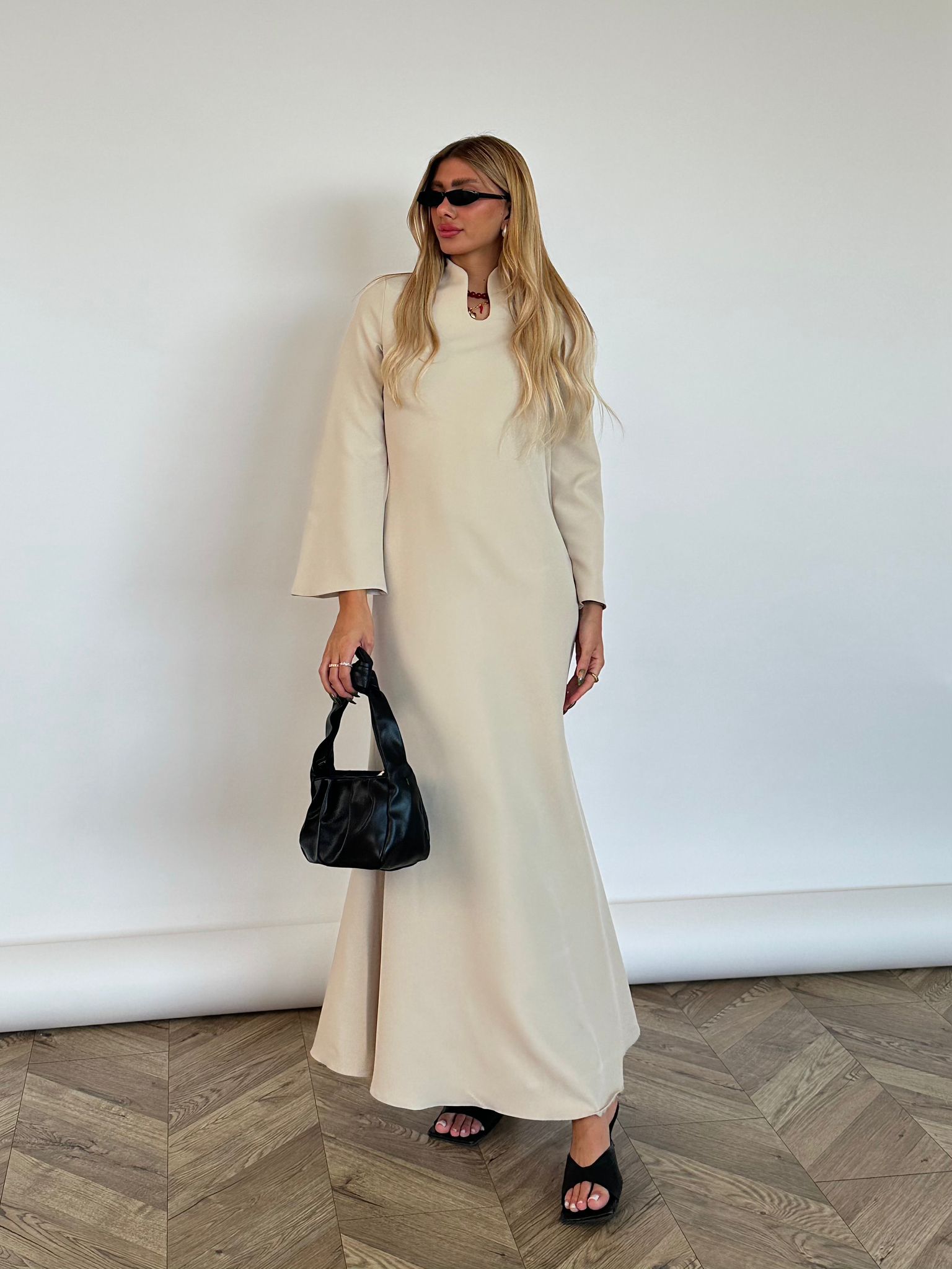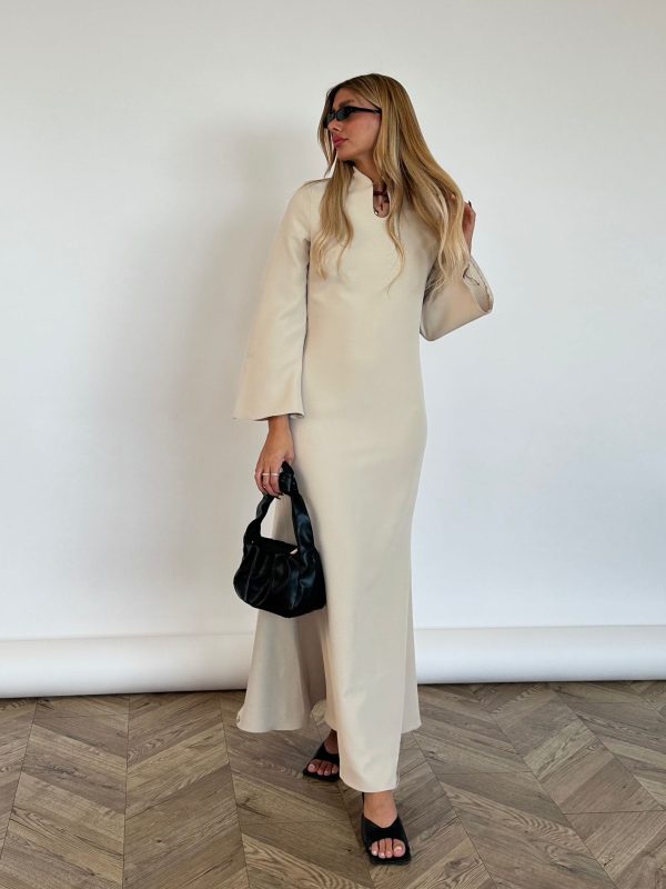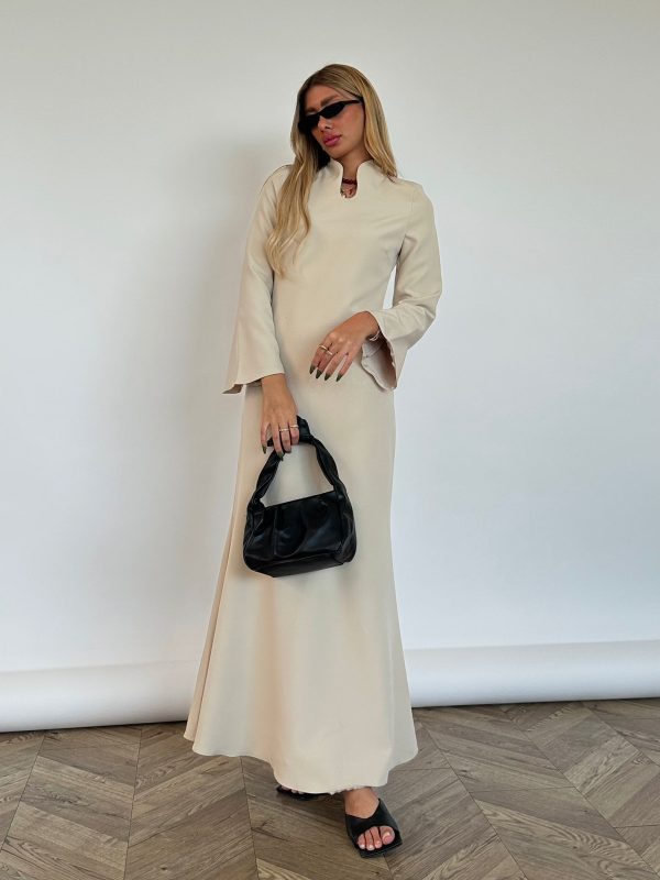 שמלת מקסי מבד אריג מונקו, צווארון צף, פתח בחזה בצורת אליפסה, (סיכת טיפה אופציה מגיעה עם השמלה), שרוולים ארוכים בצורת פעמון, רוכסן ניסתר בגב השמלה, מתפרים בגב השמלה לחיטוב השמלה. השמלה מגיעה במידות S/M/L/XL ומתאימה עד למידה 42-44.