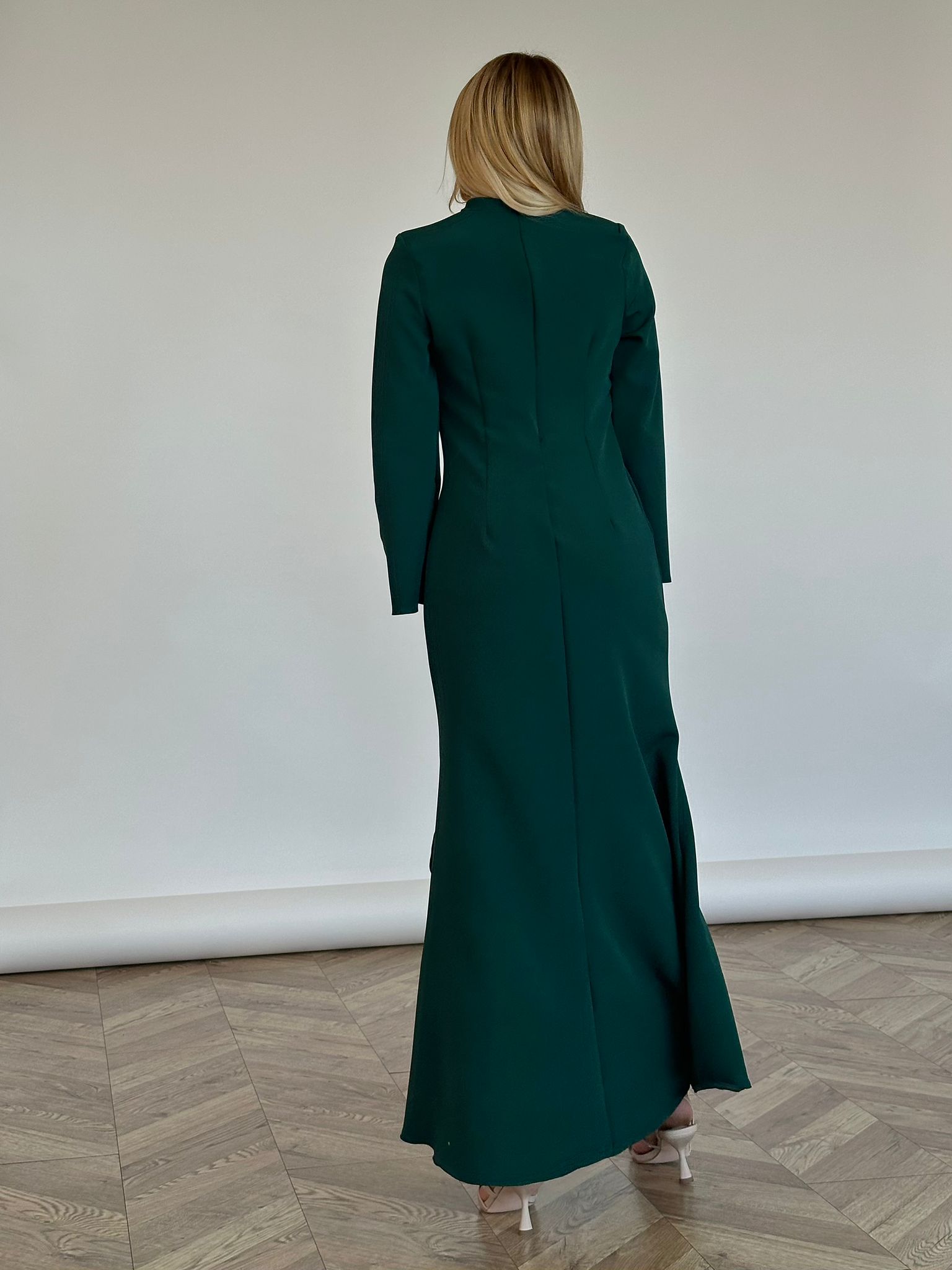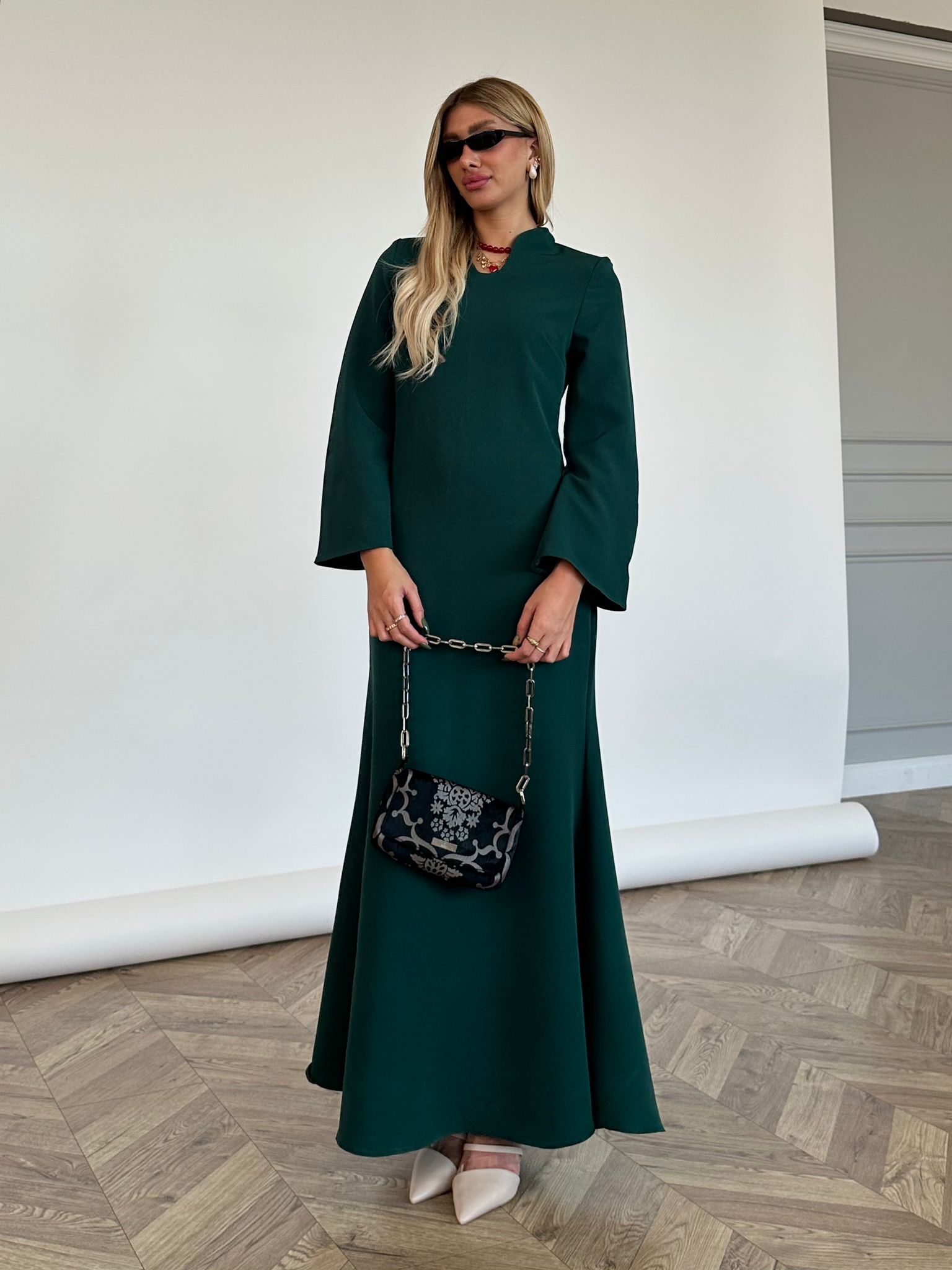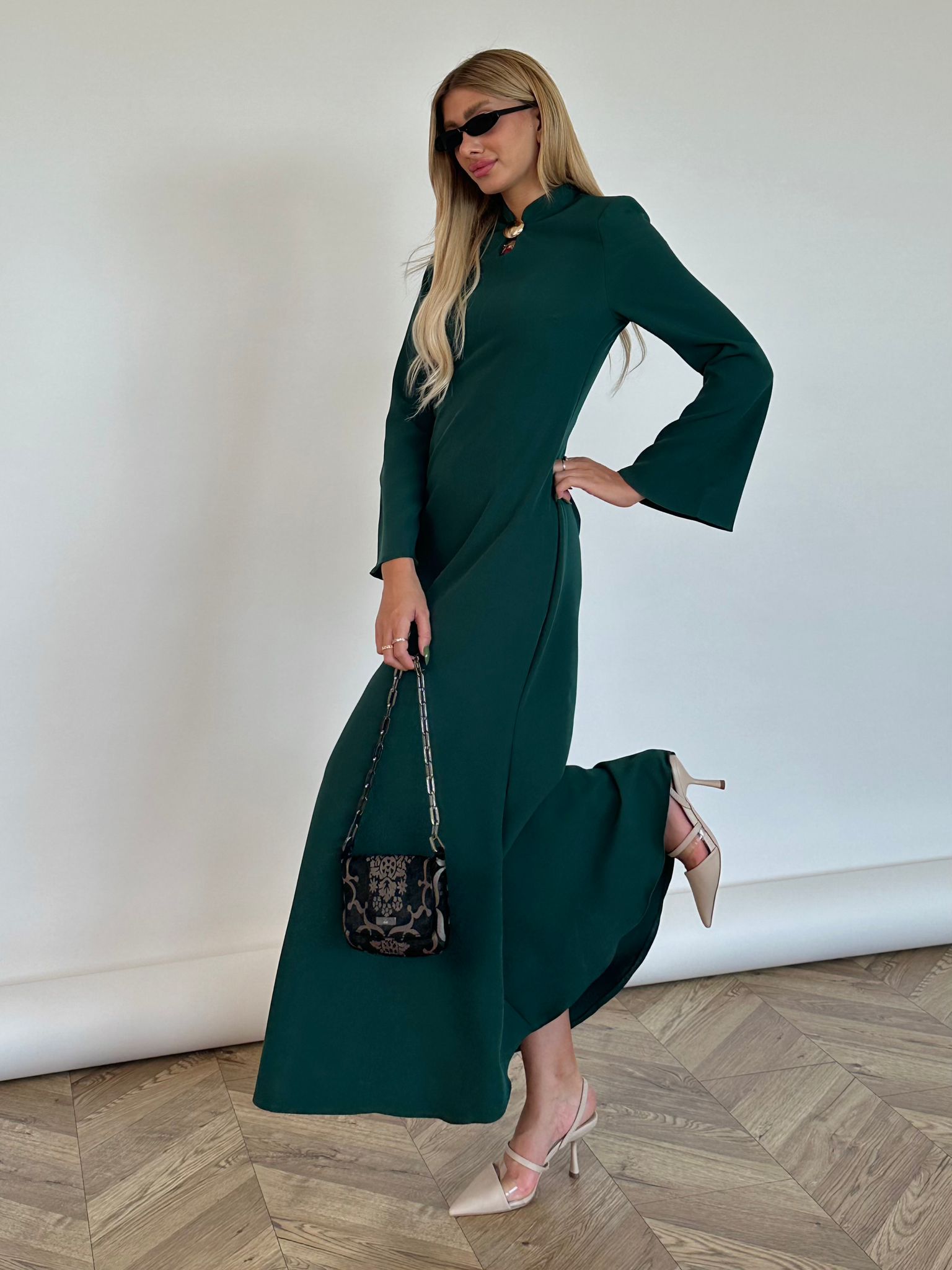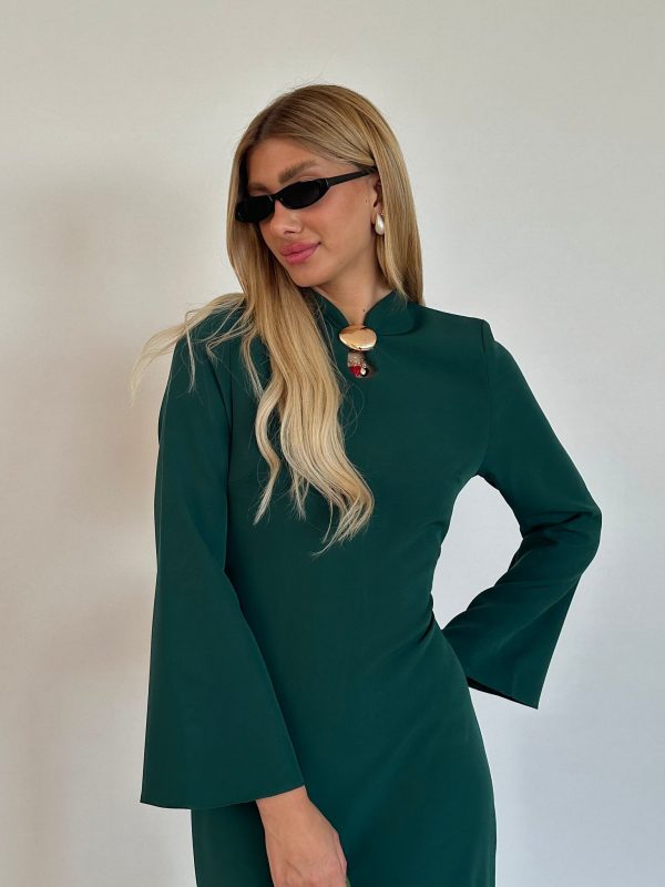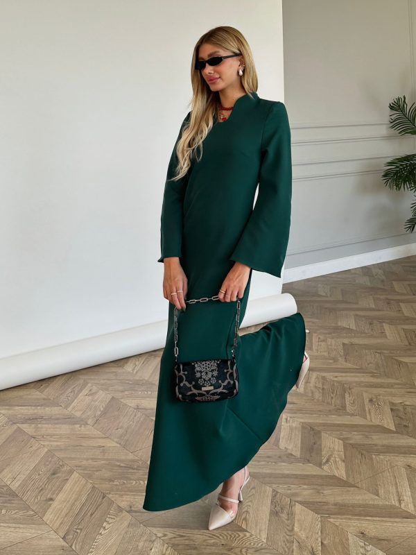 שמלת מקסי מבד אריג מונקו, צווארון צף, פתח בחזה בצורת אליפסה, (סיכת טיפה אופציה מגיעה עם השמלה), שרוולים ארוכים בצורת פעמון, כריות ספוג מובנות, רוכסן ניסתר בגב השמלה, מתפרים בגב השמלה לחיטוב השמלה. השמלה מגיעה במידות S/M/L/XL ומתאימה עד למידה 42-44.