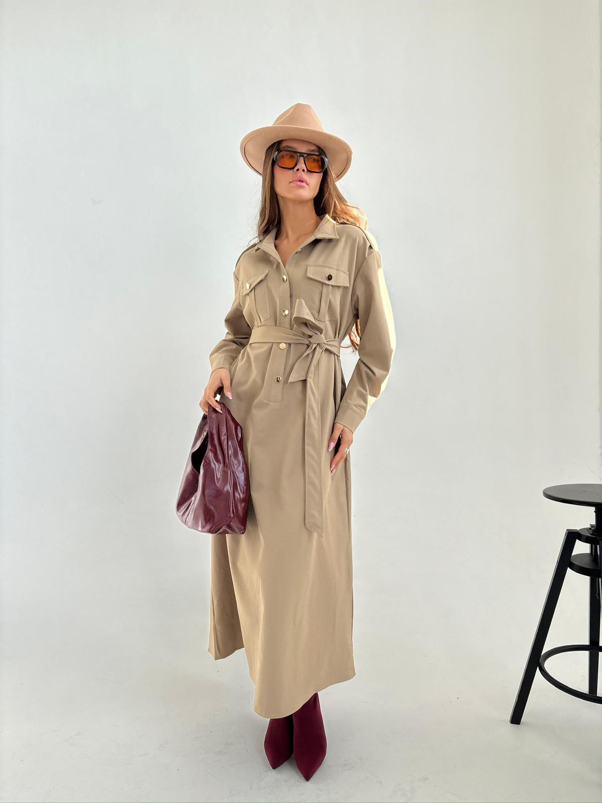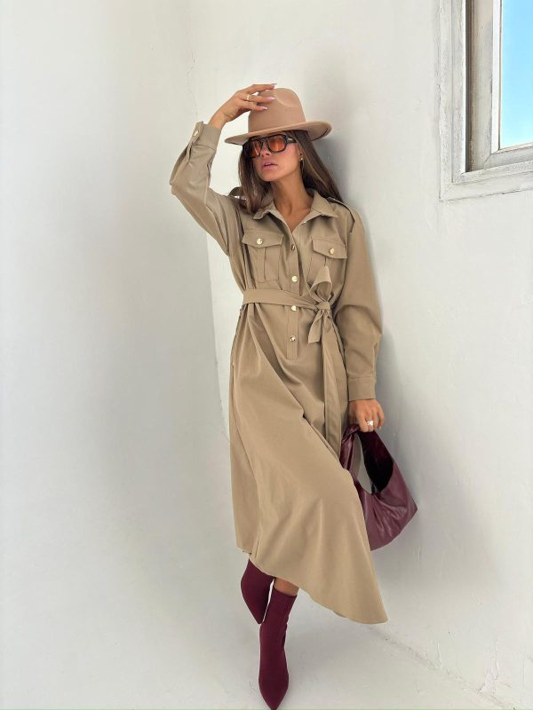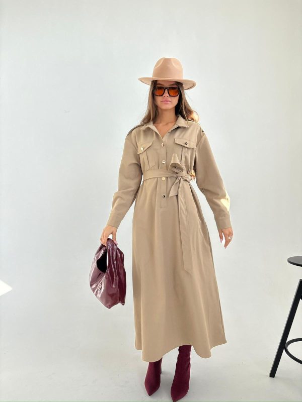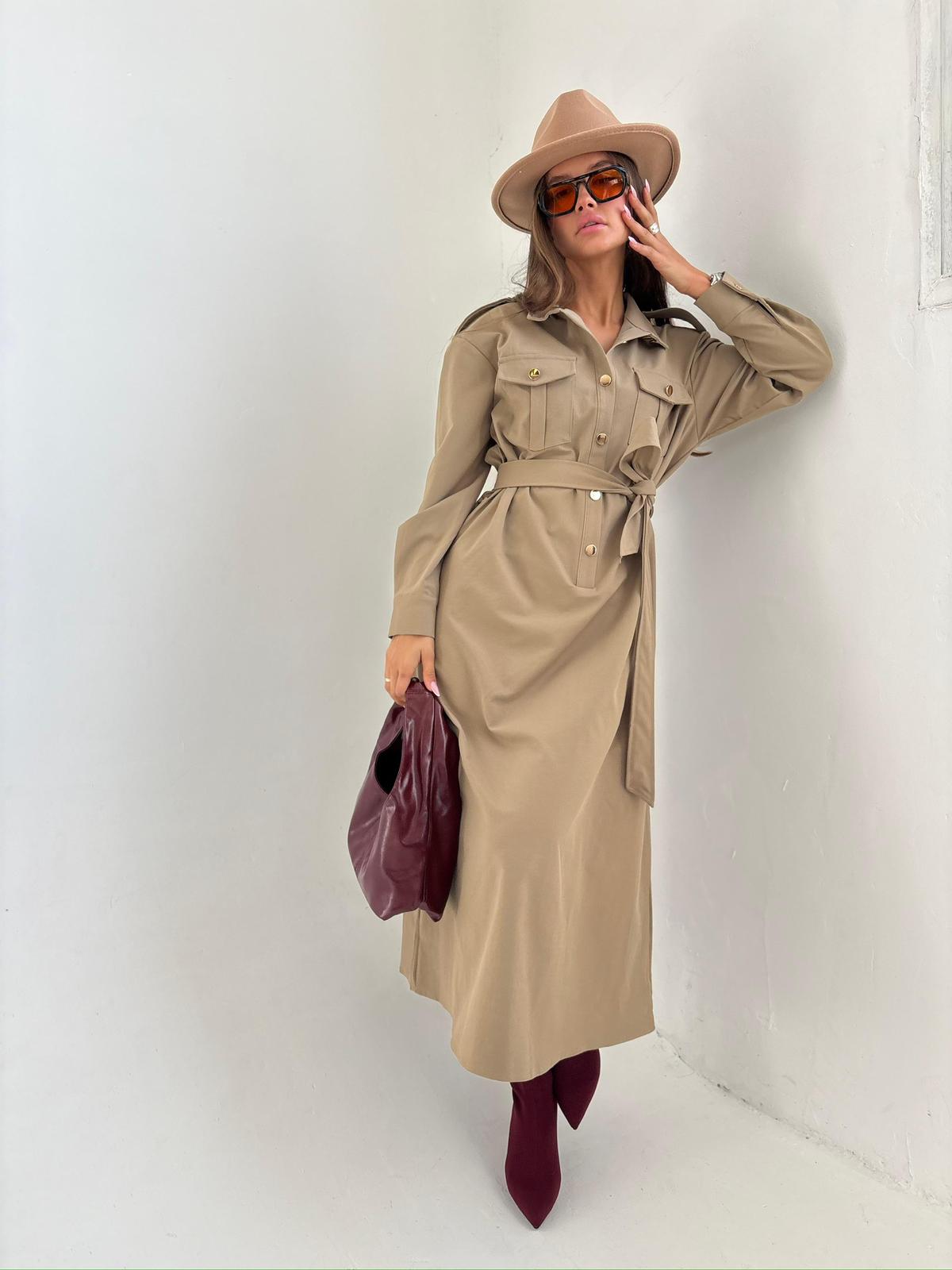 שמלת מקסי מבד אריג מחויט בגיזרת אובר סייז רחבה, שרוולים ארוכים עם סיומת מנג'ט וסגירת כפתור, צווארון אלגנטי גבוה, כפתורים קידמיים בצבע זהב, 2 כיסים קידמיים עם סגירה, כותפות בכתפיים עם סגירת כפתורים, כיסים ניסתרים בצידי השמלה, חגורה תואמת להידוק. השמלה מגיעה במידות M/L/XL ומתאימה עד למידה 46-48/50.