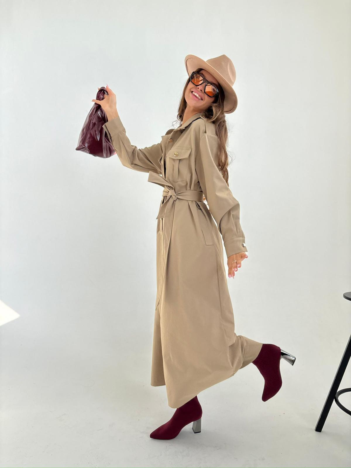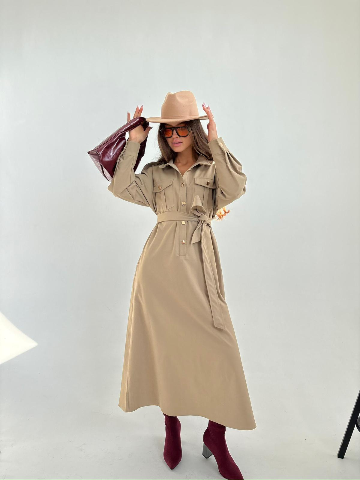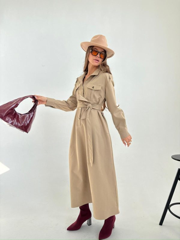 שמלת מקסי מבד אריג מחויט בגיזרת אובר סייז רחבה, שרוולים ארוכים עם סיומת מנג'ט וסגירת כפתור, צווארון אלגנטי גבוה, כפתורים קידמיים בצבע זהב, 2 כיסים קידמיים עם סגירה, כותפות בכתפיים עם סגירת כפתורים, כיסים ניסתרים בצידי השמלה, חגורה תואמת להידוק. השמלה מגיעה במידות M/L/XL ומתאימה עד למידה 46-48/50.