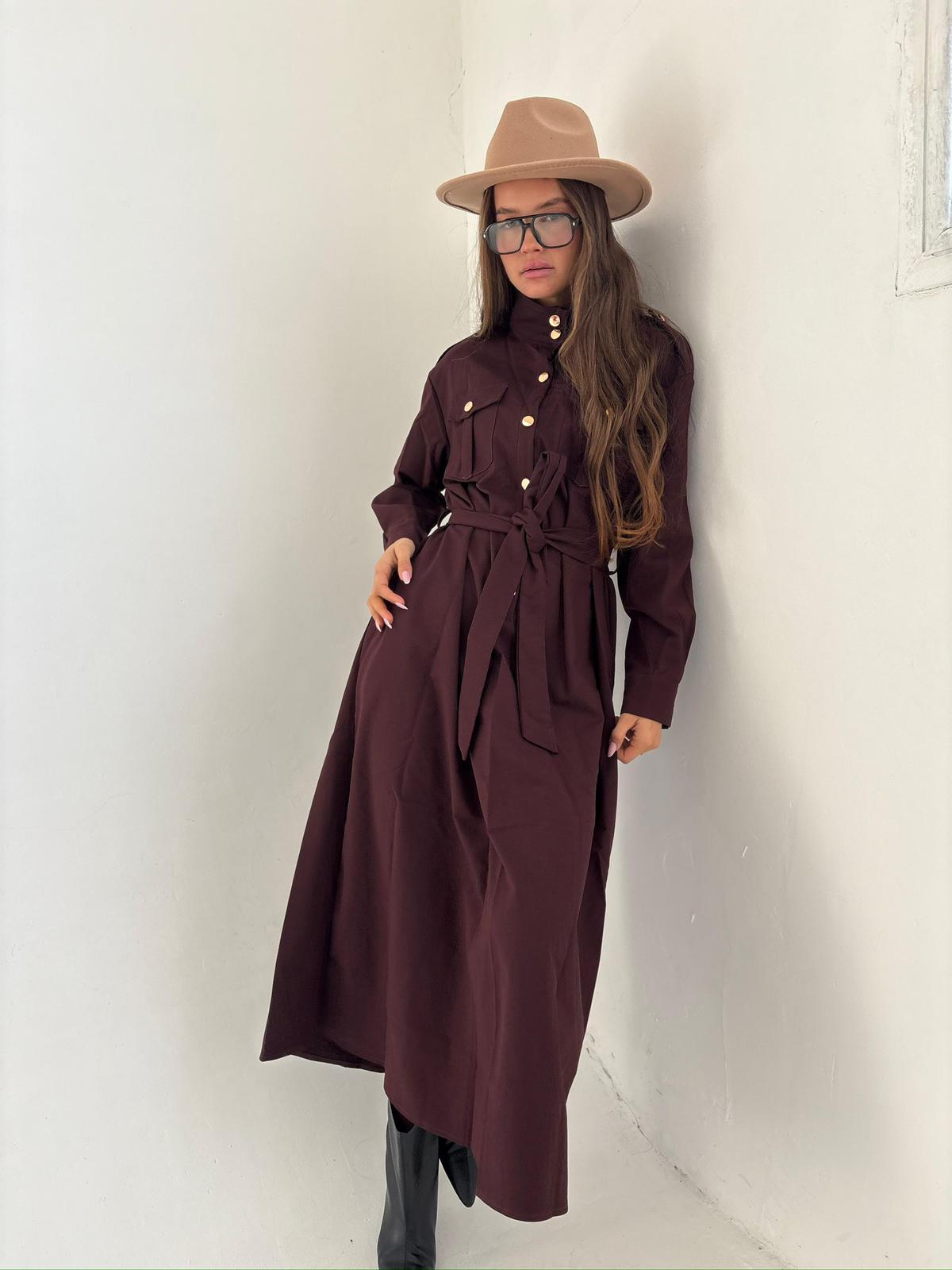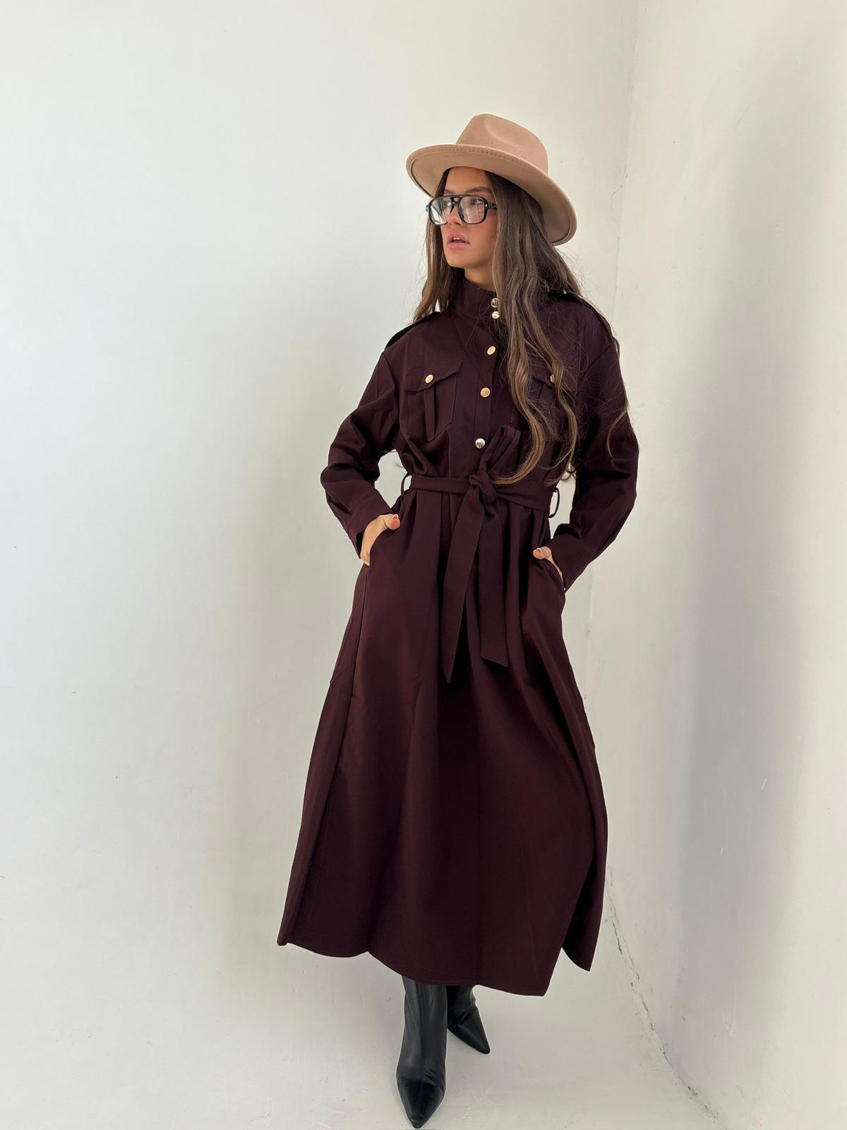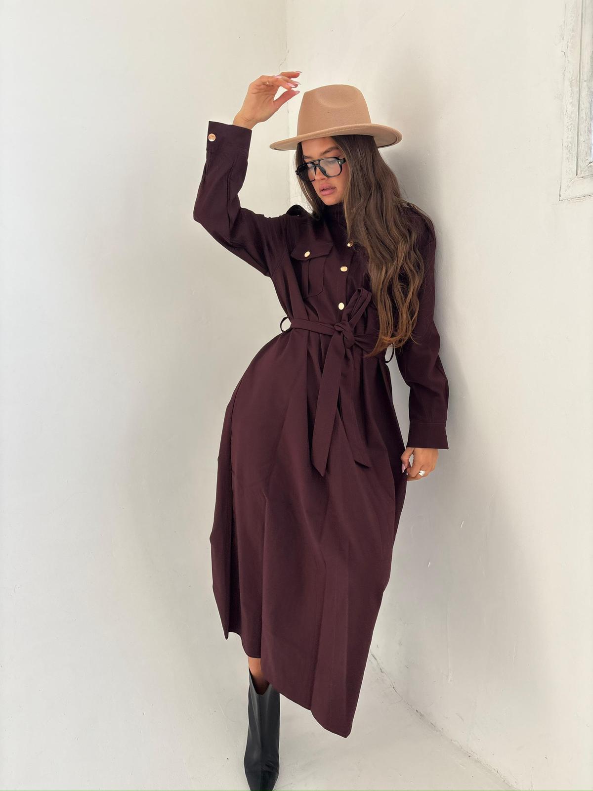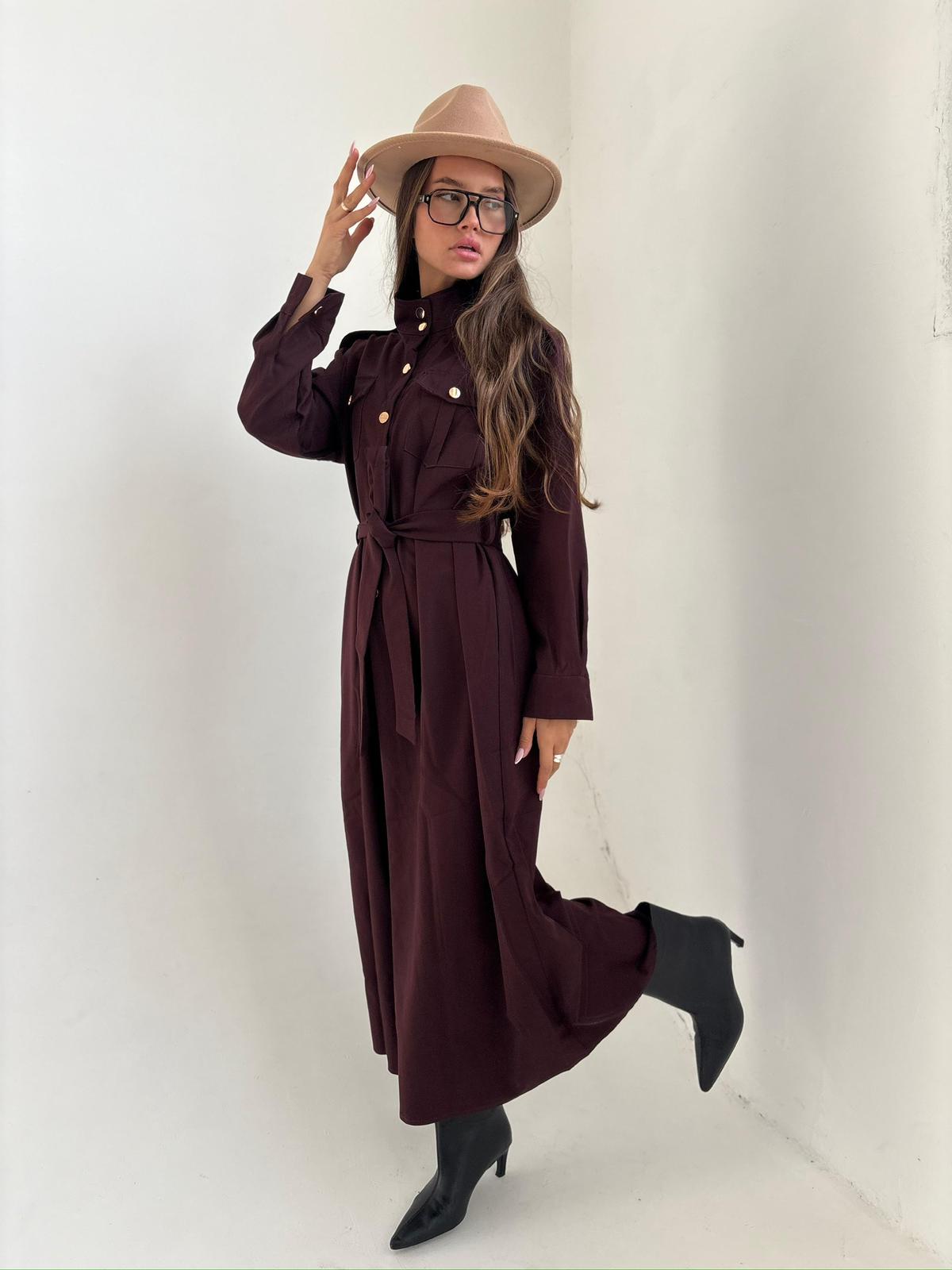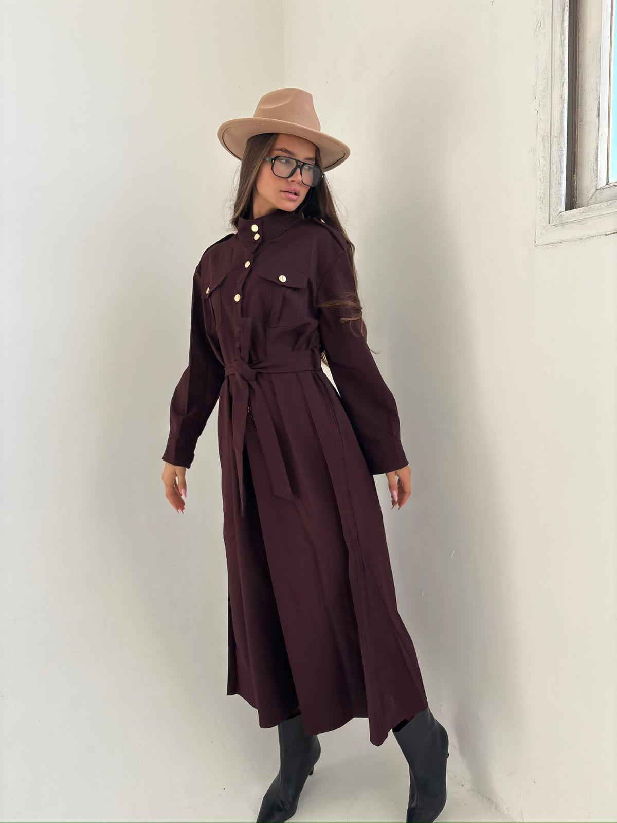 שמלת מקסי מבד אריג מחויט בגיזרת אובר סייז רחבה, שרוולים ארוכים עם סיומת מנג'ט וסגירת כפתור, צווארון אלגנטי גבוה, כפתורים קידמיים בצבע זהב, 2 כיסים קידמיים עם סגירה, כותפות בכתפיים עם סגירת כפתורים, כיסים ניסתרים בצידי השמלה, חגורה תואמת להידוק. השמלה מגיעה במידות M/L/XL ומתאימה עד למידה 46-48/50.