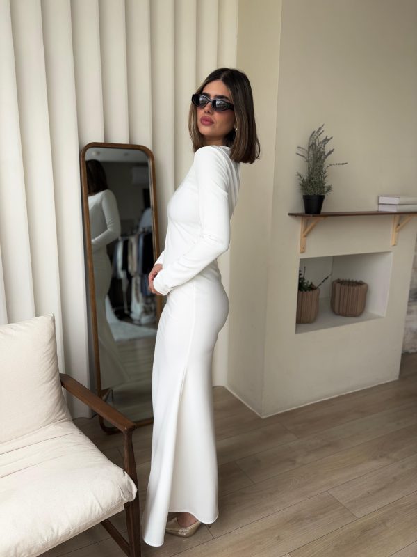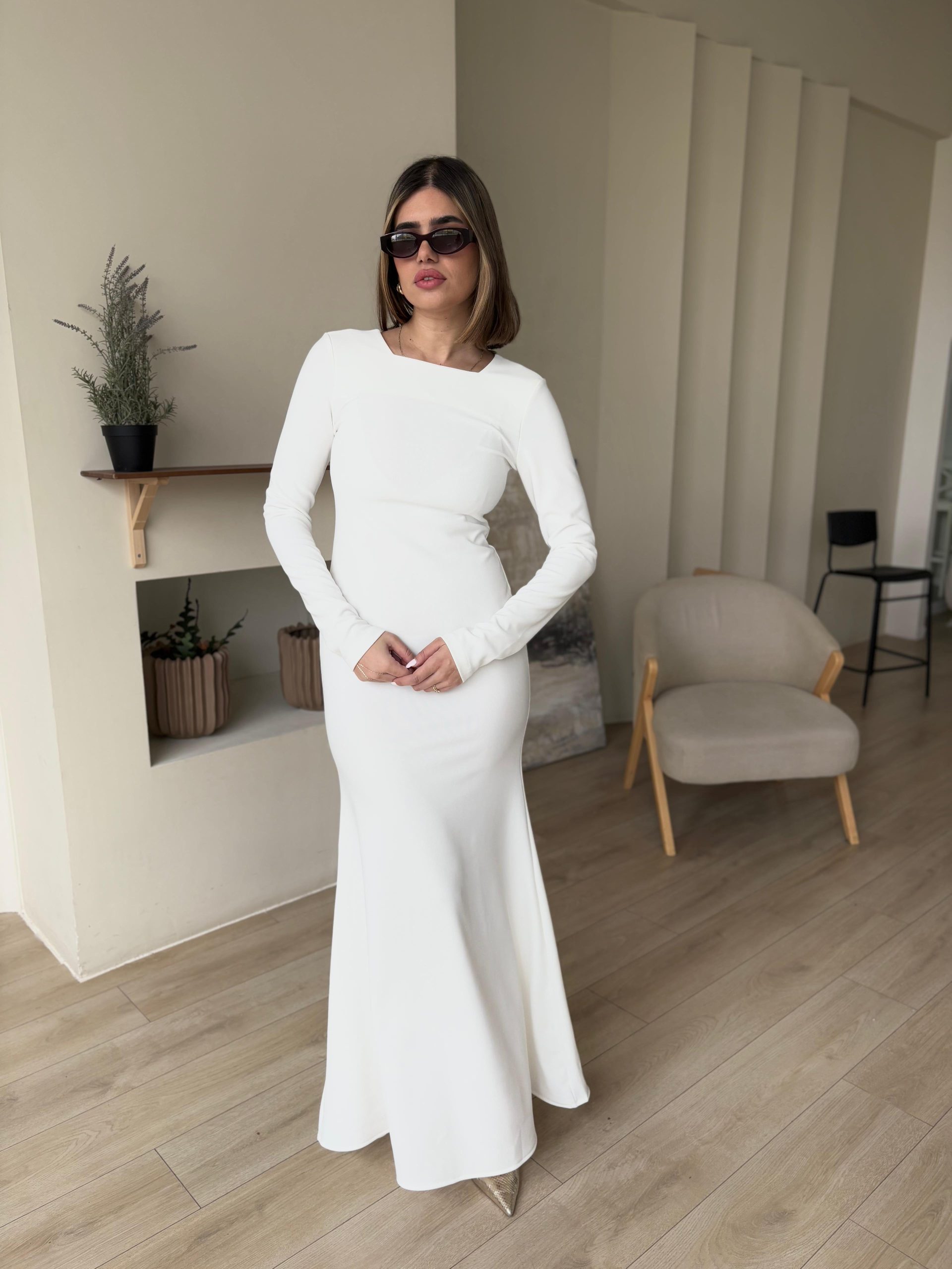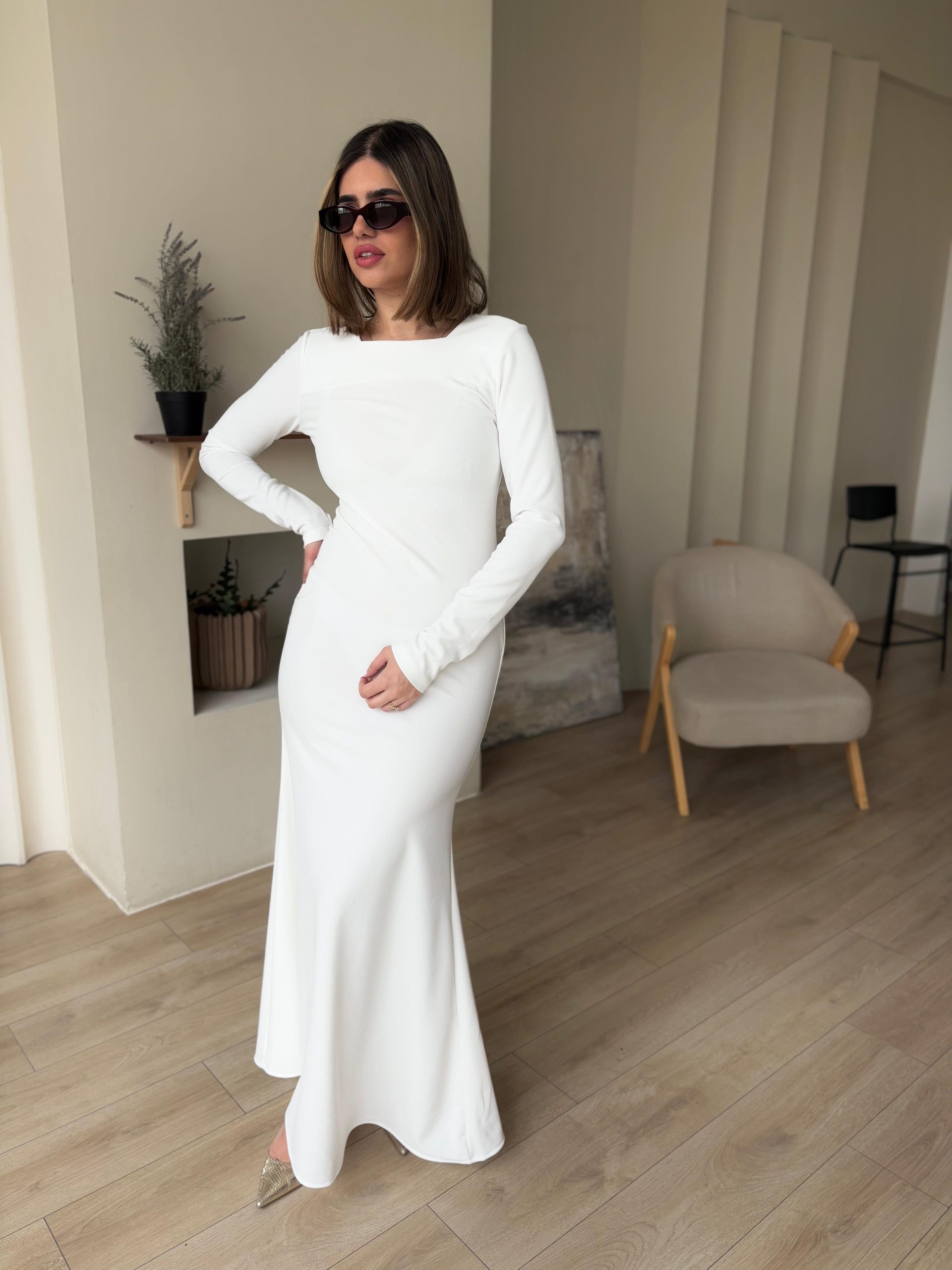 שמלת ערב באורך מקסי בגיזרה צמודה מבד לייקרה מחטב, צווארון מרובע שרוולים ארוכים, רוכסן ניסתר בגב השמלה. השמלה מגיעה במידות S/M/L/XL/XXL ומתאימה עד למידה 44-46.