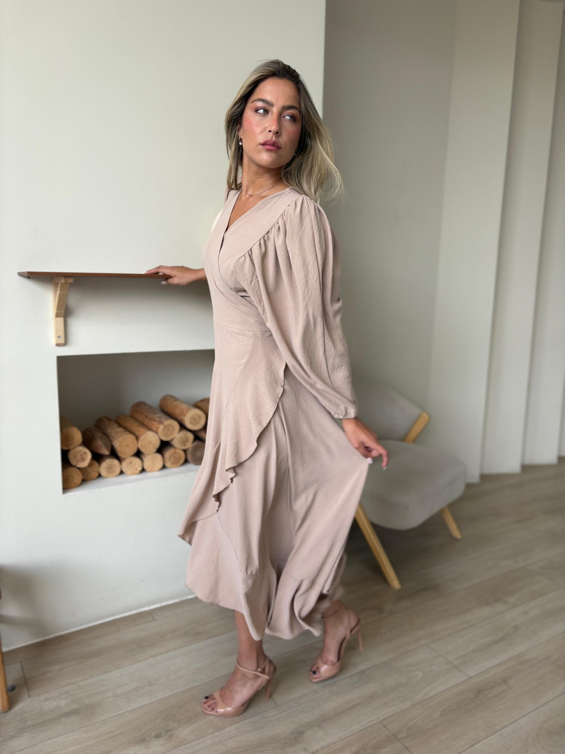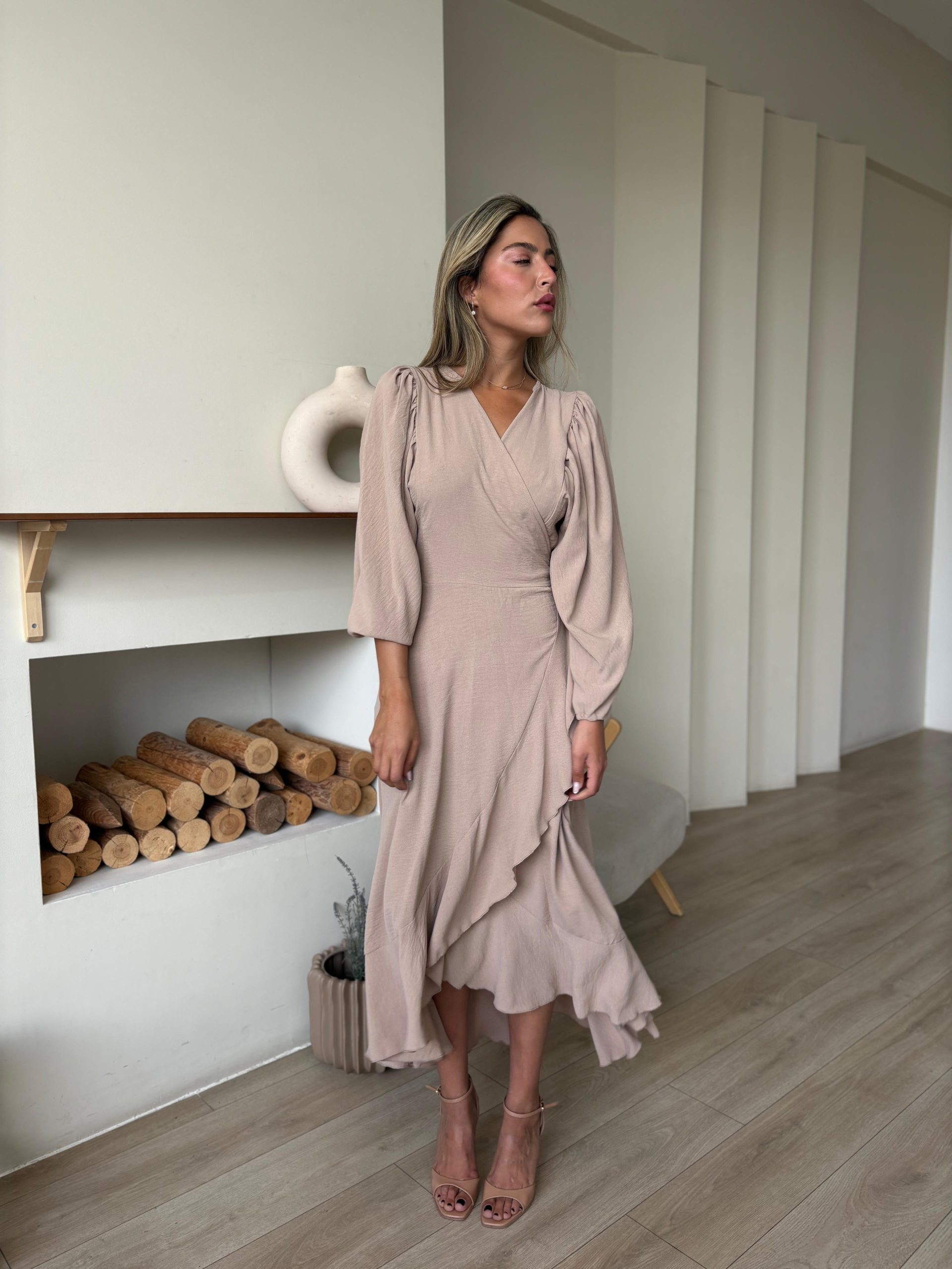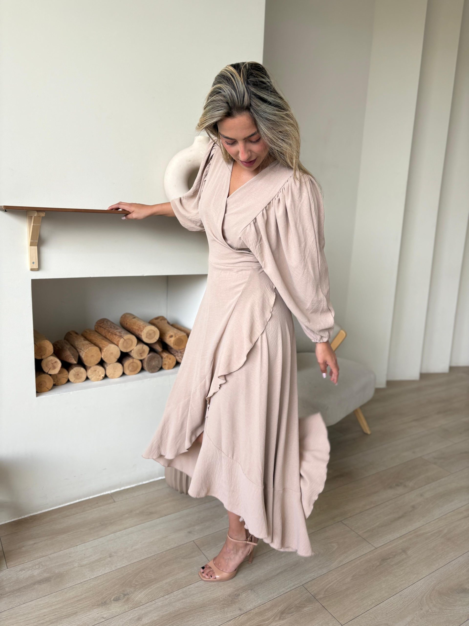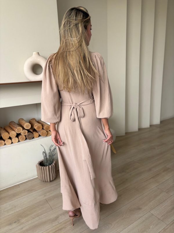 שמלת מעטפה בגזרת אובר סייז מבד אריג קיצי, שרוולים ארוכים רחבים, בגיזרת עטלף, כיווצים בתפר, כיווצים בכתפיים, סיומת גומי בשרוול, מלמלה לאורך השמלה, חגורה מובנת להידוק השמלה. (השמלה ניתנת ללבישה גם כעליונית). השמלה מגיעה במידות S/M/L/XL ומתאימה עד למידה 44-46.