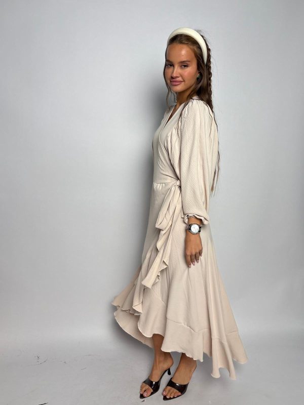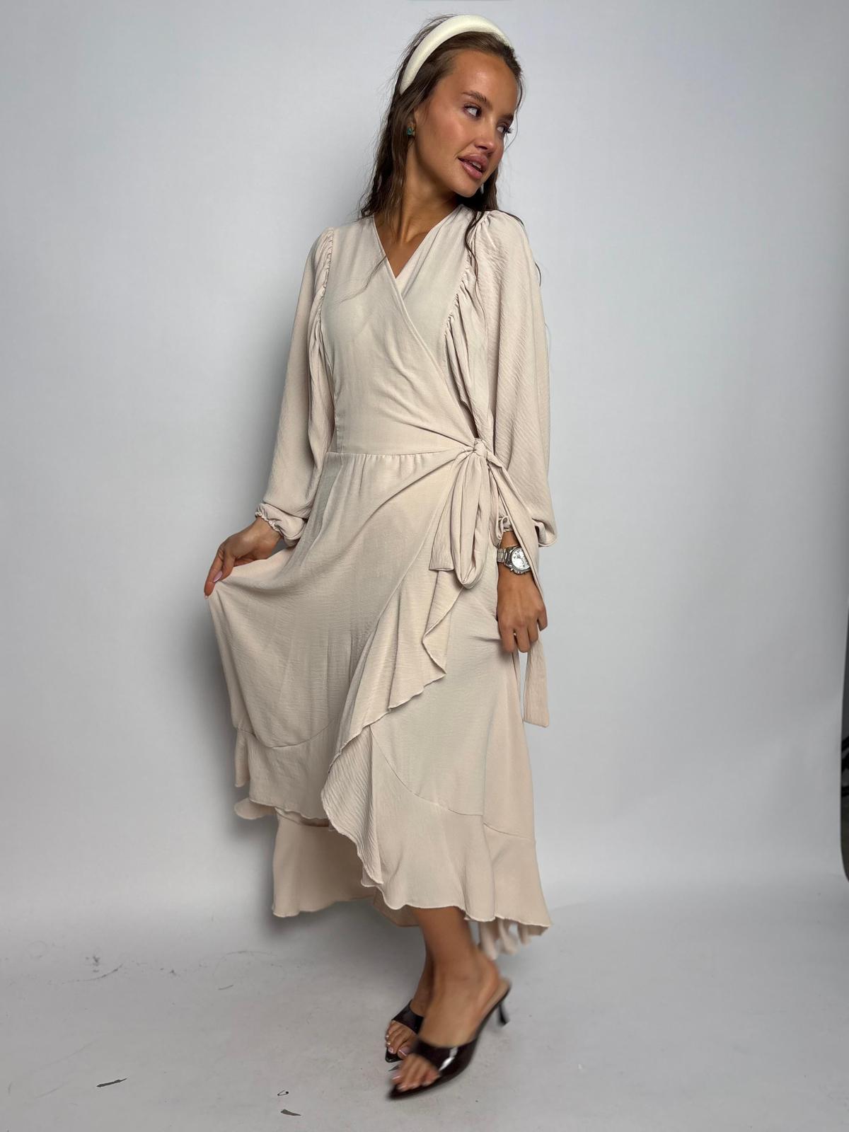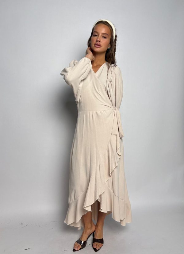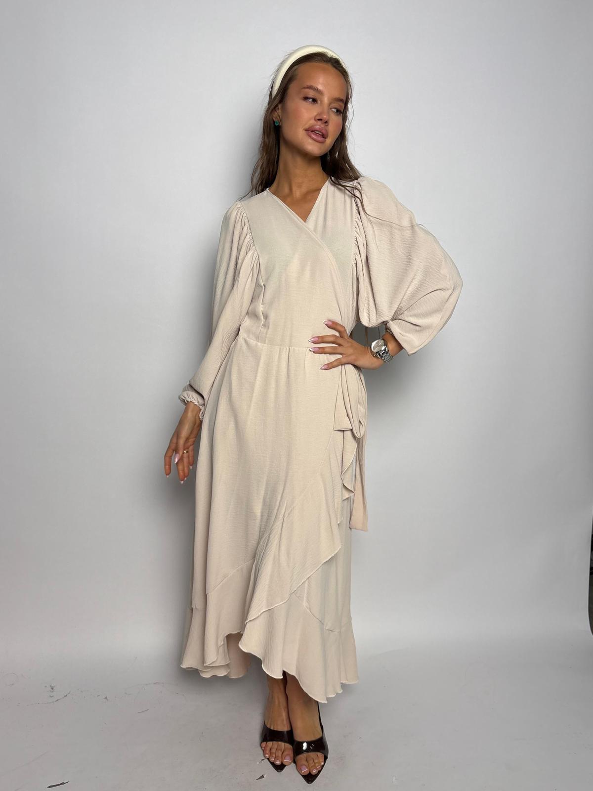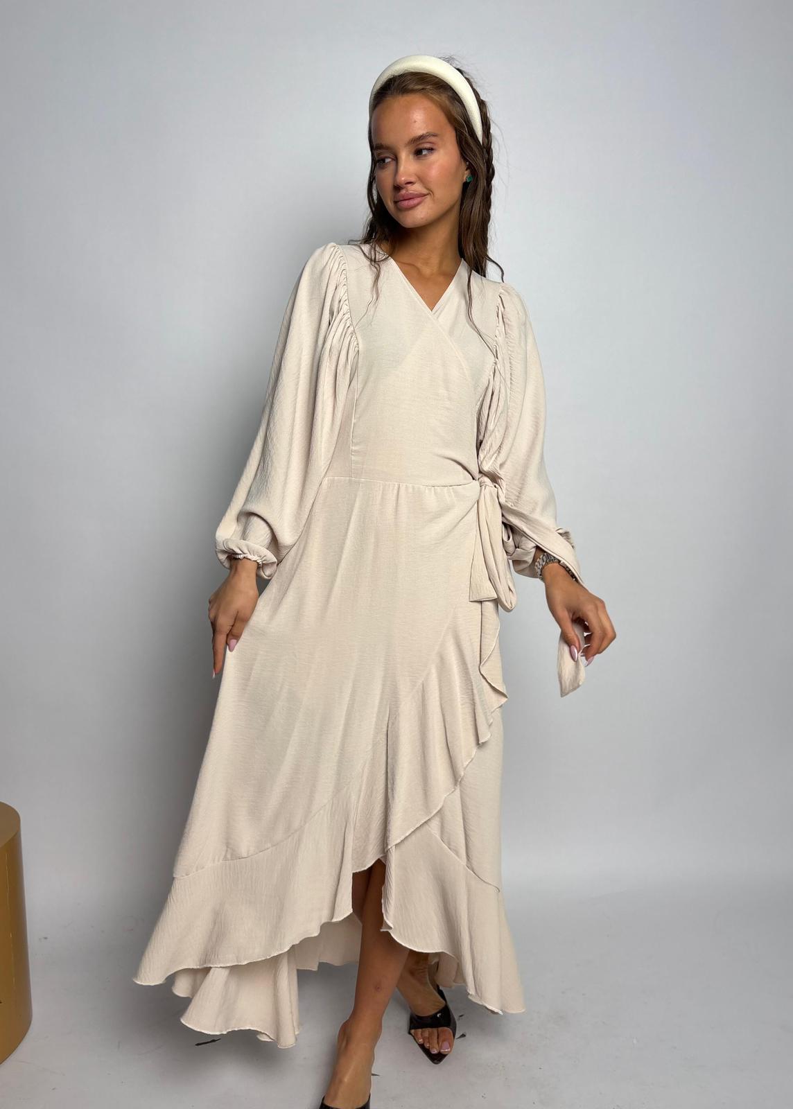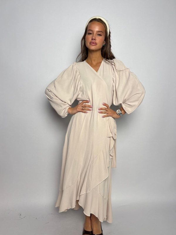 שמלת מעטפת צנועה בגזרת אובר סייז מבד אריג קיצי, שרוולים ארוכים רחבים, בגיזרת עטלף, כיווצים בתפר, כיווצים בכתפיים, סיומת גומי בשרוול, מלמלה לאורך השמלה, חגורה מובנת להידוק השמלה. (השמלה ניתנת ללבישה גם כעליונית). השמלה מגיעה במידות S/M/L/XL ומתאימה עד למידה 44-46.