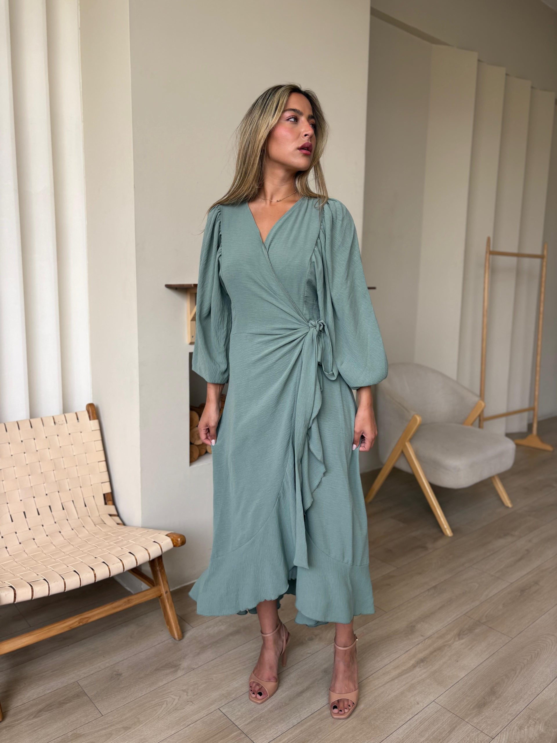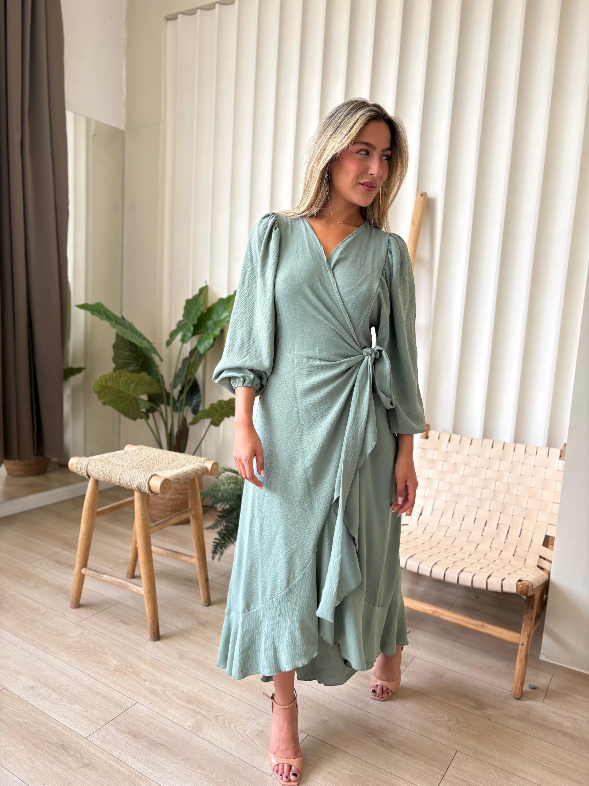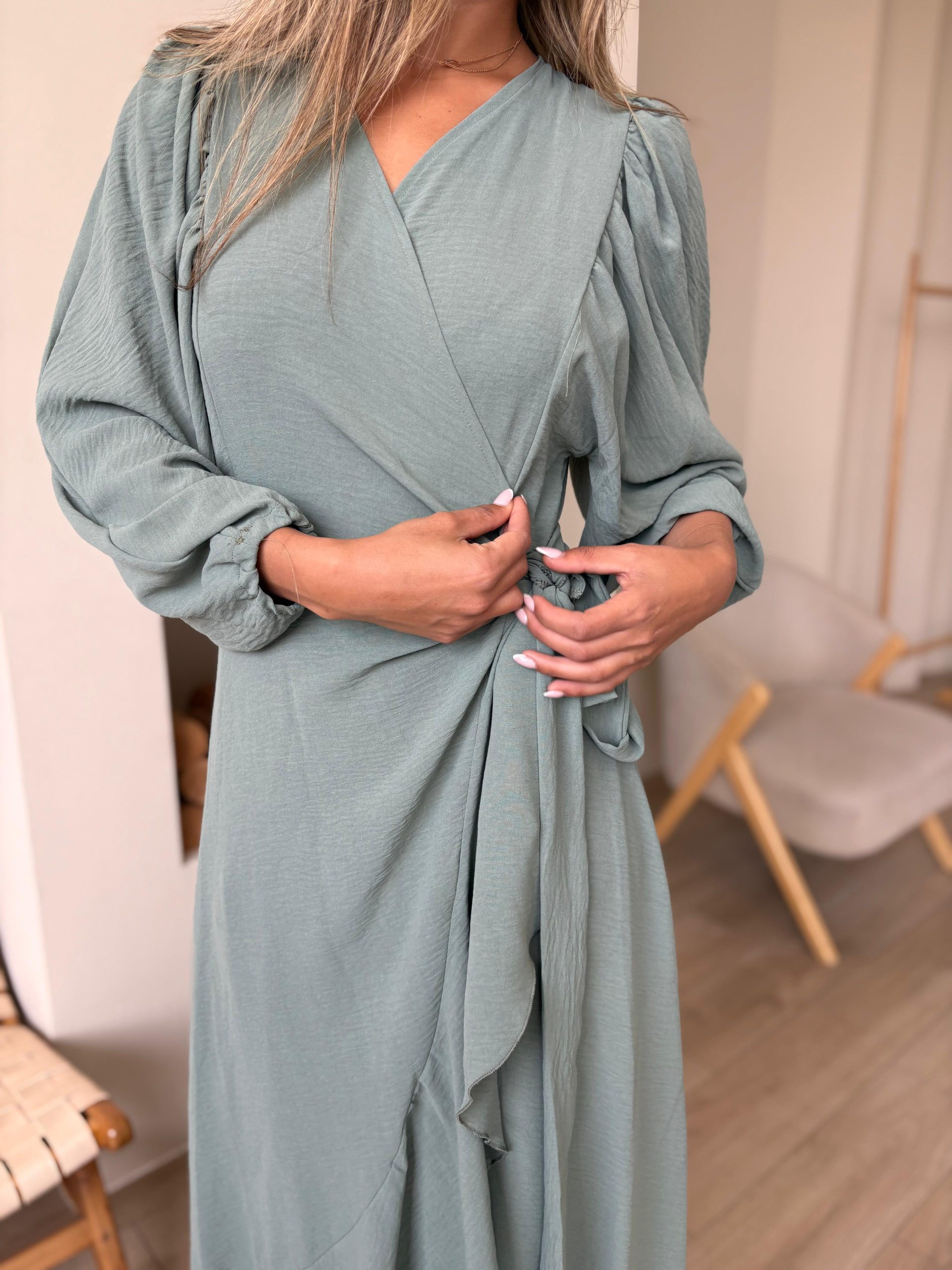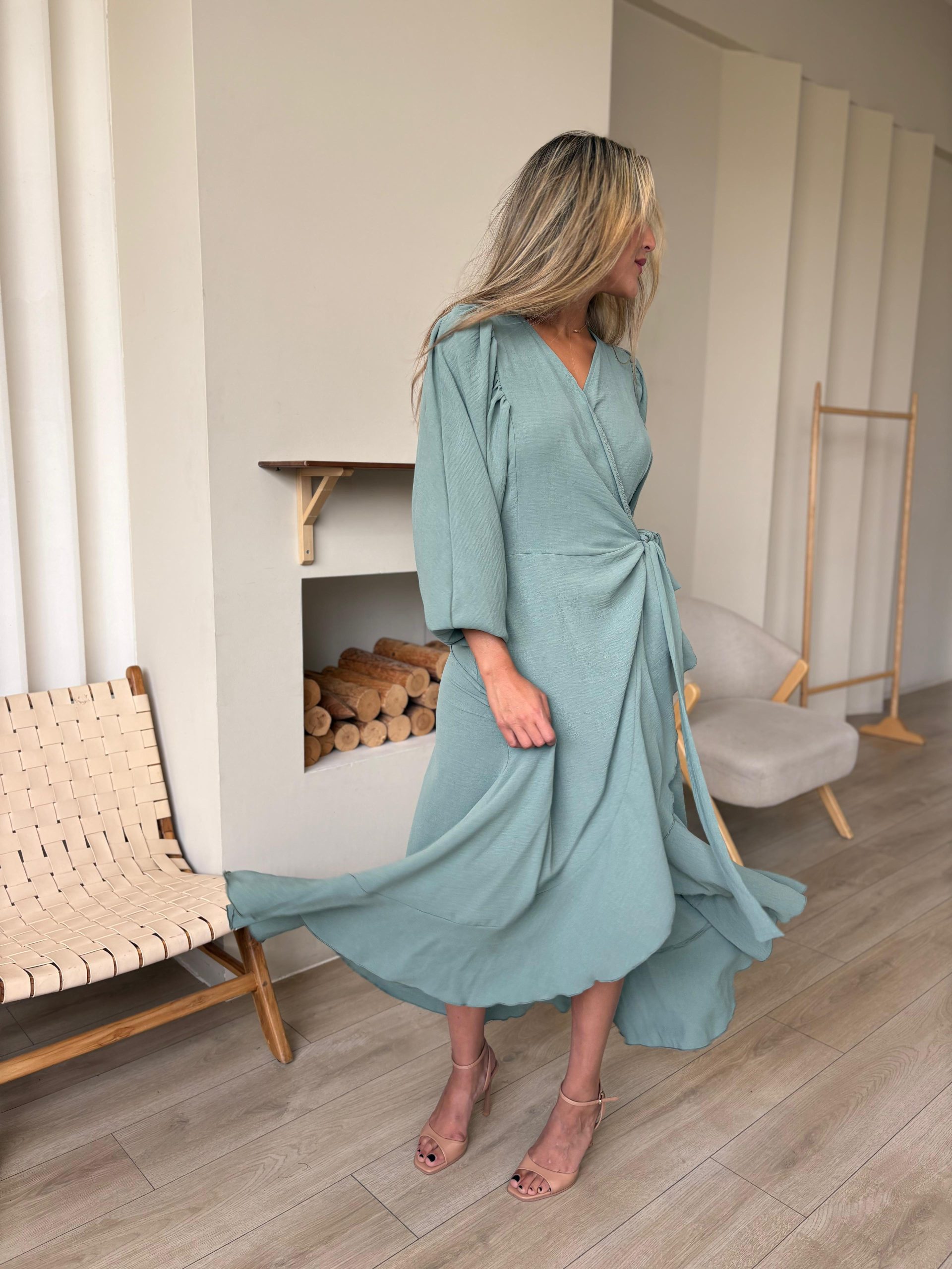 שמלת מעטפה בגזרת אובר סייז מבד אריג קיצי, שרוולים ארוכים רחבים, בגיזרת עטלף, כיווצים בתפר, כיווצים בכתפיים, סיומת גומי בשרוול, מלמלה לאורך השמלה, חגורה מובנת להידוק השמלה. (השמלה ניתנת ללבישה גם כעליונית). השמלה מגיעה במידות S/M/L/XL ומתאימה עד למידה 44-46.