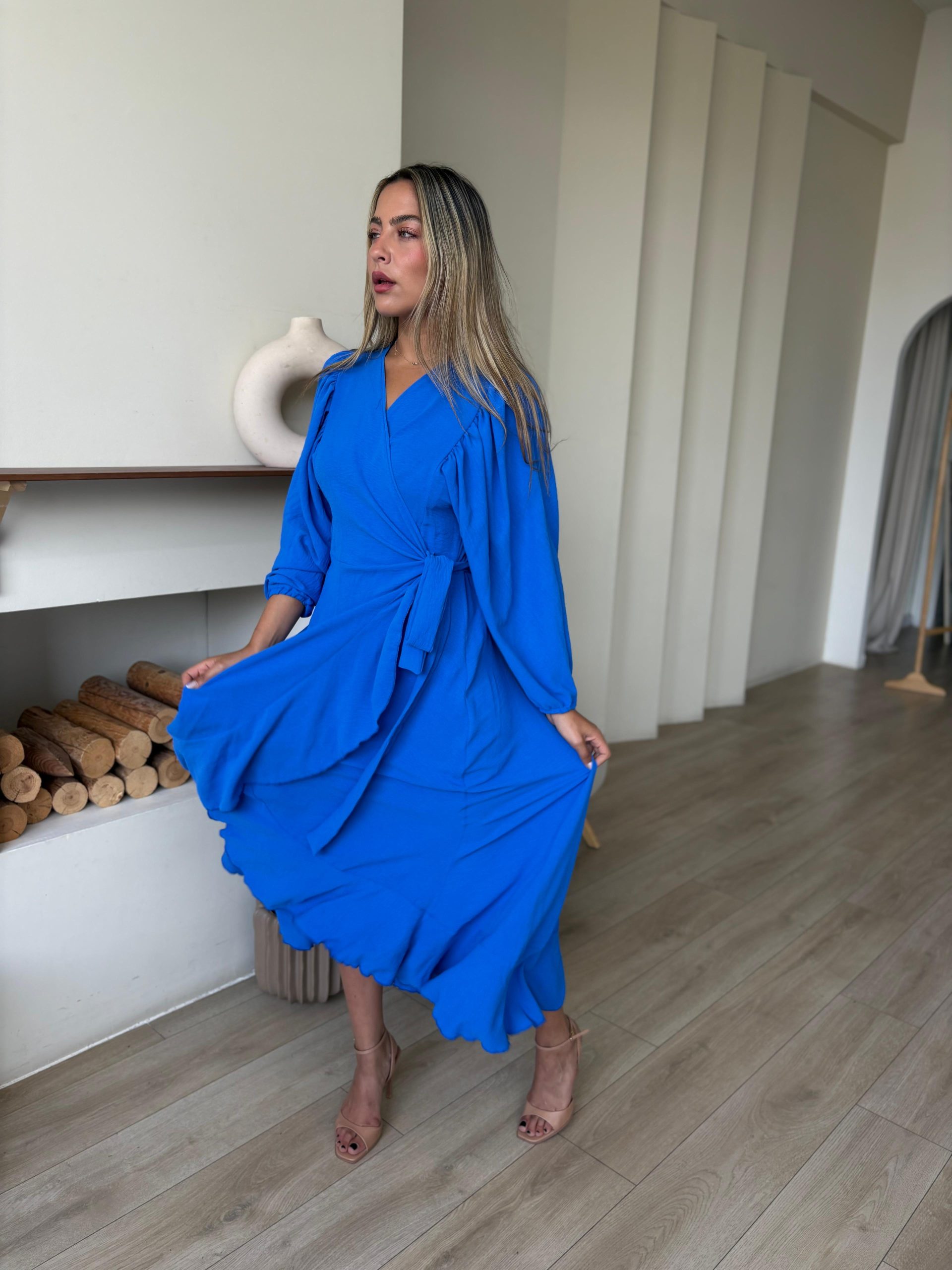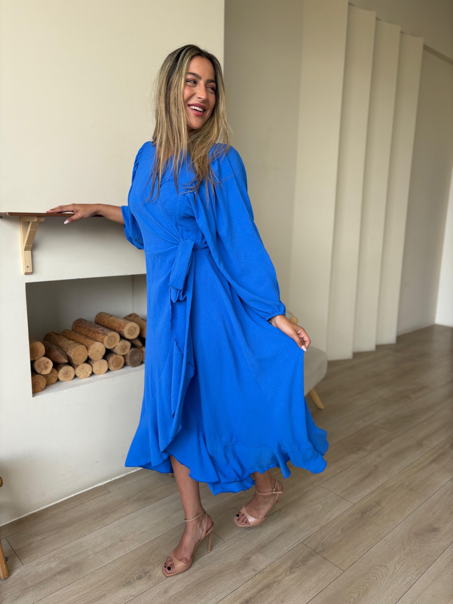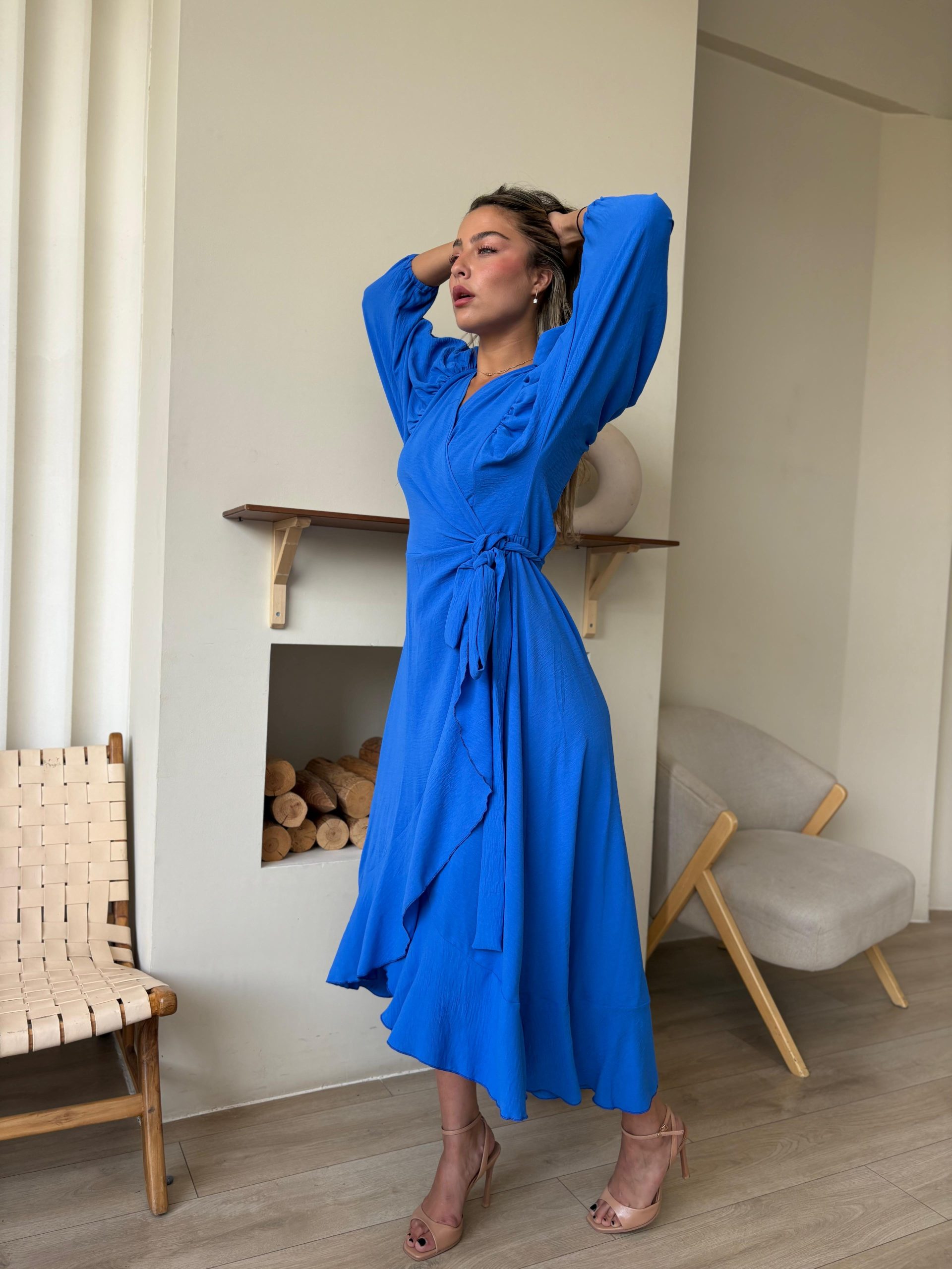 שמלת מעטפה בגזרת אובר סייז מבד אריג קיצי, שרוולים ארוכים רחבים, בגיזרת עטלף, כיווצים בתפר, כיווצים בכתפיים, סיומת גומי בשרוול, מלמלה לאורך השמלה, חגורה מובנת להידוק השמלה. (השמלה ניתנת ללבישה גם כעליונית). השמלה מגיעה במידות S/M/L/XL ומתאימה עד למידה 44-46.
