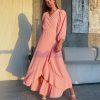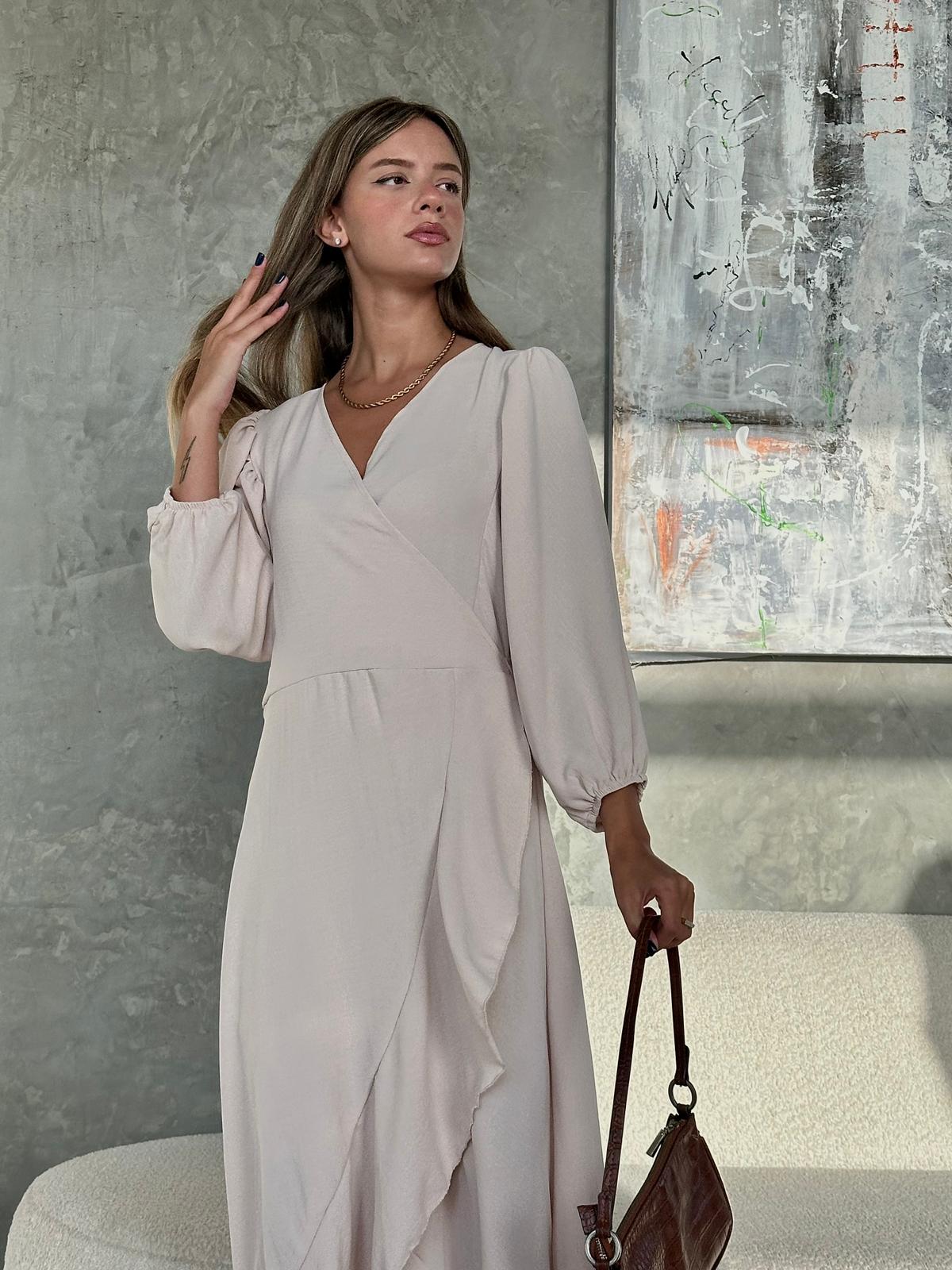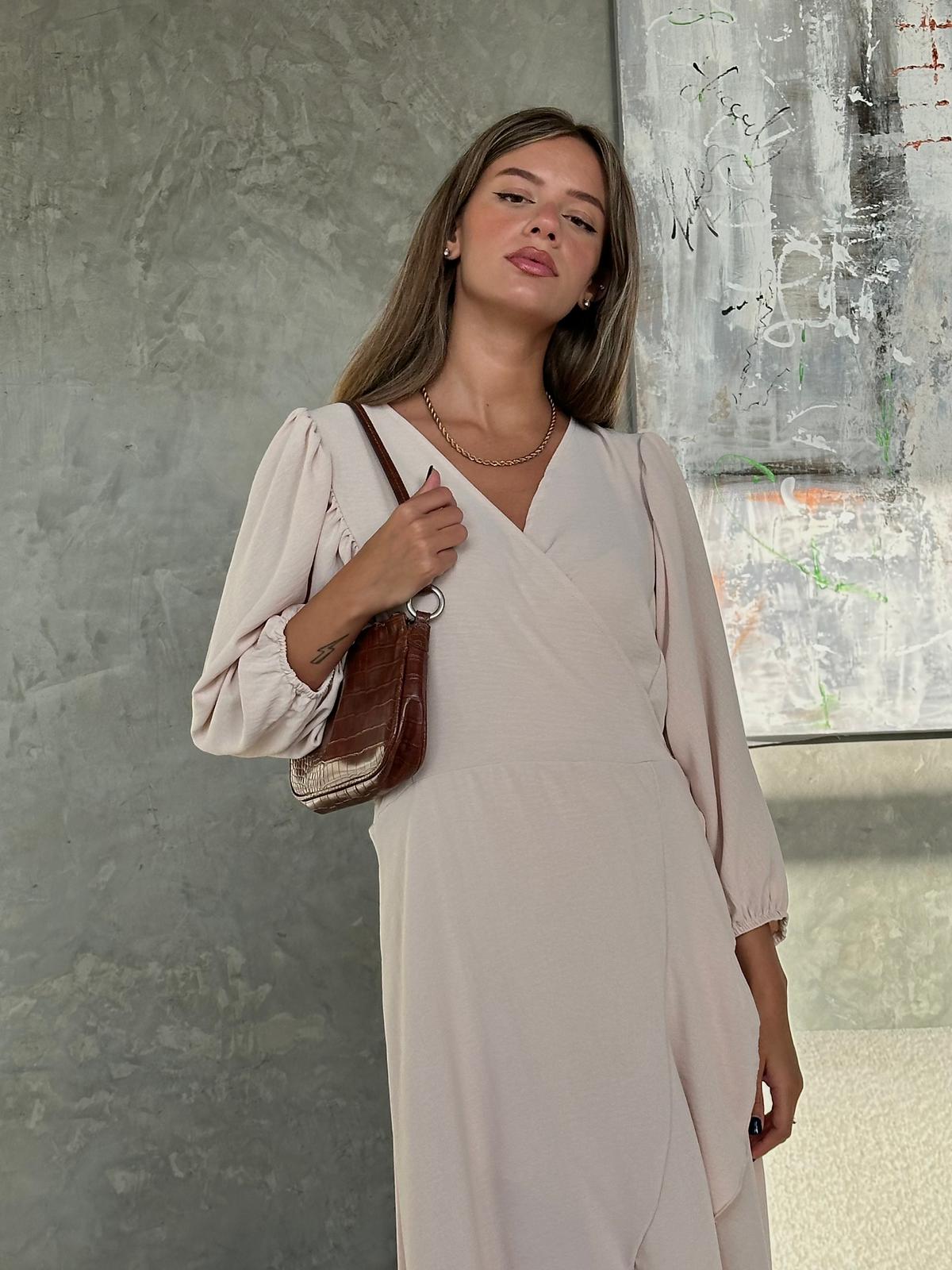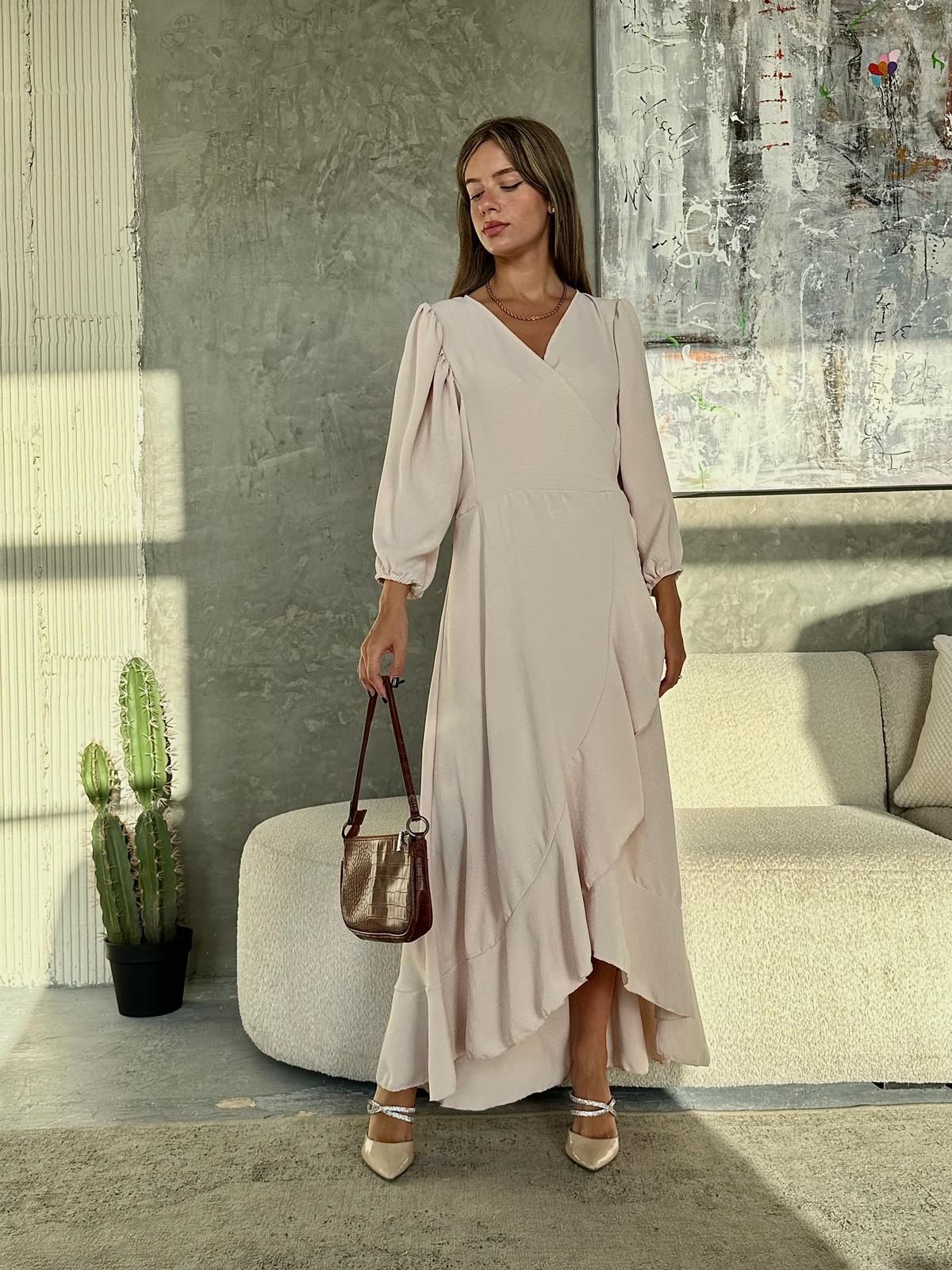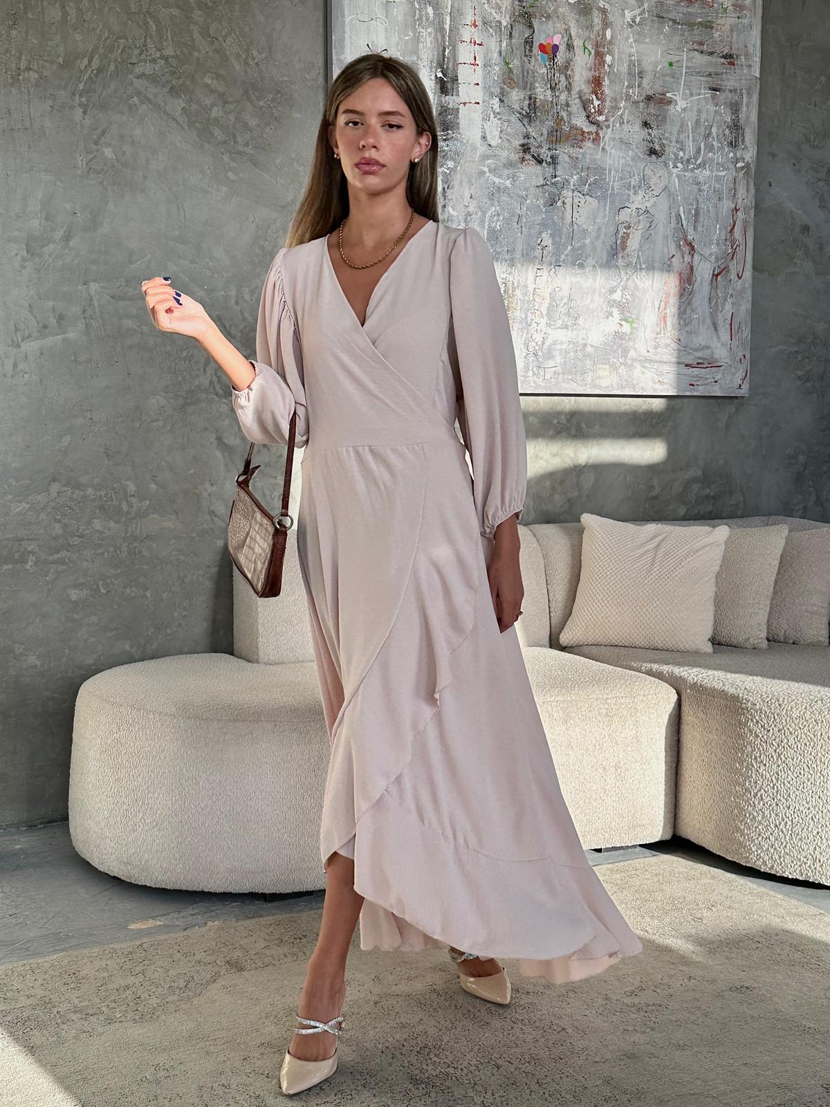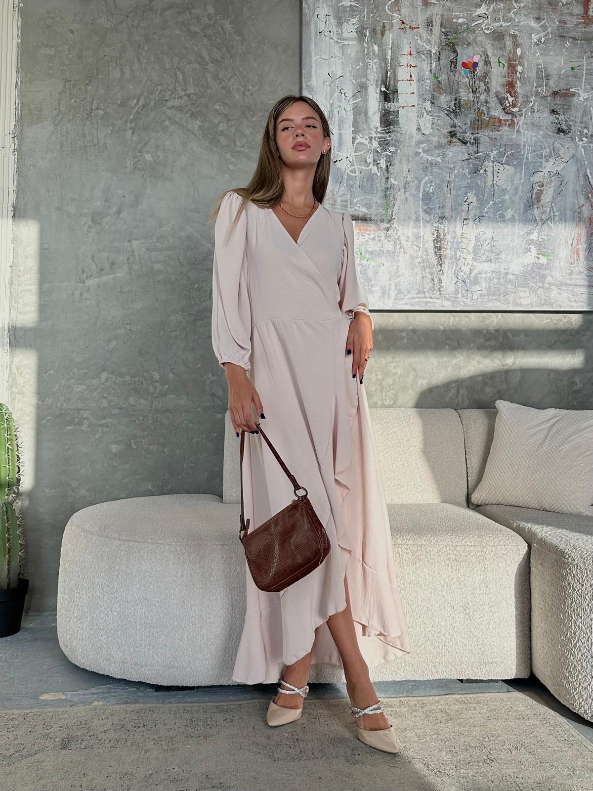 שמלת מעטפה בגזרת אובר סייז מבד אריג קיצי, שרוולי 3/4 רחבים, בגיזרת עטלף, כיווצים בתפר, כיווצים בכתפיים, סיומת גומי בשרוול, מלמלה לאורך השמלה, חגורה מובנת להידוק השמלה. (השמלה ניתנת ללבישה גם כעליונית). השמלה מגיעה במידות S/M/L/XL ומתאימה עד למידה 44-46.