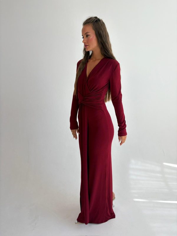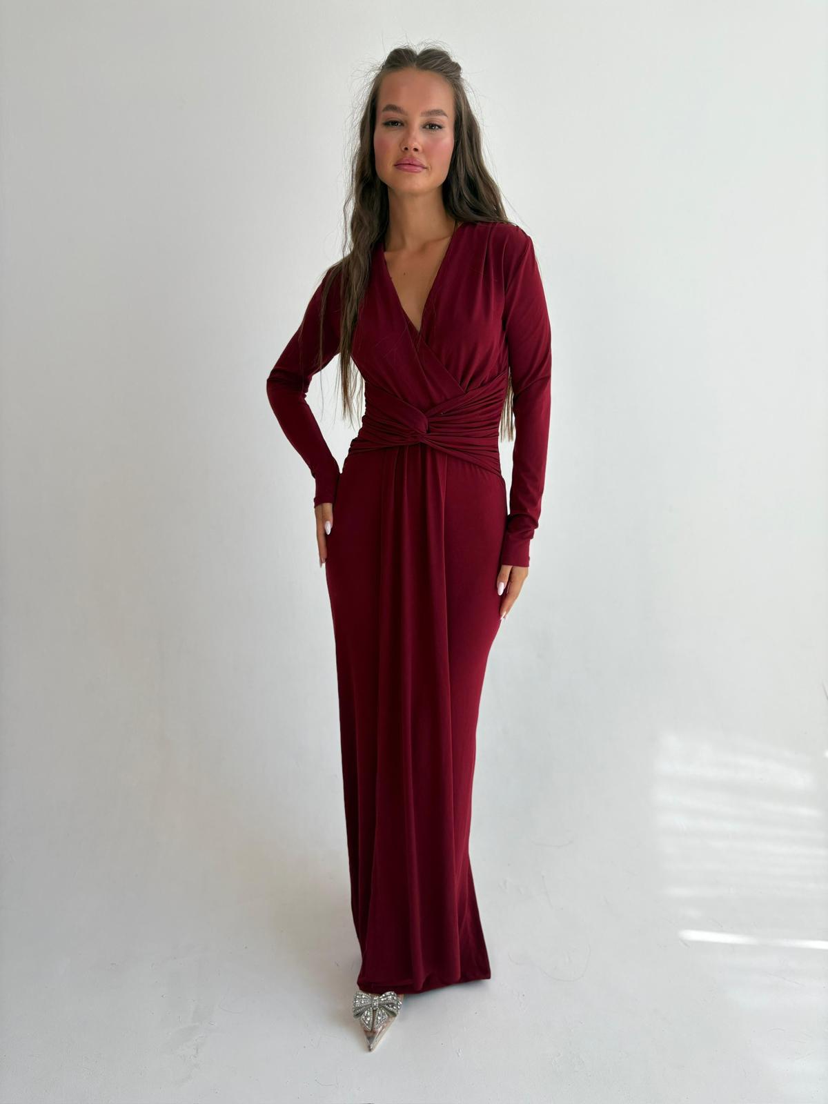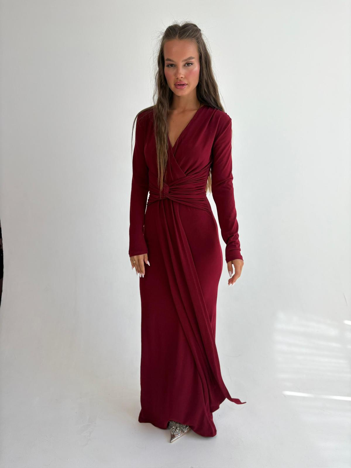 שמלת ערב מקסי מבד לייקרה, צווארון בצורת V, שרוולים ארוכים, שסע גב השמלה למטה, רוכסן ניסתר בגב השמלה. השמלה מגיעה במידות S/M/L/XL/XXL ומתאימה עד למידה 46-48/50.