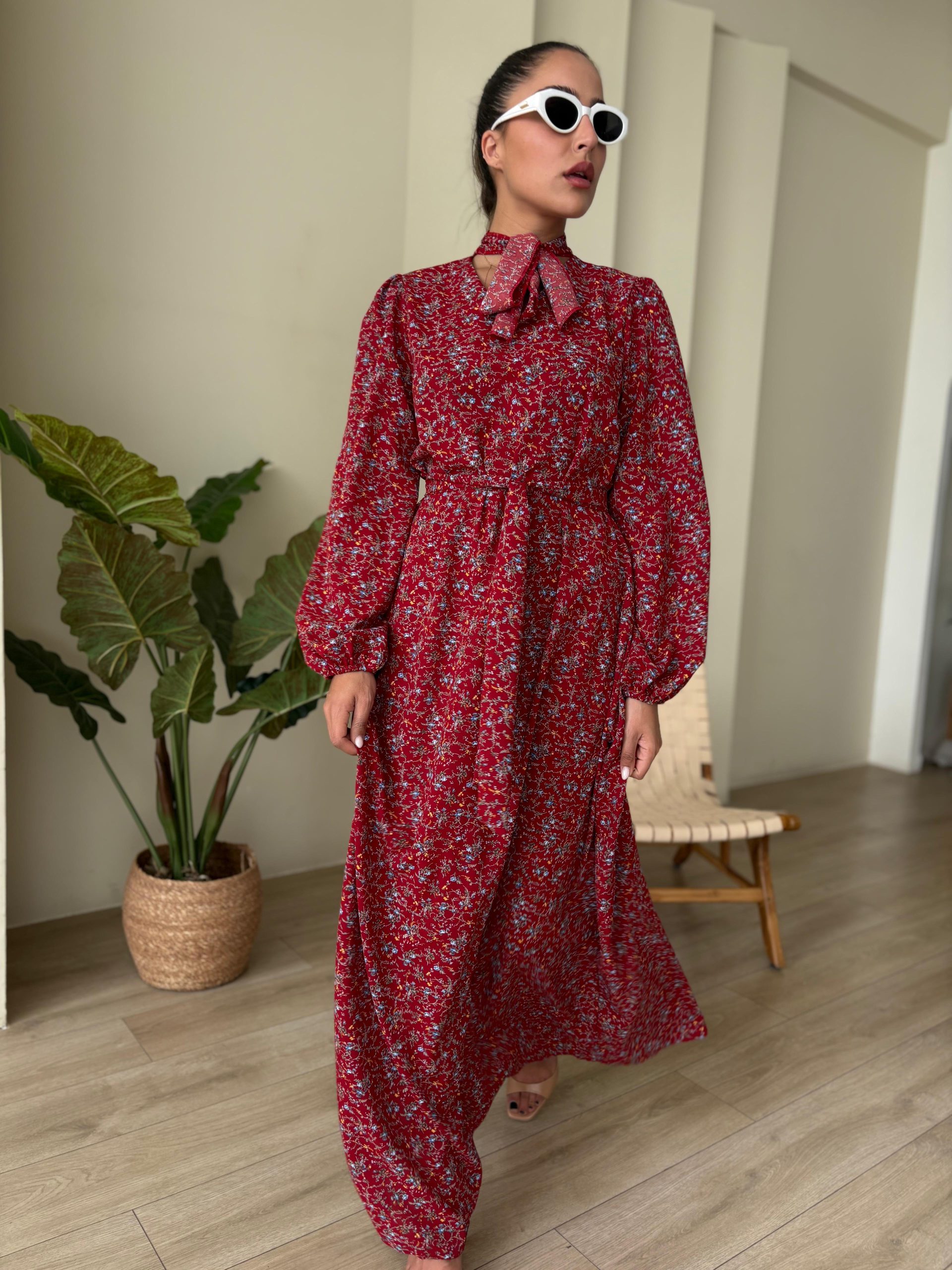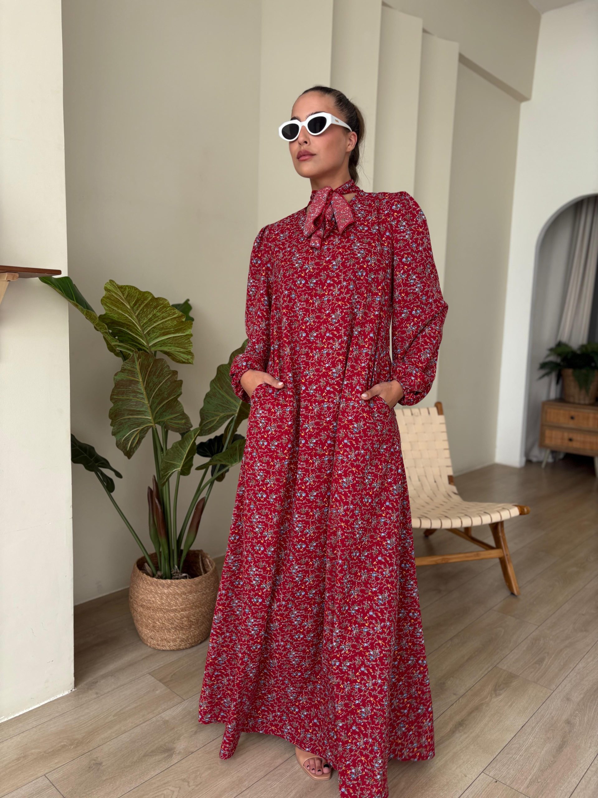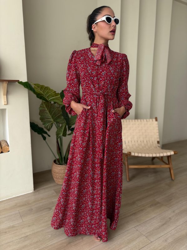 שמלת מקסי בגזרת A, צווארון בצורת V סגור, סרט עניבה מובנה בצווארון, שרוולים ארוכים עם סיומת גומי, כיסים ניסתרים, חגורה חיצונית תואמת להידוק השמלה/ סרט לשיער. השמלה מגיעה במידות S/M/L/XL ומתאימה עד למידה 44-46/48.