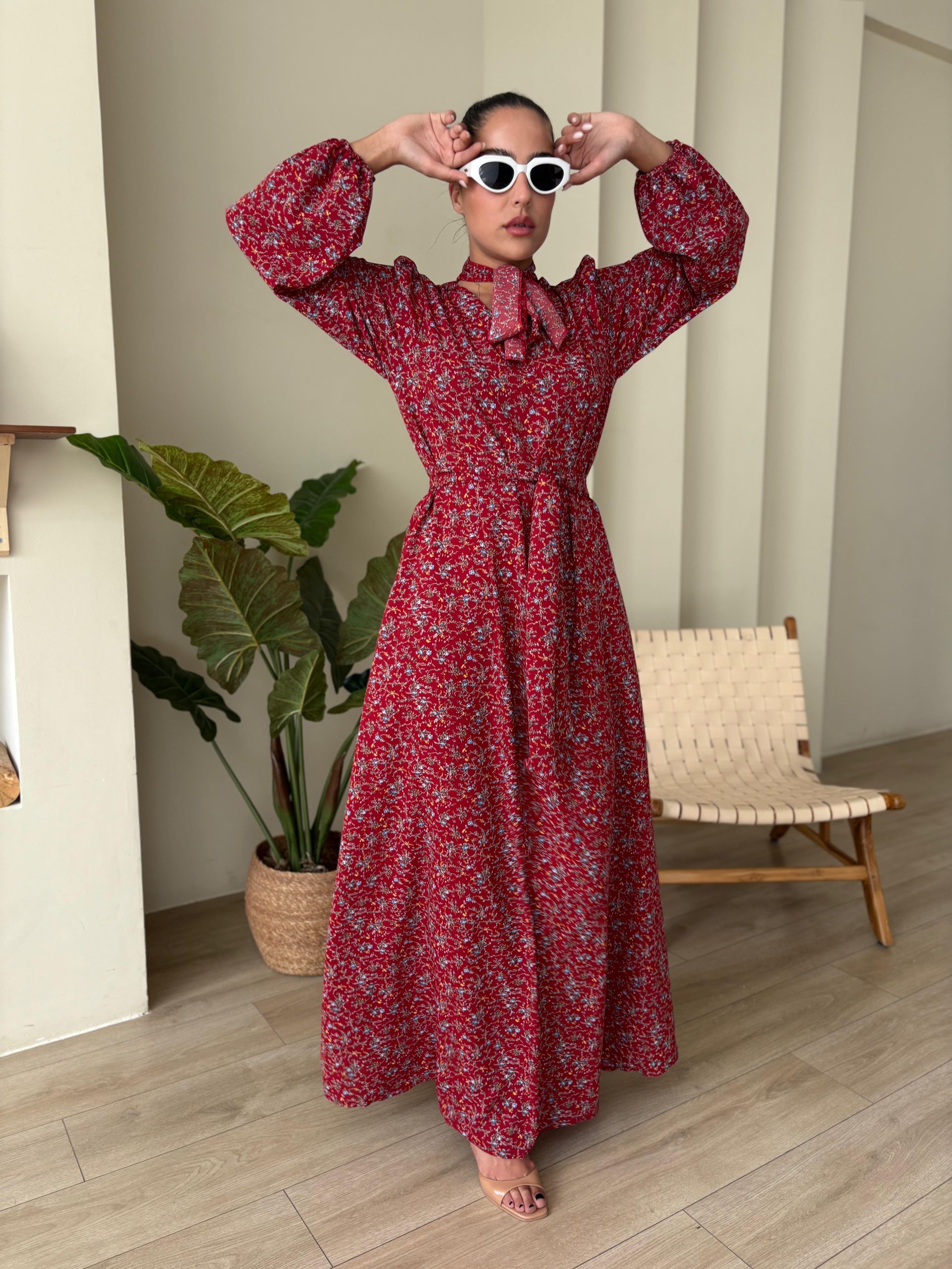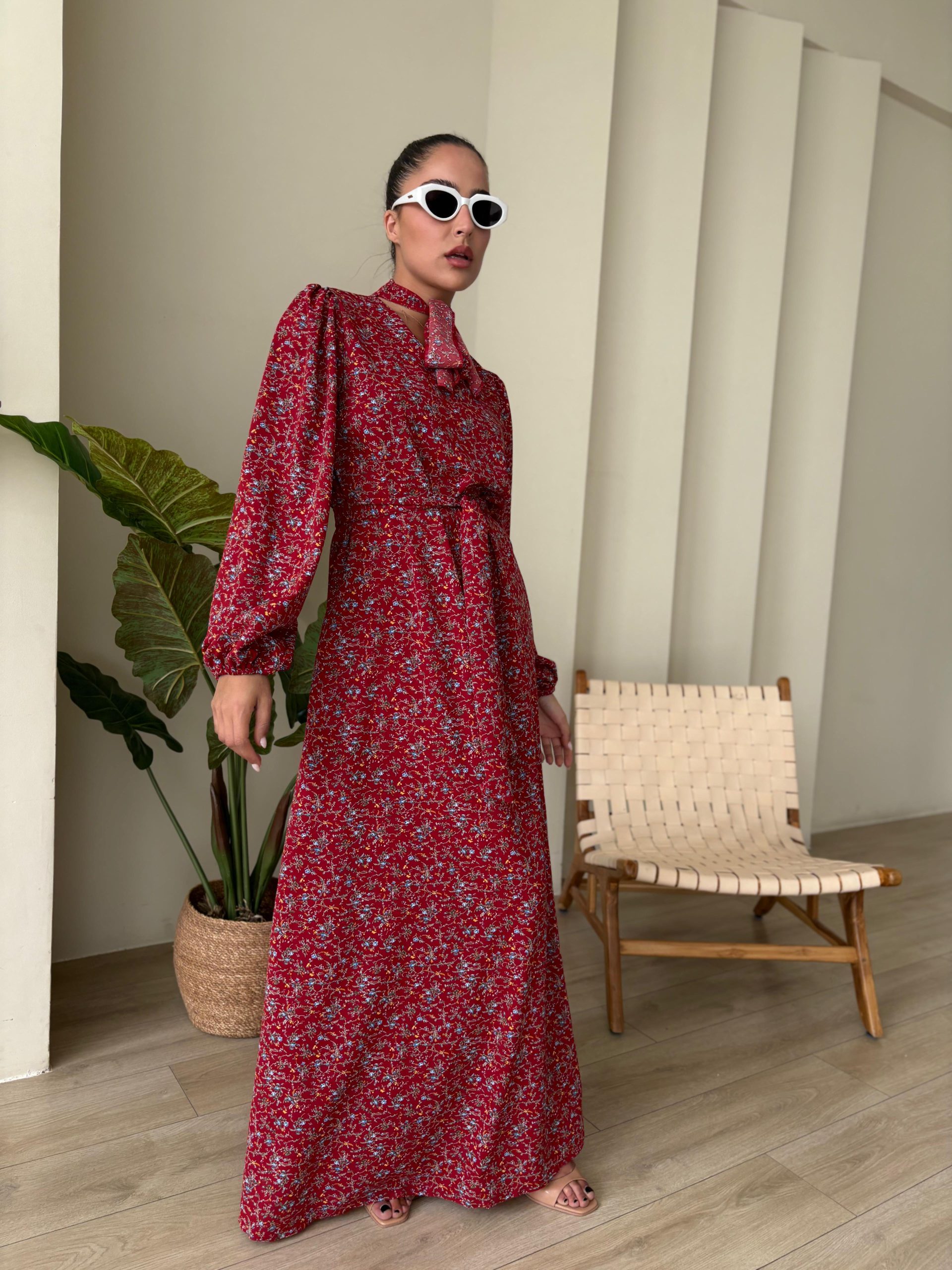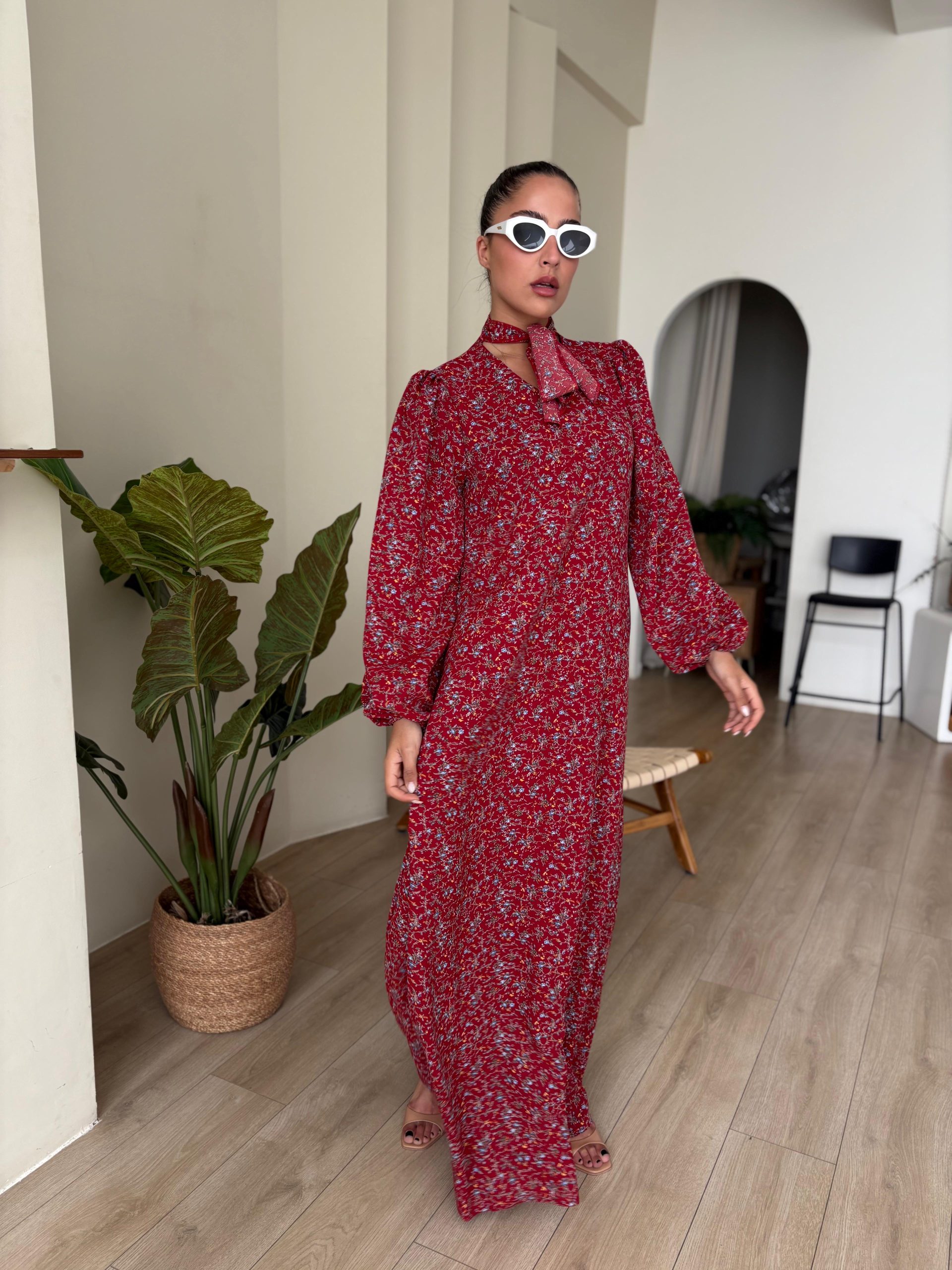 שמלת מקסי בגזרת A, צווארון בצורת V סגור, סרט עניבה מובנה בצווארון, שרוולים ארוכים עם סיומת גומי, כיסים ניסתרים, חגורה חיצונית תואמת להידוק השמלה/ סרט לשיער. השמלה מגיעה במידות S/M/L/XL ומתאימה עד למידה 44-46/48.