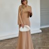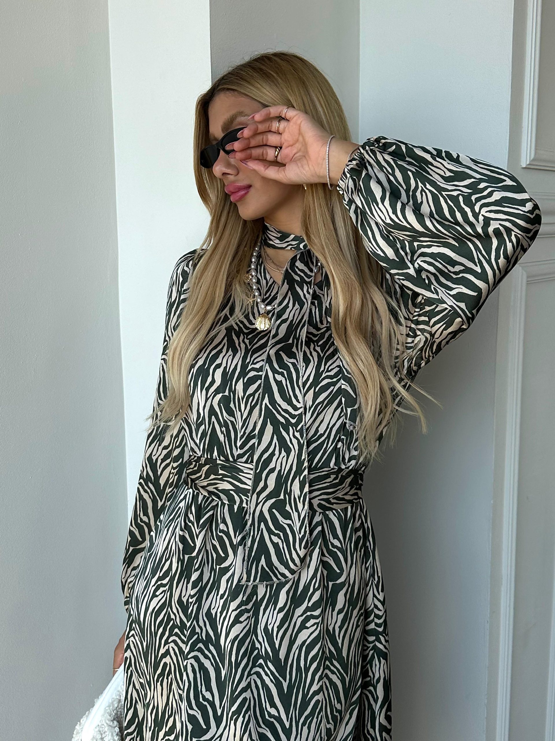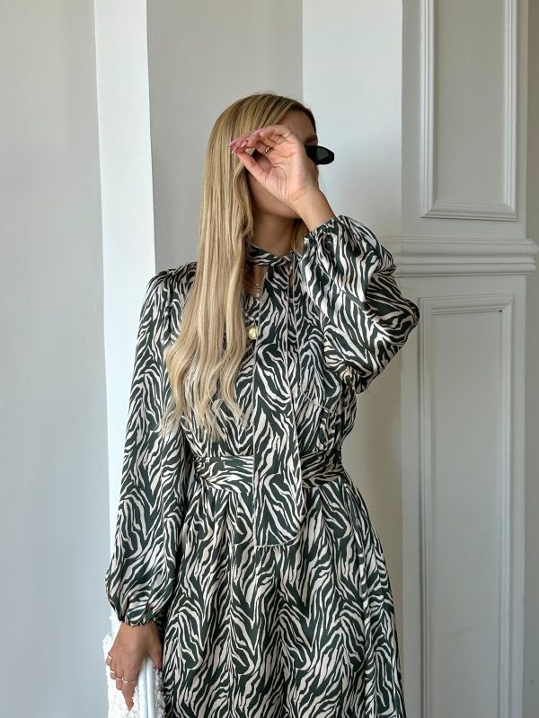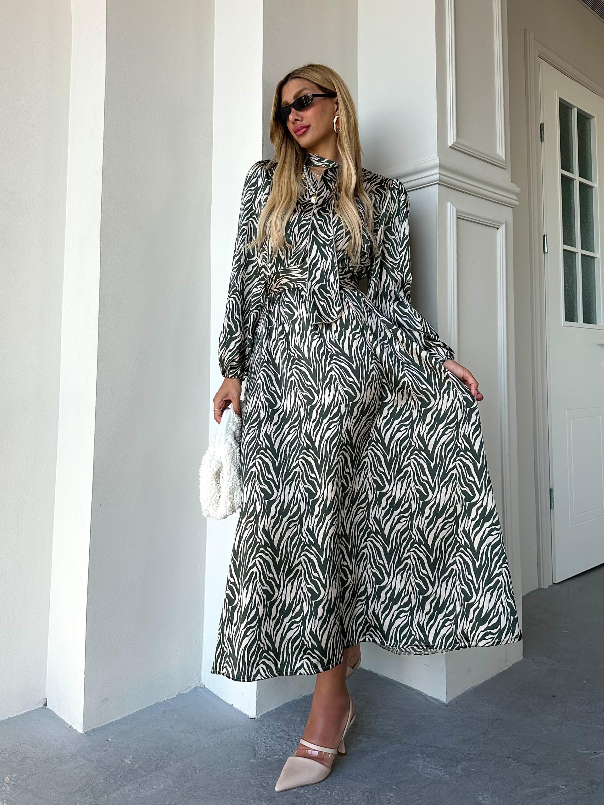 שמלת מקסי בגזרת A, צווארון בצורת V סגור, סרט עניבה מובנה בצווארון, שרוולים ארוכים עם סיומת גומי, כיסים ניסתרים, גומי פנימי במותן, חגורה חיצונית תואמת להידוק השמלה/ סרט לשיער. השמלה מגיעה במידות S/M/L/XL ומתאימה עד למידה 42-44/46.