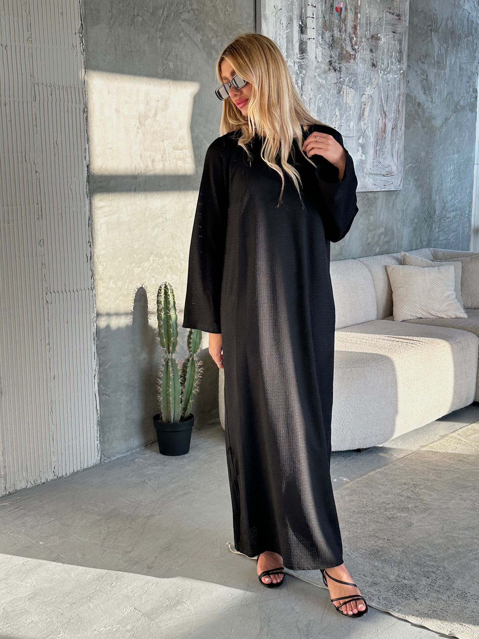 שמלת מקסי בגיזרת A מבד סריג לייקרה, צווארון עגול עם פתח וסגירת כפתור בגב, שרוולים ארוכים עם סיומת פעמון, פתח בצידי השמלה למטה, השמלה מגיעה עם ביטנה מובנת. השמלה מגיעה במידות S/M/L/XL/XXL ומתאימה עד למידה 44-46/48.