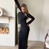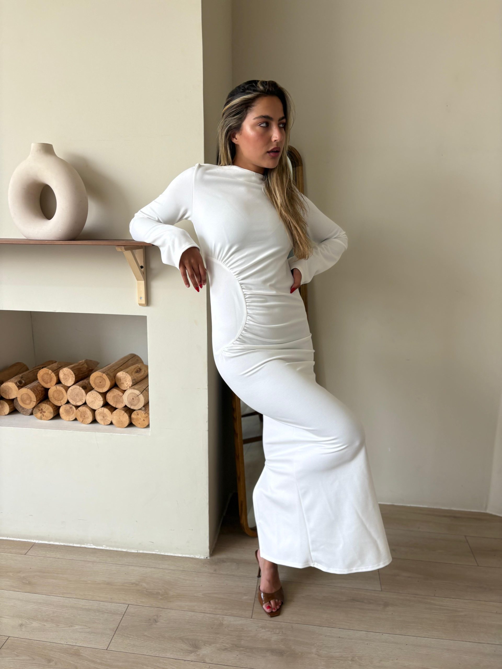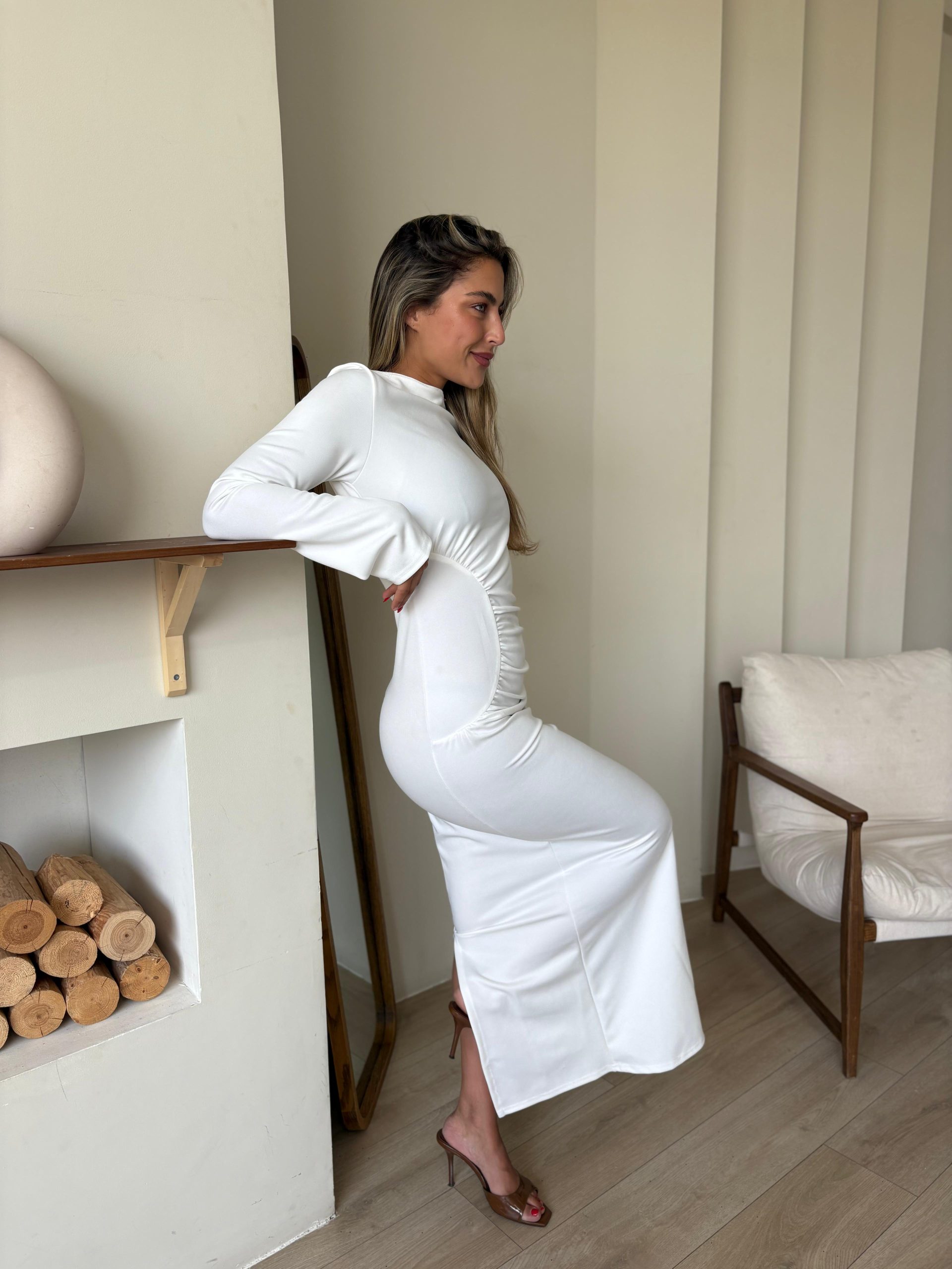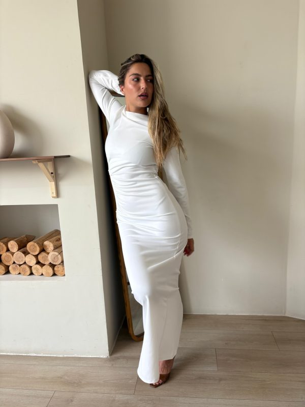 שמלת ערב מקסי מבד לייקרה מחטב, צווארון עגול, שרוולים ארוכים, רוכסן ניסתר בגב השמלה, כיווצים בצורת חצי עיגול במותן השמלה. השמלה מגיעה במידות S/M/L/XL/XXL ומתאימה עד למידה 44-46/48.