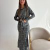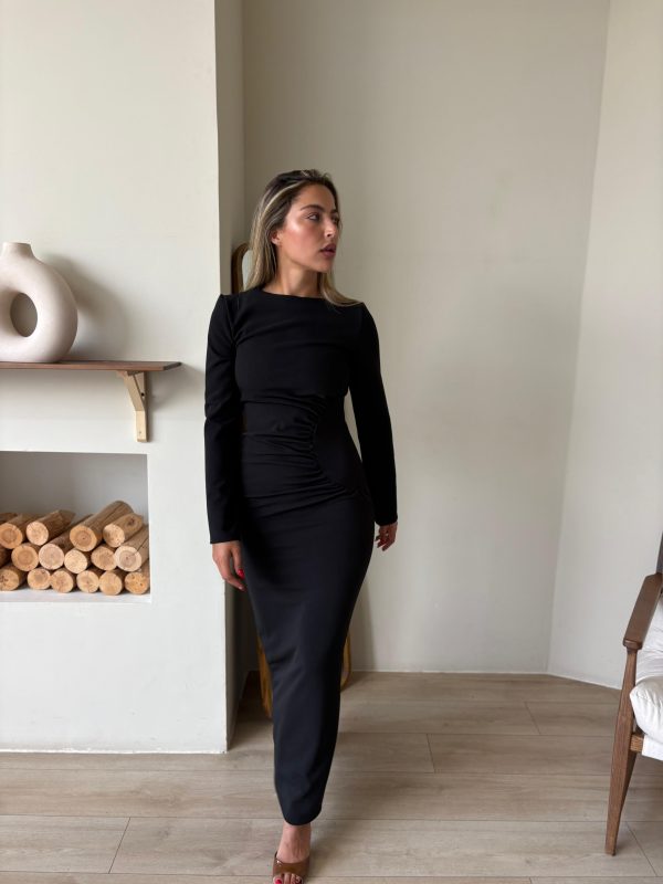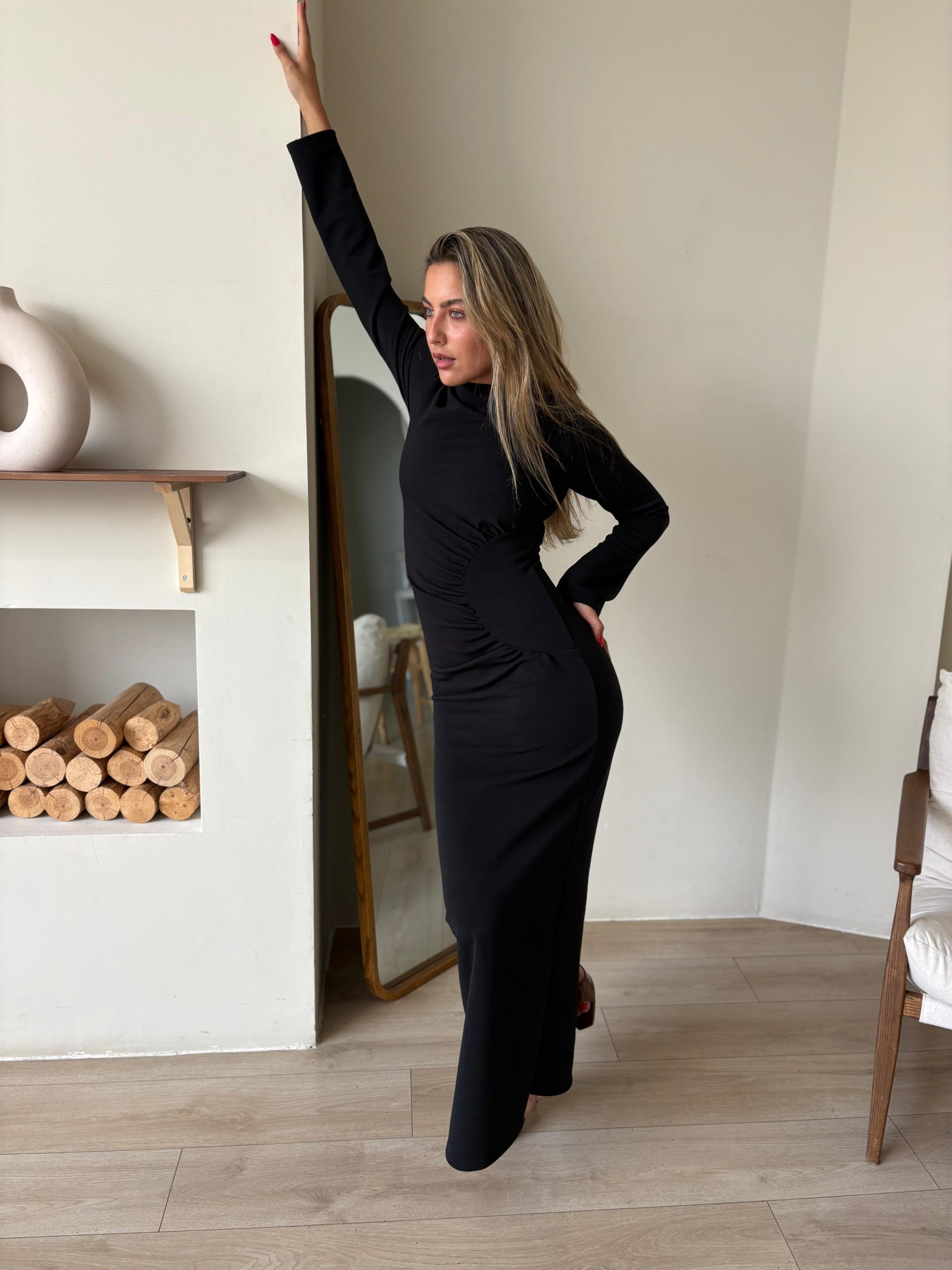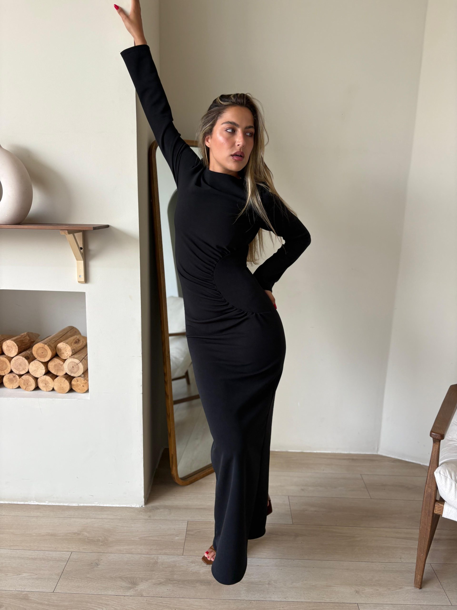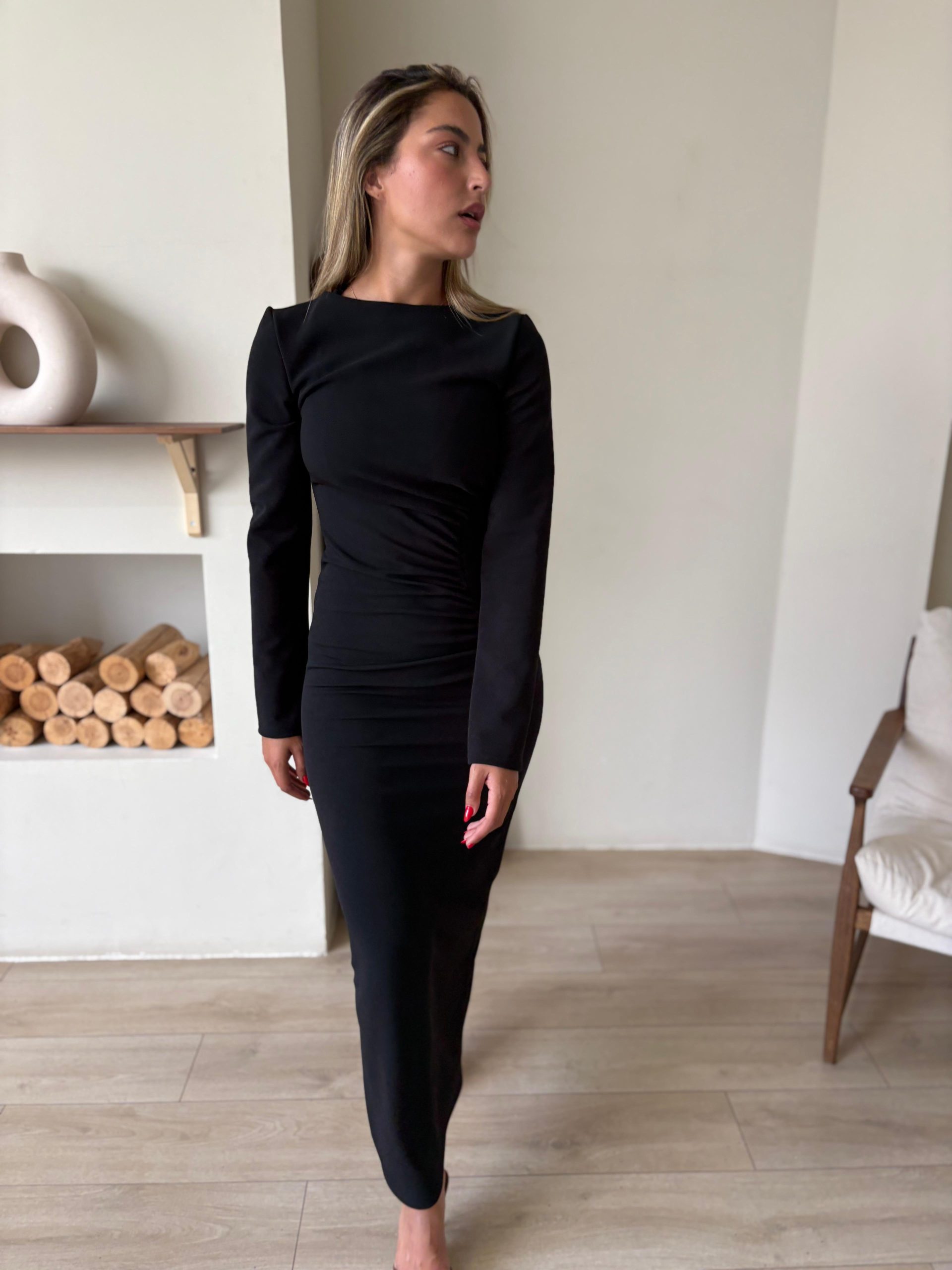 שמלת ערב מקסי מבד לייקרה מחטב, צווארון עגול, שרוולים ארוכים, רוכסן ניסתר בגב השמלה, כיווצים בצורת חצי עיגול במותן השמלה. השמלה מגיעה במידות S/M/L/XL/XXL ומתאימה עד למידה 44-46/48.