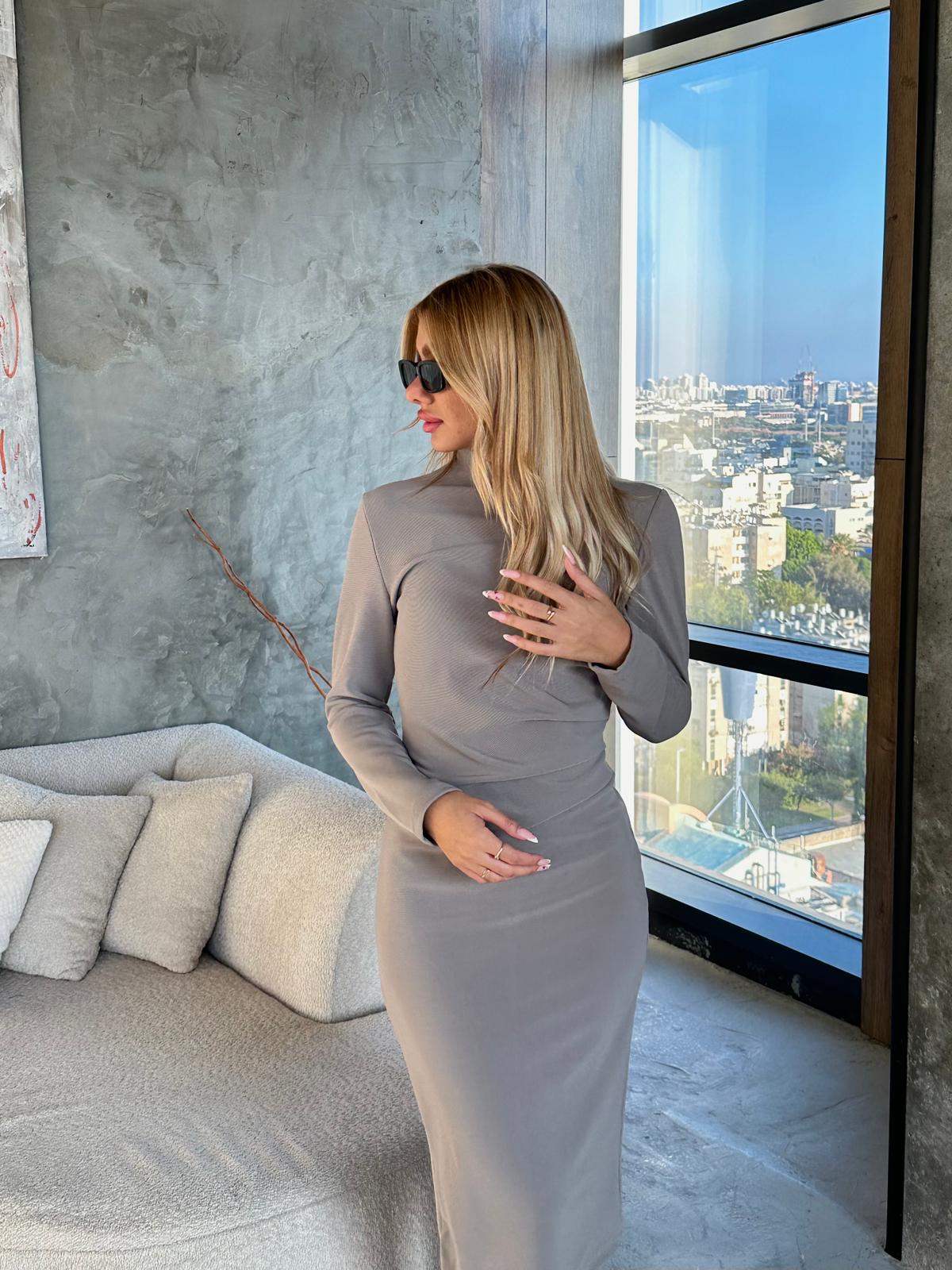 שמלת ערב בגיזרה צמודה מבד לייקרה מחטב, צווארון צף עם פתח, שרוולים ארוכים, כיווצים בצד השמלה, רוכסן ניסתר בגב השמלה. השמלה מגיעה במידות S/M/L/XL/XXL ומתאימה עד למידה 46/48.