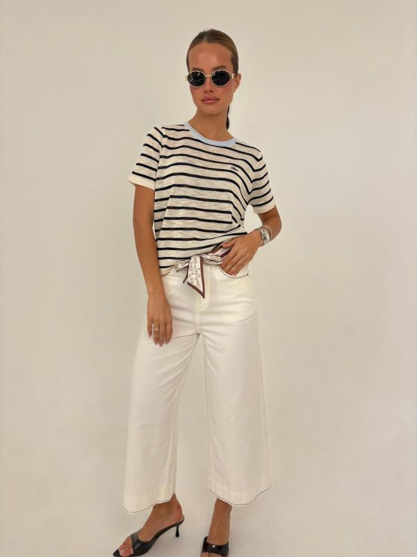 מכנס גי'נס בגיזרה גבוהה באורך 7/8, תיפורים בצבע חום מנוגד בכיסים ובמכפלת המכנס למטה, רוכסן קידמי וכפתור בודד לסגירה, שילוב של חגורת בנדנה מבד סאטן מודפס. החליפה מגיעה במידות M/L/XL ומתאימה עד למידה 42-44.