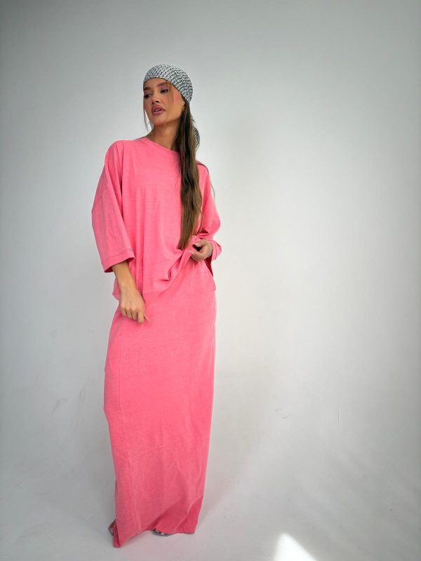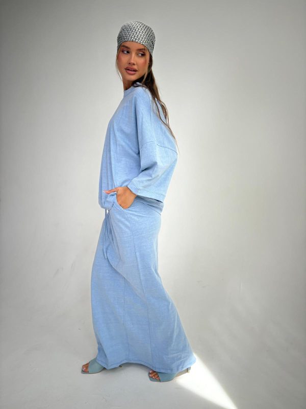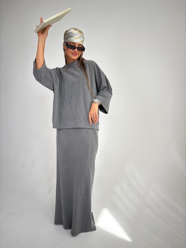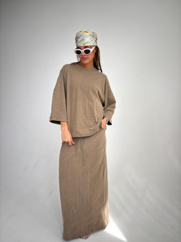חליפת חצאית מבד ספורט לייקרה, חולצה בגיזרת אובר סייז עם ביטנה, שרוולים באורך 3/4, רוכסן קידמי, שרוך תואם בצווארון, חצאית ישרה באורך מקסי, גומי במותן החצאית עם שרוך פנימי תואם, כיסים בצידי החצאית. החליפה מגיעה במידות S/M/L ומתאימה עד למידה 42-44/46.